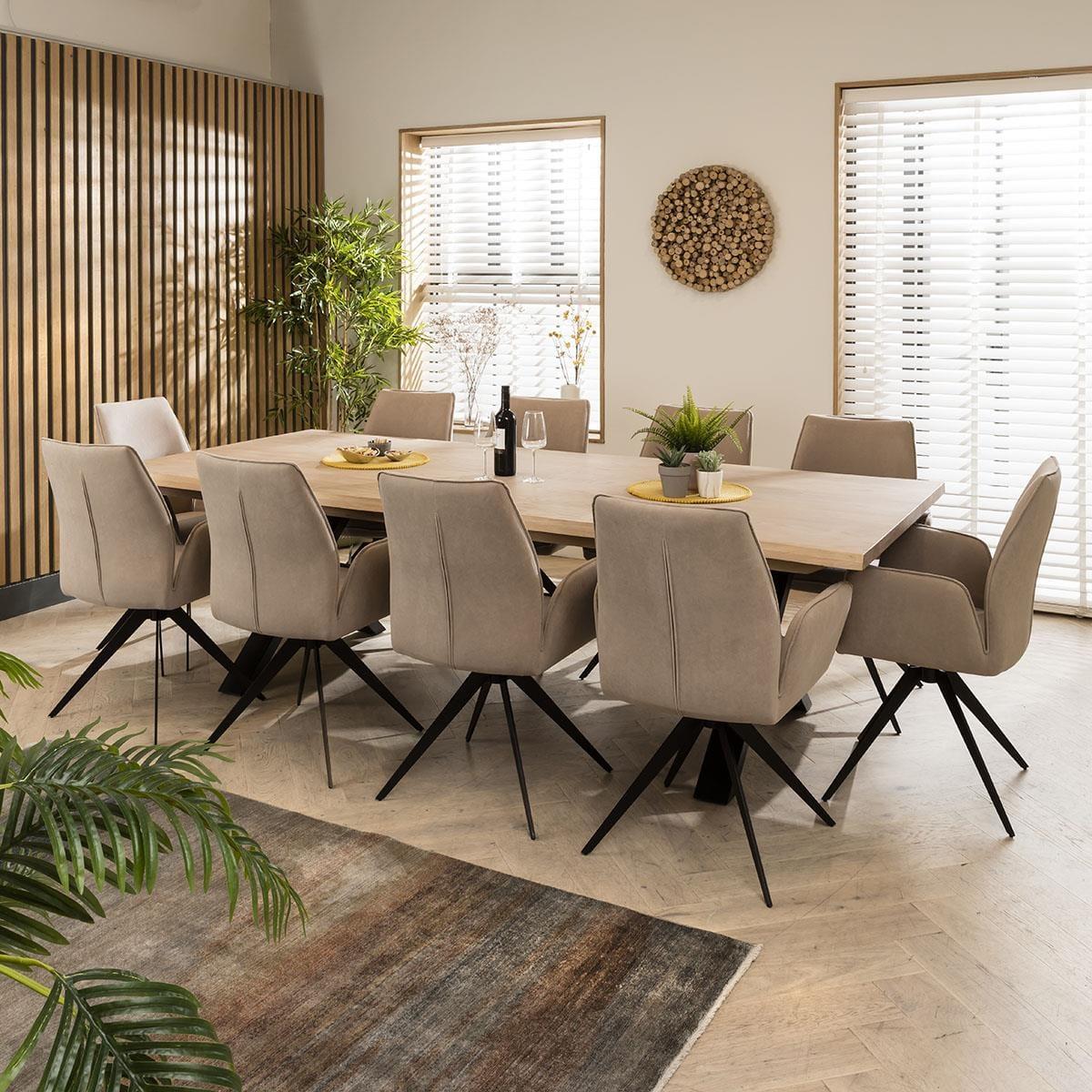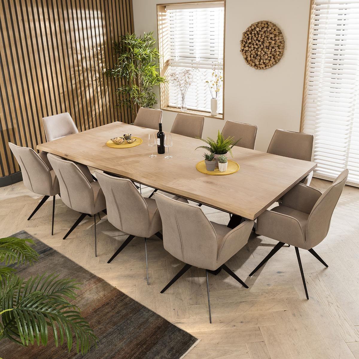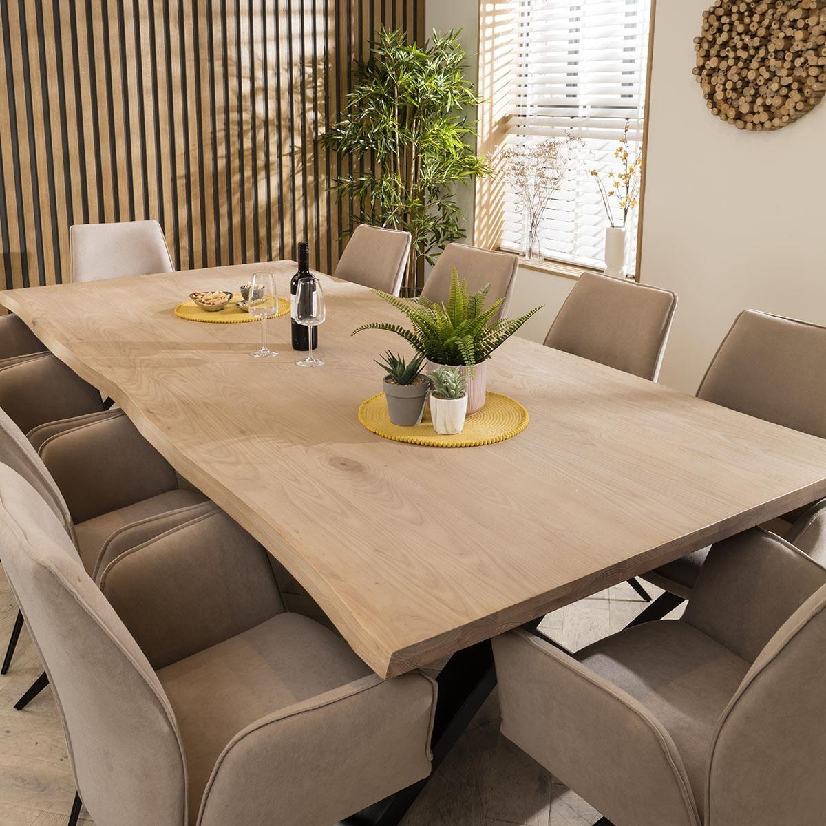 Captivate your guests with Nova 10 seater dining set, featuring the contemporary 260cm Taurus live edge solid wooden 10 seater dining table with a natural finish and ten modern Nova carver dining chairs. You'll be dining in comfort thanks to the soft-touch mink velvet dining chairs with arms and swivel bases. The Taurus dining table seamlessly blends rustic design with contemporary style in this 10 seater dining set. This large wooden dining table is 260cm, providing ample space for 10 people. Black metal X legs support the tabletop which is crafted from ash wood, with a natural finish and a live edge that showcases the table's inherent beauty. For contemporary elegance and comfort, the 10 Nova dining chairs in this set are crafted to perfection. The chairs boast a sleek and innovative design, wrapped in an elegant mink velvet fabric. With its unique carver style featuring comfortable arms and metal swivel base, this chair is a true testament to modern luxury. This 10 seater dining set combines modern Nova chairs with the stunning Taurus table. Whether you love the Nova chairs and would like to purchase them individually, or you think the Taurus table would complete your interior scheme better with another chair, you can easily mix and match our modern dining tables and chairs to curate something truly unique. Table Size W260cm D120cm H76cm Chair Size W64cm D64cm H92cm Dining Table And Chair Set For 10