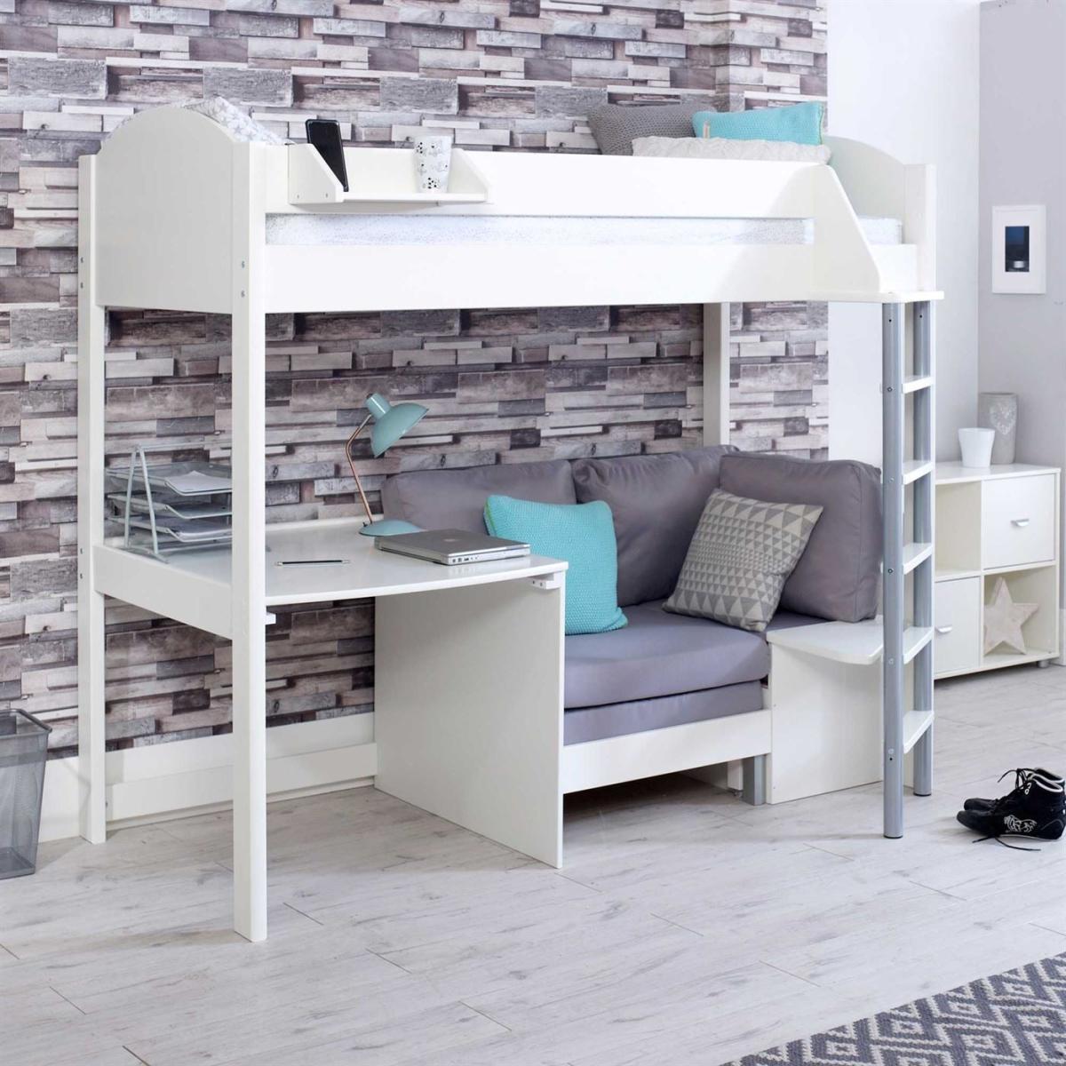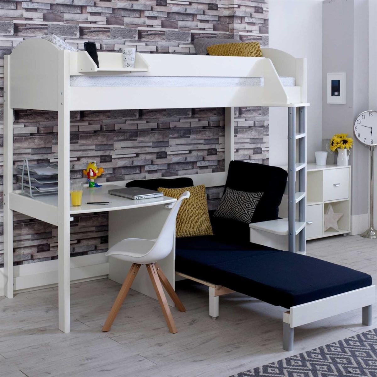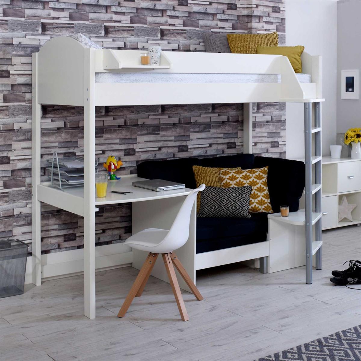 Design. Featuring a raised sleeping area and a cosy chill-out space underneath, the Nova high sleeper bed with desk and futon is a fun and functional addition to any child’s bedroom. Contemporary and timeless, the sturdy wooden frame is finished in crisp white, with safety rails and easy-climb steps. Saving surrounding room for storage solutions and fun activities, the nook below the bed contains a handy desk as well as a futon chair that extends forsleepovers. Three colour choices make this option ideal for a range of bedroom themes. Please note clip on shelf is not included but is available to purchase, please contact us for more details.