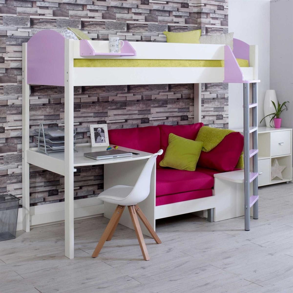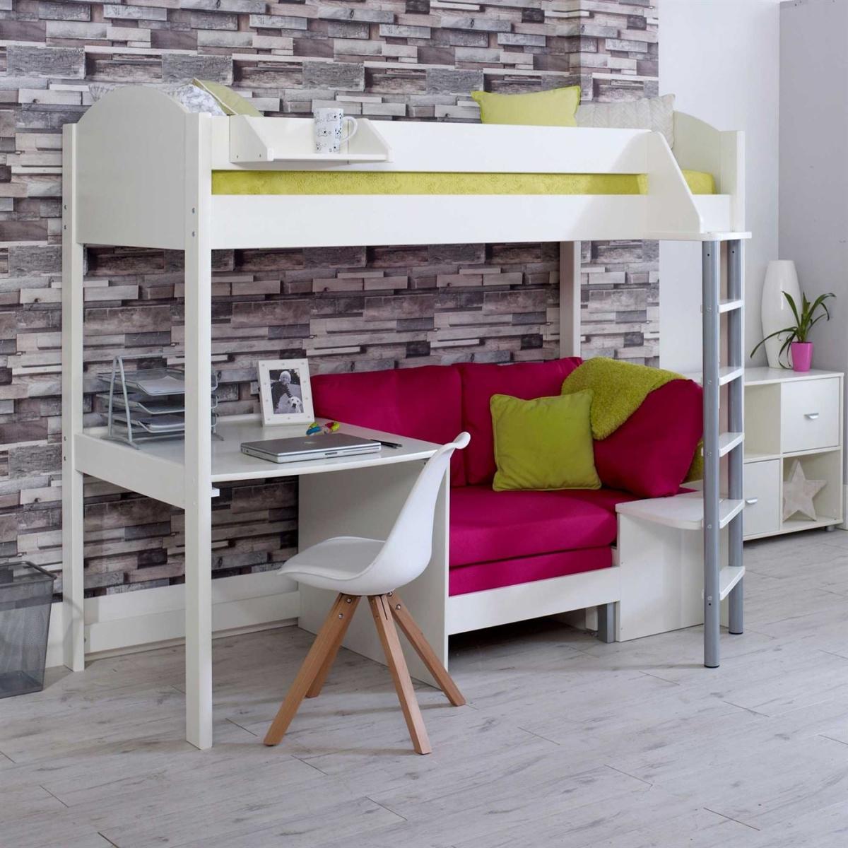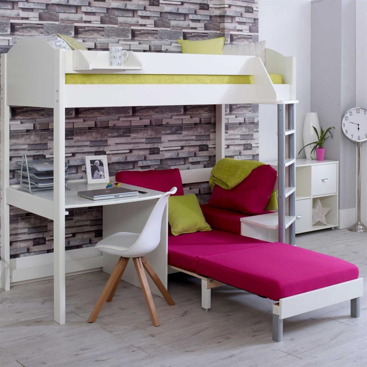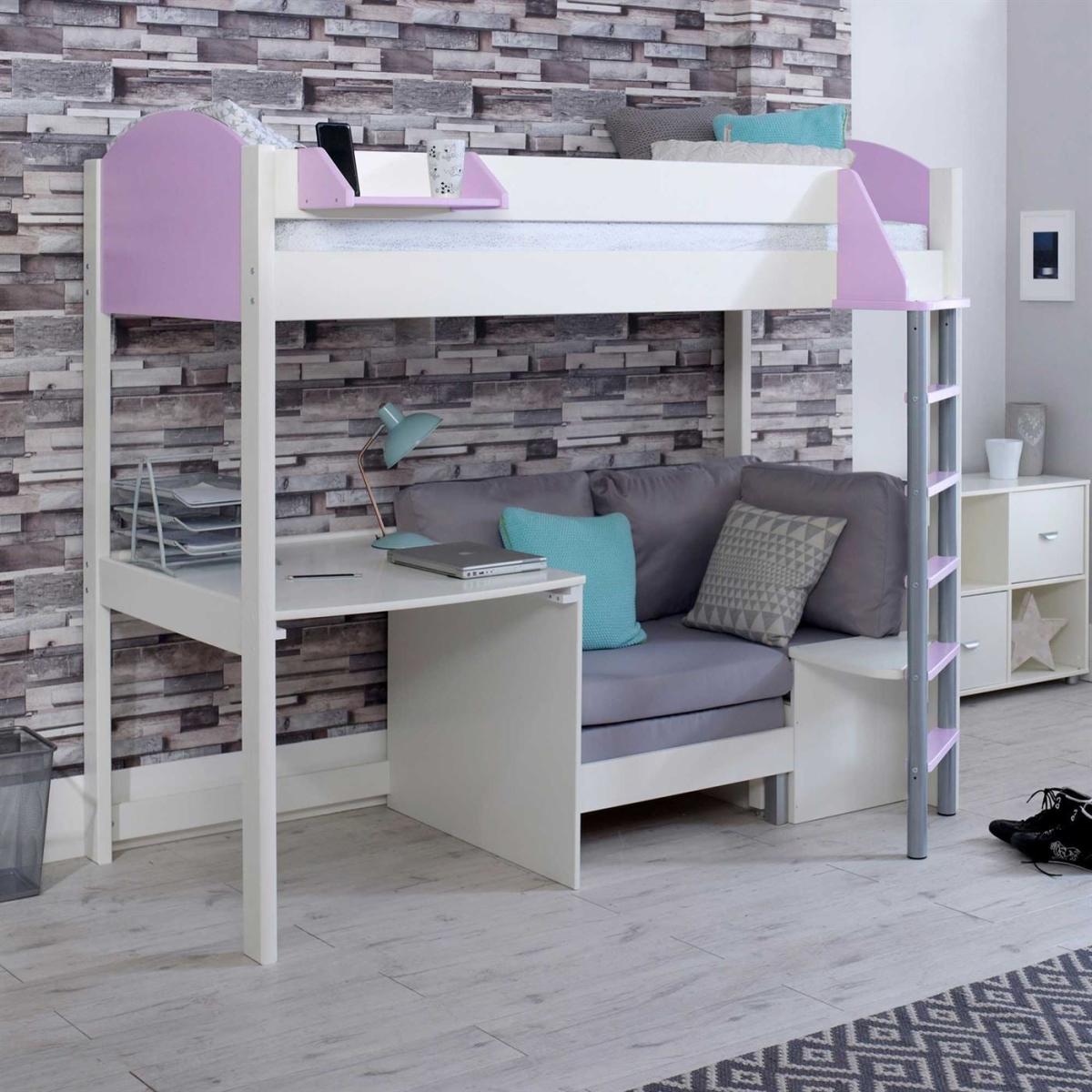 Design. Featuring a raised sleeping area and a cosy chill-out space underneath, the Nova high sleeper bed with desk and futon is a fun and functional addition to any child’s bedroom. Contemporary and timeless, the sturdy wooden frame is finished in crisp white, with safety rails and easy-climb steps. Saving surrounding room for storage solutions and fun activities, the nook below the bed contains a handy desk as well as a futon chair that extends forsleepovers. Three colour choices make this option ideal for a range of bedroom themes. Please note clip on shelf is not included but is available to purchase, please contact us for more details.