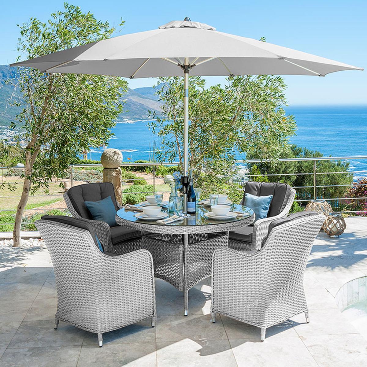 The Heritage Camilla 4 Seat Rattan Dining Set - 1.2m Round Table is designed to suit any garden. The 1.2m table and 4 Camilla dining chairs provide ample space for al fresco dining. The dining table is topped with 8mm tempered glass for extra safety. Crafted using aluminium powder coated frames the set will not rust and the famous weatherproof qualities of rattan furniture allow this set to be left outside all year round, exposed to sunshine, rain, frost, snow and wind without any damage to the set. This set comes with a 7 year guarantee to ensure quality and peace of mind. Designed using a mixture of full rod and half rod rattan weave, this set is woven tightly around the frames to prevent sagging or movement. Plus, the tables and chairs have adjustable feet which allows you to remain comfy even on uneven surfaces. This set comes complete with thick padded cushions throughout. We advise keeping the cushions inside when not in use as they are not waterproof. However, the cushion covers can be unzipped and are machine washable. All chairs will arrive fully assembled but the table may require some assembly.