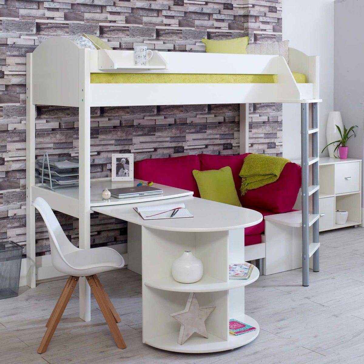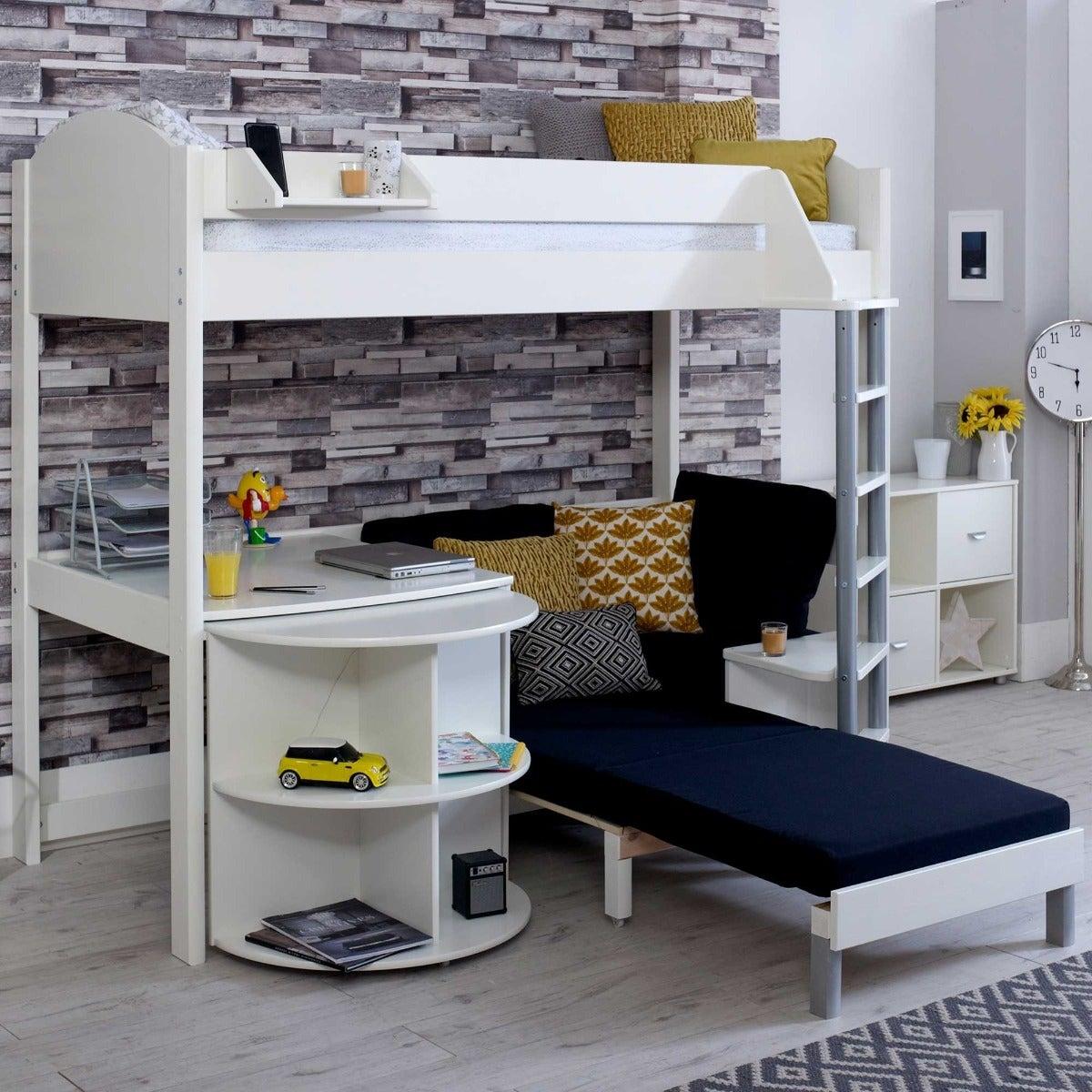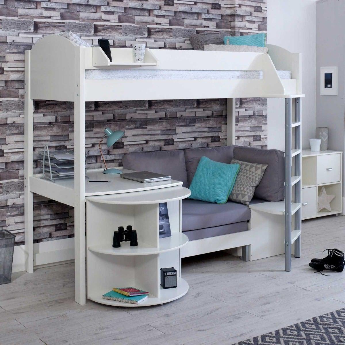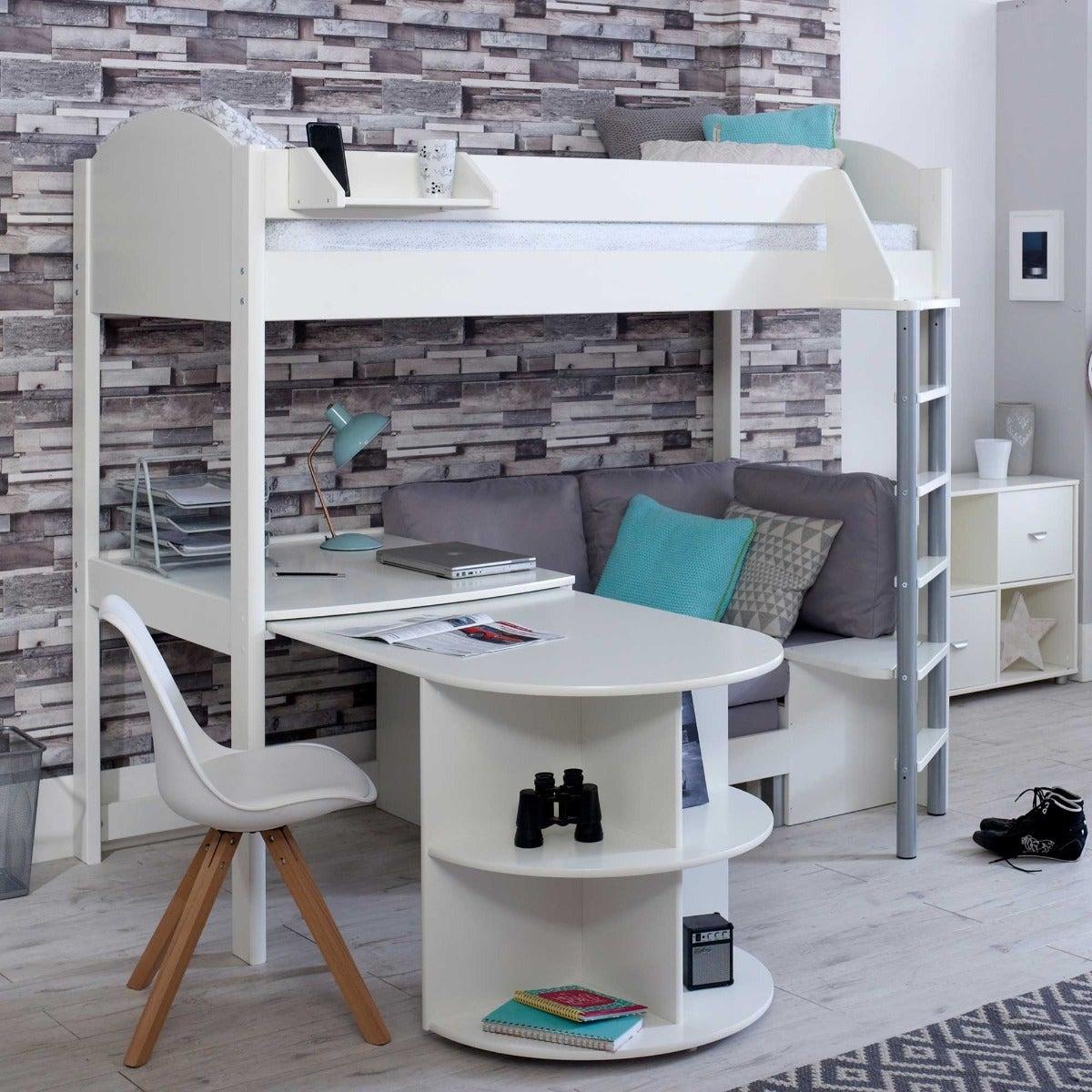 Design. Keeping both parent and child happy, the Nova high sleeper bed with pull-out desk and futon makes smaller spaces as practical as possible. Beneath the raised bed is a cosy nook that has been cleverly designed to include a chill-out space, with comfy futon that easily extends into an extra bed. Alongside this, additional surface space and a dedicated homework area comes courtesy of the desk, which rolls out on castors when required. Contemporary and versatile, the white solid wood frame is ever-stylish and incredibly safe. Please note clip on shelf is not included but is available to purchase, please contact us for more details.