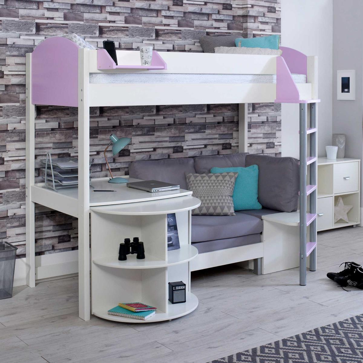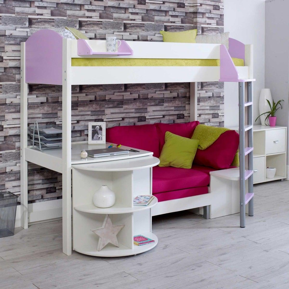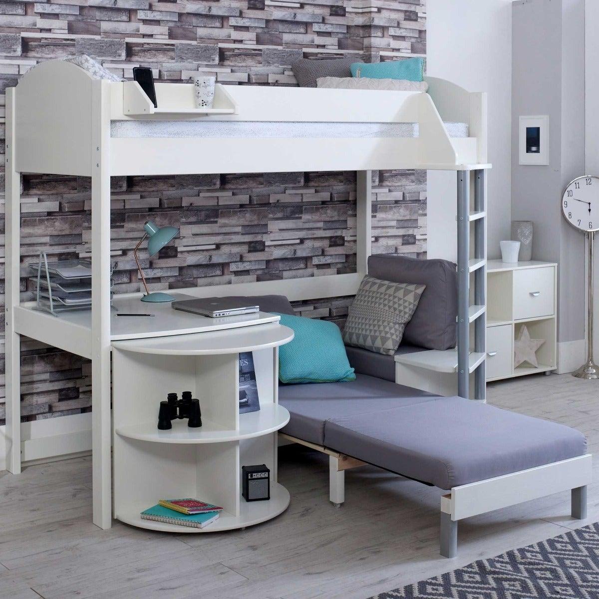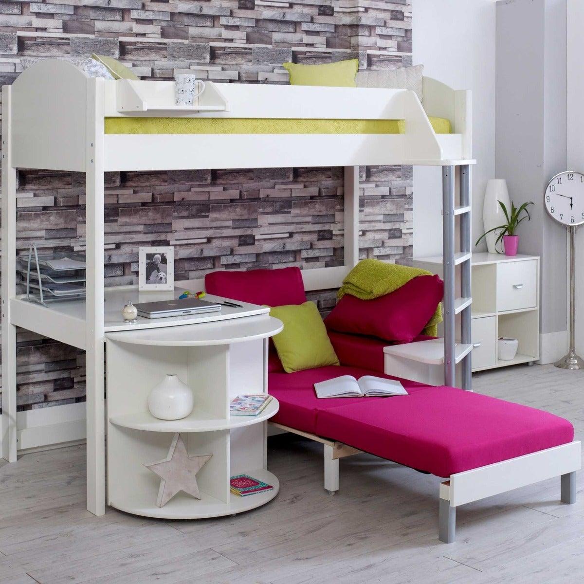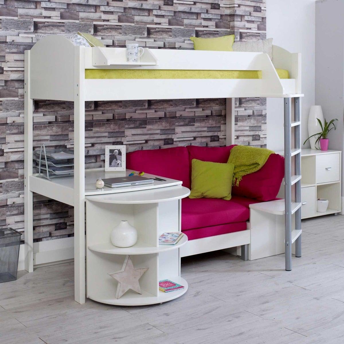 Design. Keeping both parent and child happy, the Nova high sleeper bed with pull-out desk and futon makes smaller spaces as practical as possible. Beneath the raised bed is a cosy nook that has been cleverly designed to include a chill-out space, with comfy futon that easily extends into an extra bed. Alongside this, additional surface space and a dedicated homework area comes courtesy of the desk, which rolls out on castors when required. Contemporary and versatile, the white solid wood frame is ever-stylish and incredibly safe. Please note clip on shelf is not included but is available to purchase, please contact us for more details.