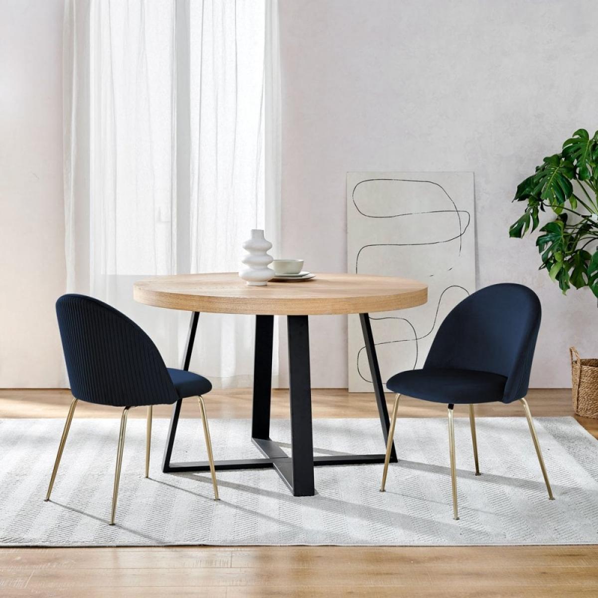 I love this chair for its vibrant royal blue recycled velvet upholstery and sleek chrome legs, which create a contemporary yet versatile look. It works particularly well in modern, eclectic, or minimalist interiors where a pop of colour can elevate the overall scheme. Its compact size makes it ideal for smaller dining spaces or as additional seating in a casual lounge. Styling tips include pairing it with neutral-toned tables to let the blue stand out or adding textured cushions in contrasting fabrics like faux leather or woven textiles for extra visual interest. Because of its recycled velvet, it’s also a great eco-friendly choice, blending sustainability with style.