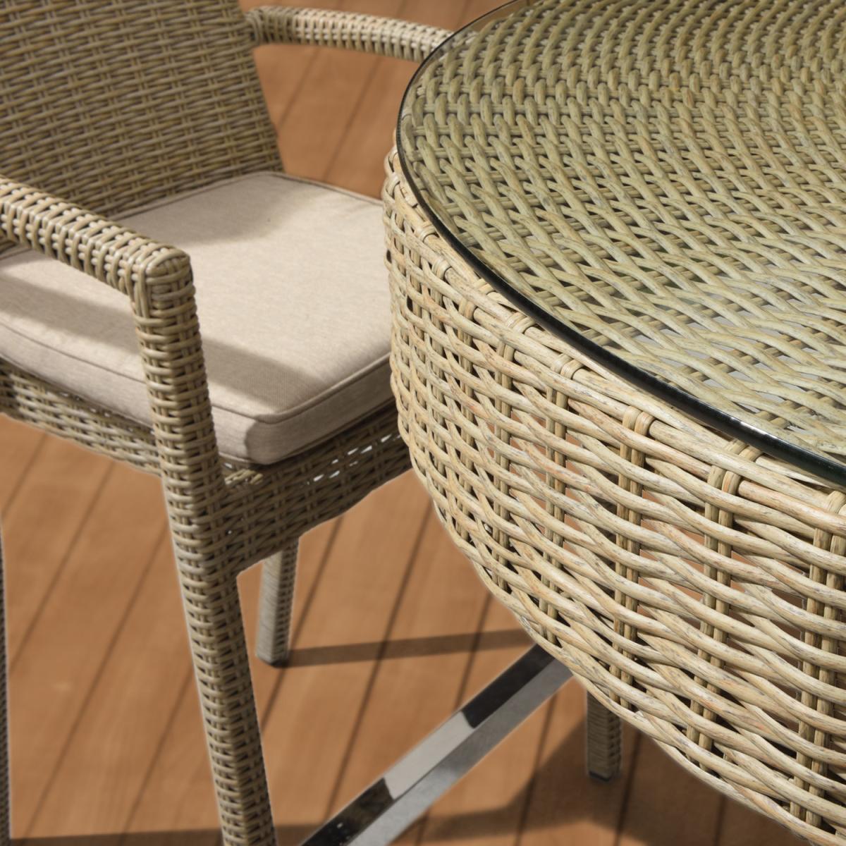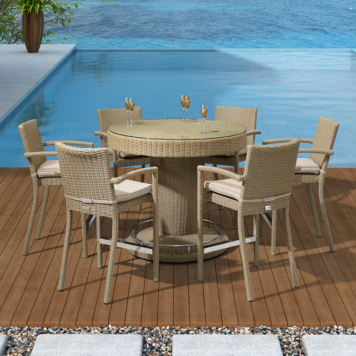 The Nova - Henley 6 Seat Round Bar Set is ideal for any outdoor area. Ideal for sharing a drink with family or friends the bar set offers a high bar table and 6 bar stools. This set comes complete with thick padded cushions throughout. We advise keeping the cushions inside when not in use as they are not waterproof. However, the cushion covers can be unzipped and are machine washable. The high-quality PE rattan is completely weatherproof and can be left outside all year round without risk of weather damage. This set comes complete with a 5 year guarantee to ensure quality and peace of mind Set Includes: 1 x Bar Table 6 x Bar Stools Padded Cushions Throughout Product Features: 5 Year Guarantee Powder Coated Aluminum Frames 100% Weatherproof Rattan