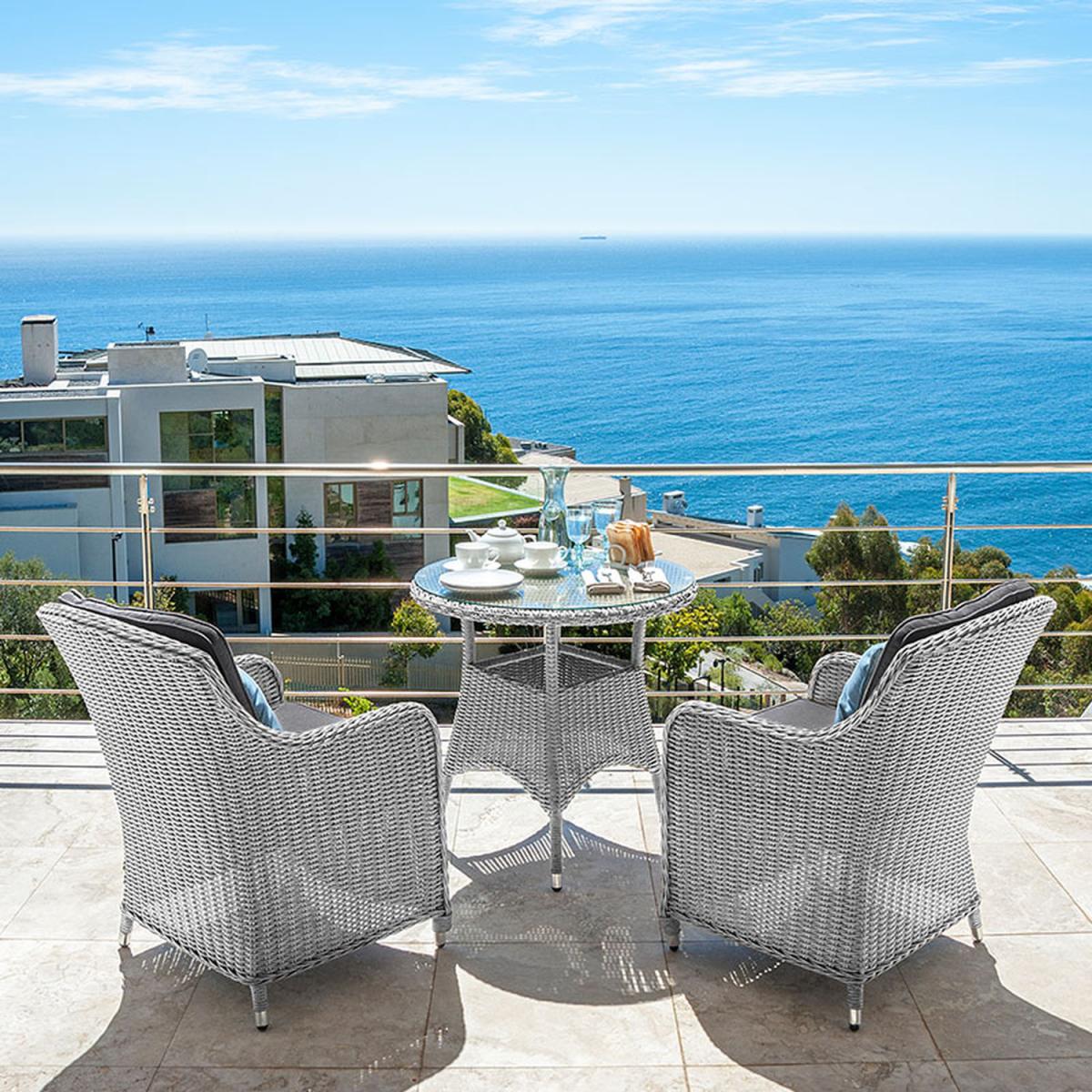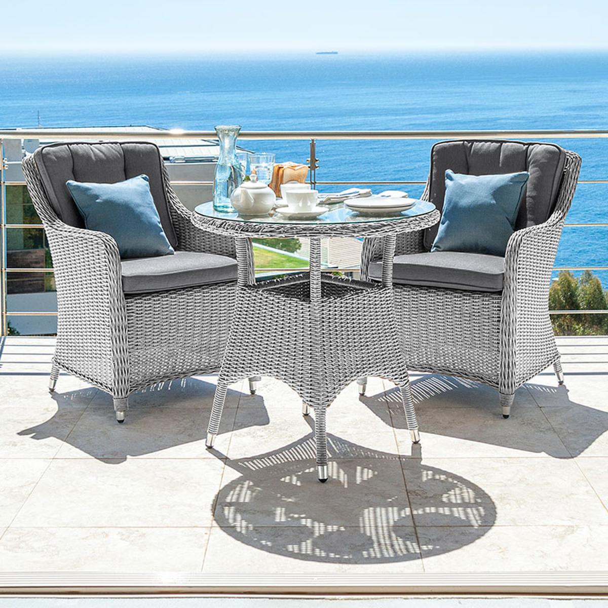 The Heritage Camilla 2 Seat Rattan Bistro Set - 75cm Round Table is designed for those with smaller gardens or balconies. The 75cm table and 2 Camilla dining chairs provide ample space for dining without taking up a lot of room in your chosen spot. The bistro table is topped with 5mm tempered glass for extra safety. Crafted using aluminium powder coated frames the set will not rust and the famous weatherproof qualities of rattan furniture allow this set to be left outside all year round, exposed to sunshine, rain, frost, snow and wind without any damage to the set. This set comes with a 7 year guarantee to ensure quality and peace of mind. Designed using a mixture of full rod and half rod rattan weave, this set is woven tightly around the frames to prevent sagging or movement. Plus, the tables and chairs have adjustable feet which allows you to remain comfy even on uneven surfaces. This set comes complete with thick padded cushions throughout. We advise keeping the cushions inside when not in use as they are not waterproof. However, the cushion covers can be unzipped and are machine washable. All chairs will arrive fully assembled but the table may require some assembly.