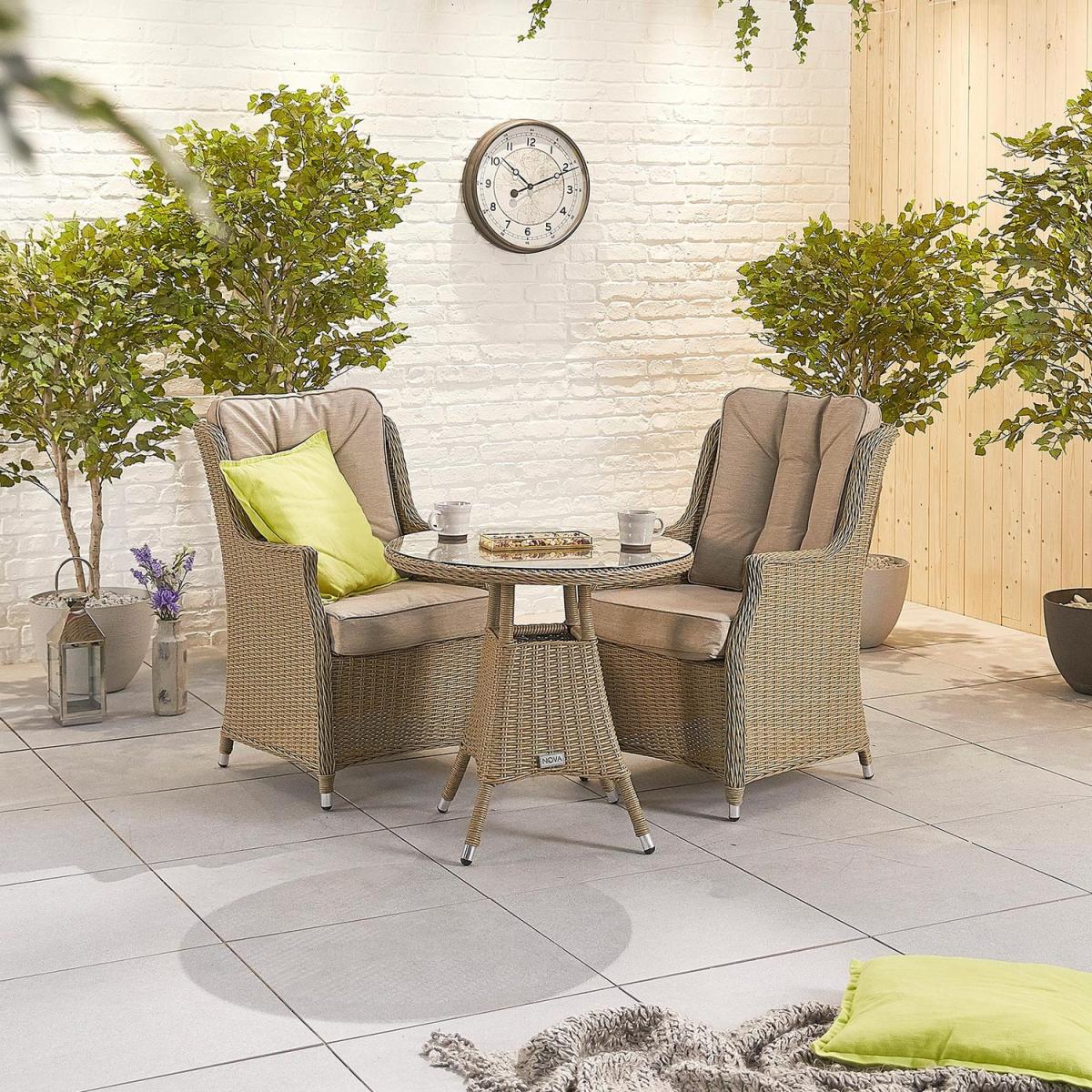 The Heritage Thalia 2 Seat Rattan Bistro Set - 75cm Round Table is designed for those with smaller gardens or balconies. The 75cm table and 2 Thalia dining chairs provide ample space for dining without taking up a lot of room in your chosen spot. The bistro table is topped with 5mm tempered glass for extra safety. Crafted using aluminium powder coated frames the set will not rust and the famous weatherproof qualities of rattan furniture allow this set to be left outside all year round, exposed to sunshine, rain, frost, snow and wind without any damage to the set. This set comes with a 7 year guarantee to ensure quality and peace of mind. Designed using a mixture of full rod and half rod rattan weave, this set is woven tightly around the frames to prevent sagging or movement. Plus, the tables and chairs have adjustable feet which allows you to remain comfy even on uneven surfaces. This set comes complete with thick padded cushions throughout. We advise keeping the cushions inside when not in use as they are not waterproof. Chairs will arrive fully assembled but the table may require some assembly.