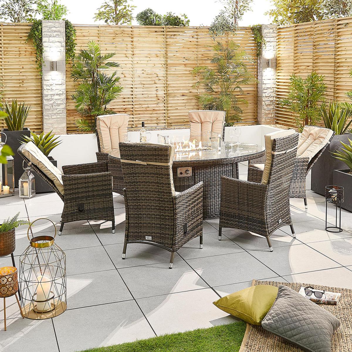The Nova - Ruxley Fireglow 6 Seat Rattan Dining Set - 1.8m x 1.2m Oval Gas Fire Pit Table is the ideal choice for those who want to enjoy their garden all year round. This furniture is ideal for entertaining all year round. This is because the 1.8m x 1.2m oval rattan dining table includes a firepit in the centre of the table. This firepit gives off both heat and light, allowing you to warm your guests and extend your party well into the evening and use your garden all year round. This set also comes with 6 Ruxley dining armchairs which are created to offer support and comfort with their reclining backs that allow you to sit in multiple positions. Plus, the firepit comes with a handy wind guard to stop the flames from blowing across the table and to keep fingers away from the heat. You can also create more dining space by covering the fire pit with the stainless steel lid when you are not using the fire pit. The recommend gas tank is a 5kg patio gas bottle, which can be stored out of sight within the table. Additionally, there is a handy control panel which allows you to control the heat with ease. The fire pit will radiate heat up to 18kw. This fire pit is CE registered for safety compliance. The furniture is crafted using rustproof powder coated aluminium frames as well as a PE synthetic rattan weave which is fully Weatherproof and can be left outside all year round, enduring temperatures of +40°C and -20°C. This set comes with padded cushions throughout which help to improve the comfort of the furniture. Whilst these cushions are not fully weatherproof, they will survive a light shower and can be cleaned easily should spills occur. We do, however, recommend storing the cushions indoors when not in use. Set Includes: 6 x Reclining Ruxley Dining Armchairs 1 x 1.8m x 1.2m Oval Firepit Dining Table 1 x Wind Guard Product Features: 100% Weatherproof Rattan Up to 18kw Heat Controlled by Control Panel Padded Cushions Throughout CE Registered.