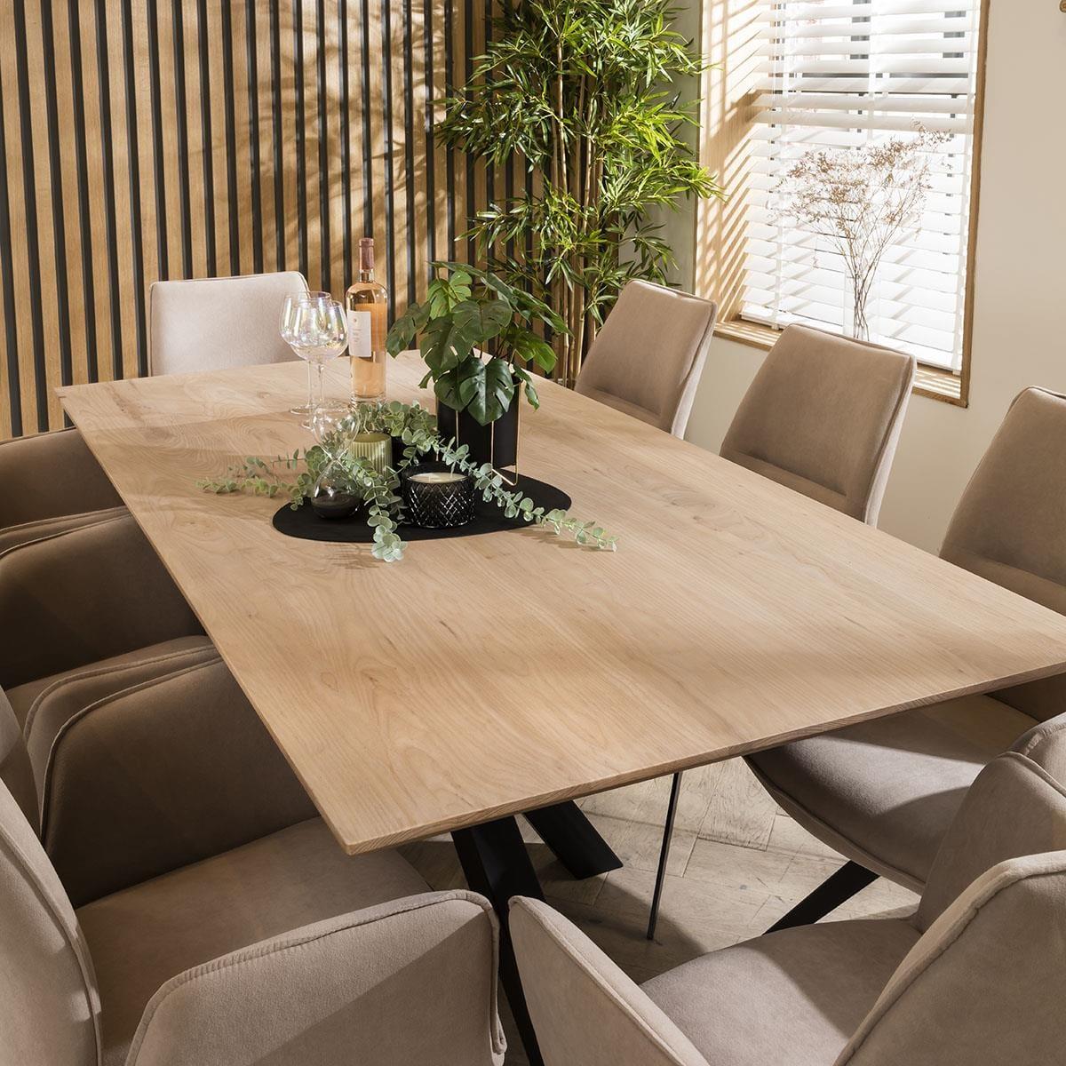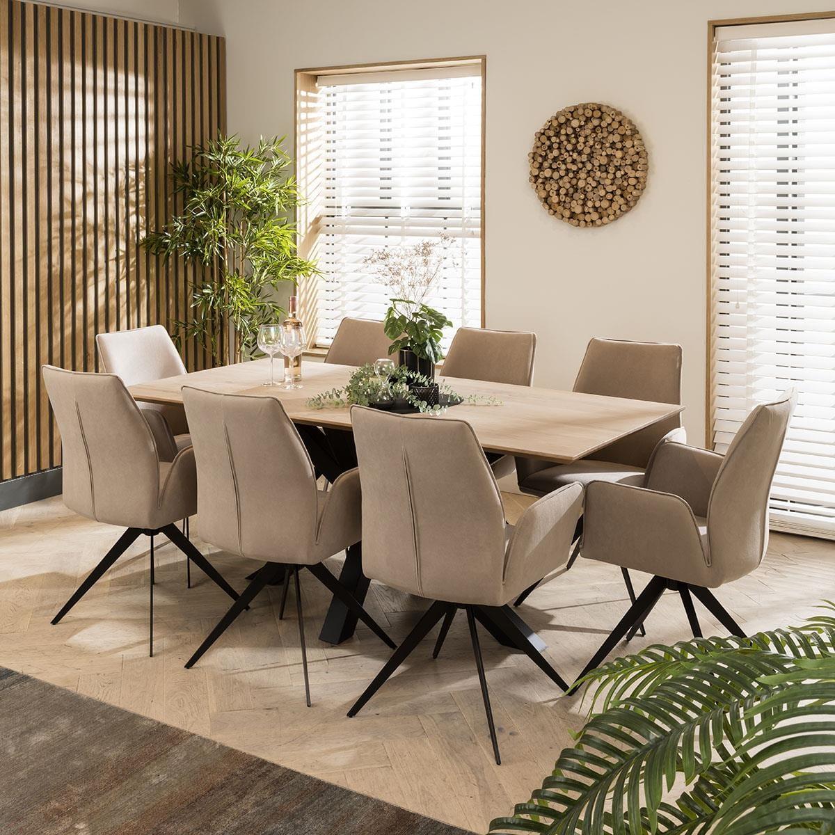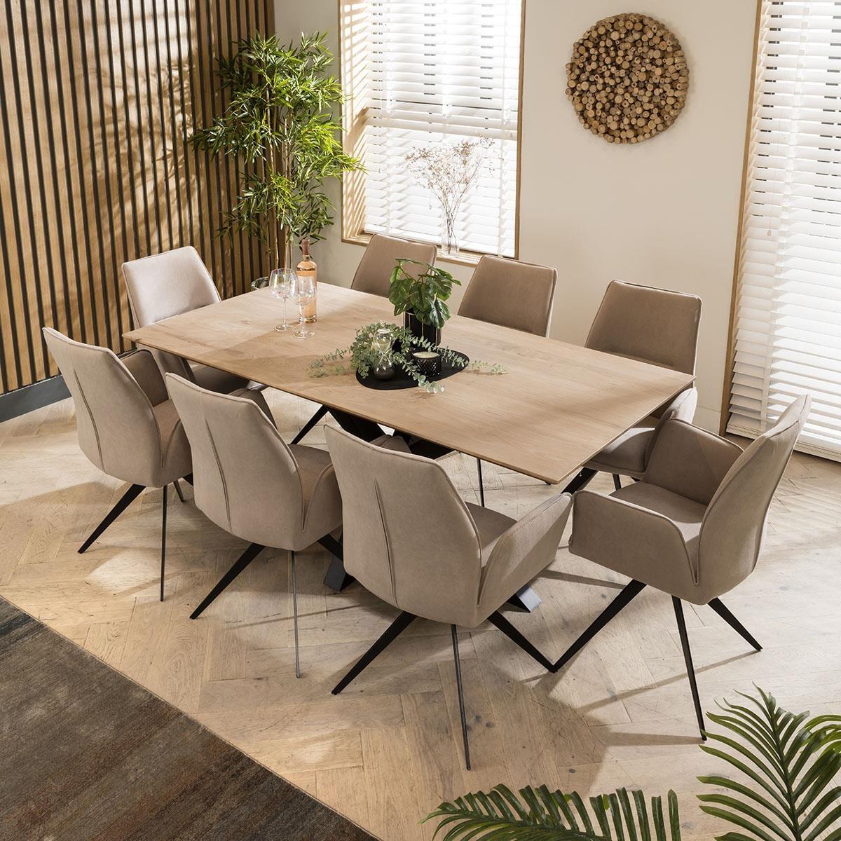 Immerse yourself in the art of luxurious dining with our upscale Nova 8-seater dining set. The light natural finish of the Aries solid wood dining table, paired with the eight Nova mink velvet chairs achieves aesthetic unity. This 8 seat dining set seamlessly blends contemporary aesthetics with luxurious comfort. Gather round the Aries Wooden Dining Table with its natural finish that showcases the natural beauty of the wood. This industrial inspired 8 seater dining table is expertly crafted from solid wood, ensuring long-lasting durability. The sleek black wood star spider pedestal base supports the large premium 190cm table top. For contemporary elegance and comfort, the 8 Nova dining chairs in this set are crafted to perfection. The chairs boast a sleek and innovative design, wrapped in an elegant mink velvet fabric. With its unique carver style featuring comfortable arms and metal swivel base, this chair is a true testament to modern luxury. This 8 seater dining set combines modern Nova chairs with the stunning Aries table. Whether you love the Nova chairs and would like to purchase them individually, or you think the Aries table would complete your interior scheme better with another chair, you can easily mix and match our modern dining tables and chairs to curate something truly unique. Table Size W190cm D95cm H78cm Chair Size W64cm D64cm H92cm Dining Table And Chair Set For 8