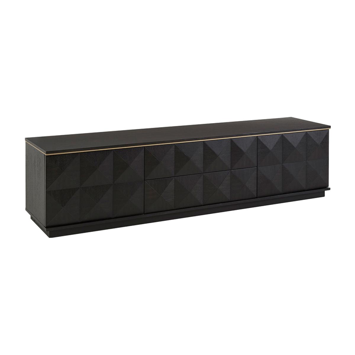 I love this TV unit for its sleek, contemporary design and versatile colour palette, making it a great statement piece in modern and eclectic interiors alike. It works particularly well in minimalist or luxe schemes, where its geometric detailing can add visual interest without overpowering the space. Practical styling tips include using it as a base for decorating with a few carefully chosen accessories, such as statement vases or sculptural objects, while keeping the surface clutter-free. Additionally, its spacious cupboards offer excellent storage options, helping to keep living areas tidy and stylish.
