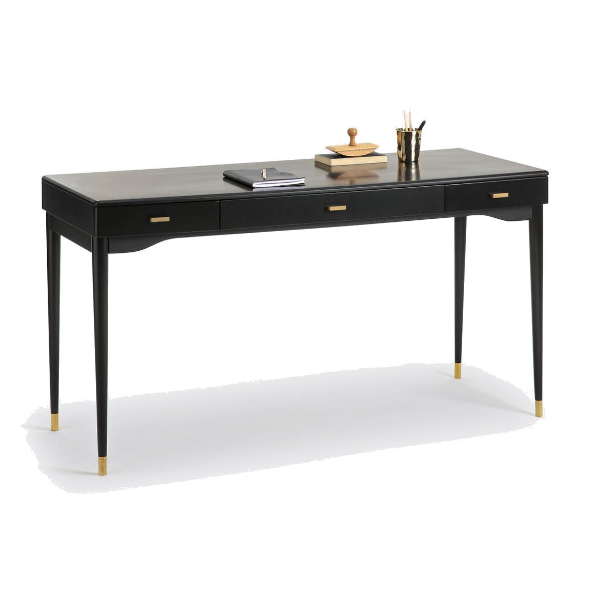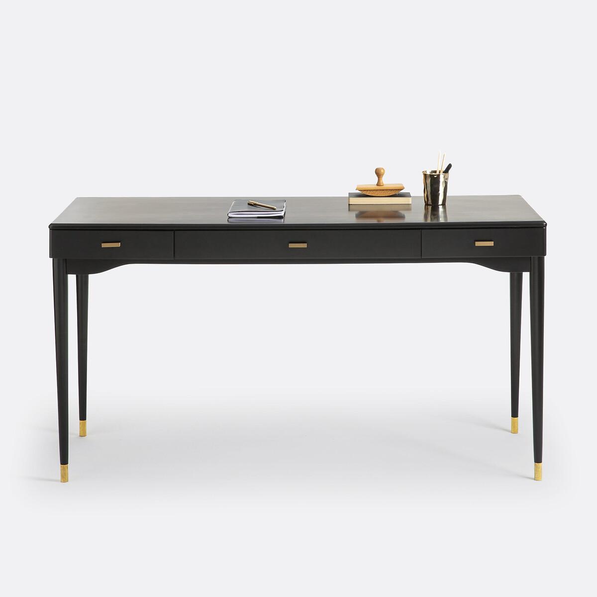 With lines and finishes borrowed from current trends, the Novani desk has a sophisticated look while maintaining a functional spirit.. Product Details • Pre-assembled desktop with 3 drawers. • Tapered shape with conical feet. • Solid birch construction finished with black lacquered MDF. • Legs in black lacquered solid birch with a polyurethane varnish finish. • Brass-finish steel drawer handles and end caps. Dimensions. Overall • Width: 130cm • Height: 75cm • Depth: 55cm. Usable space • Small drawer:L29.3 x H4.8 x D38cm • Middle drawer : L54.5 x H4.8 x D38cm • Sold with feet to be attached. • WOOD FROM SUSTAINABLY MANAGED FORESTS. FSC® certified wood comes from forests that are environmentally, socially and economically well managed. Parcel Dimensions:1 parcel • 140.5 x 65 x 21cm • 34.1kg