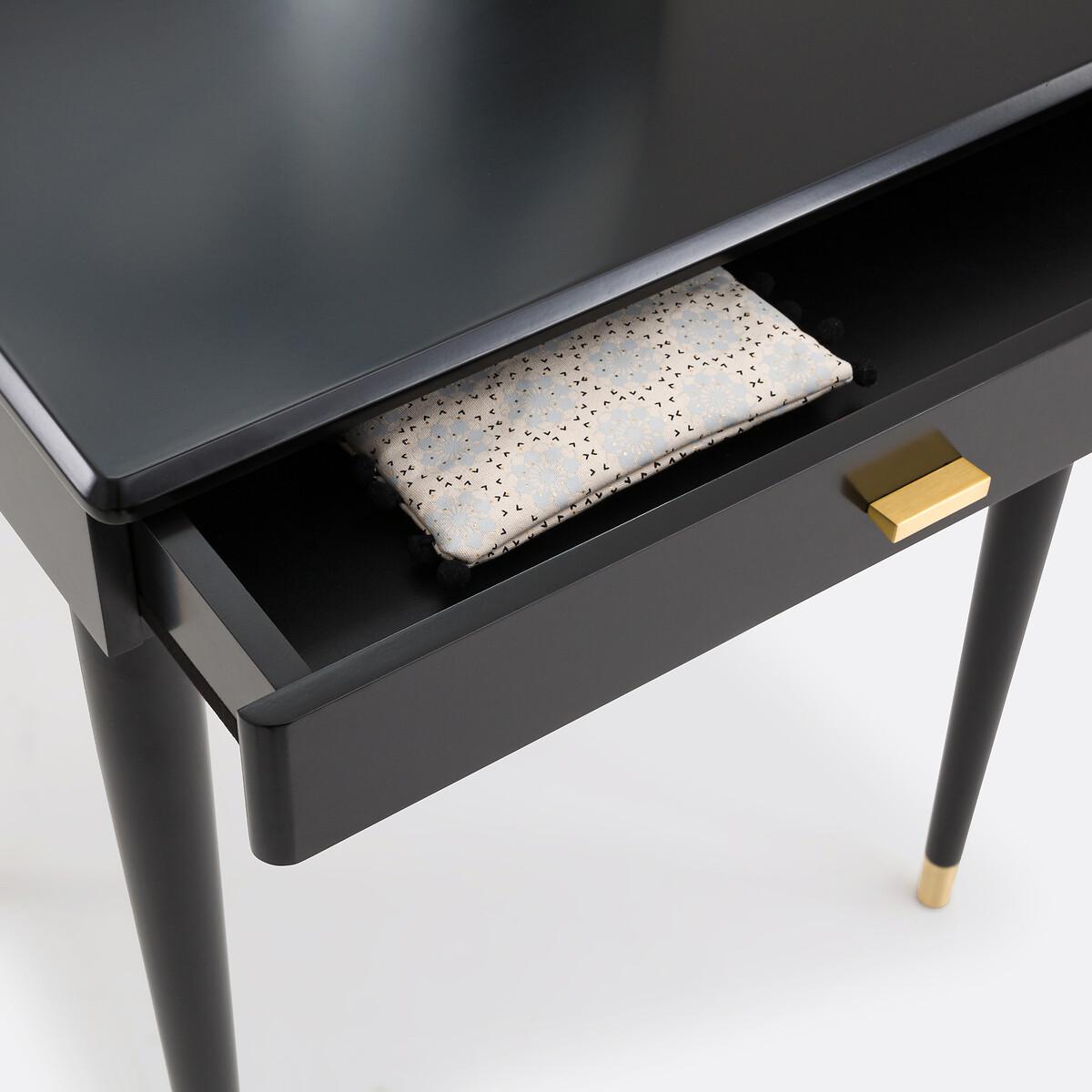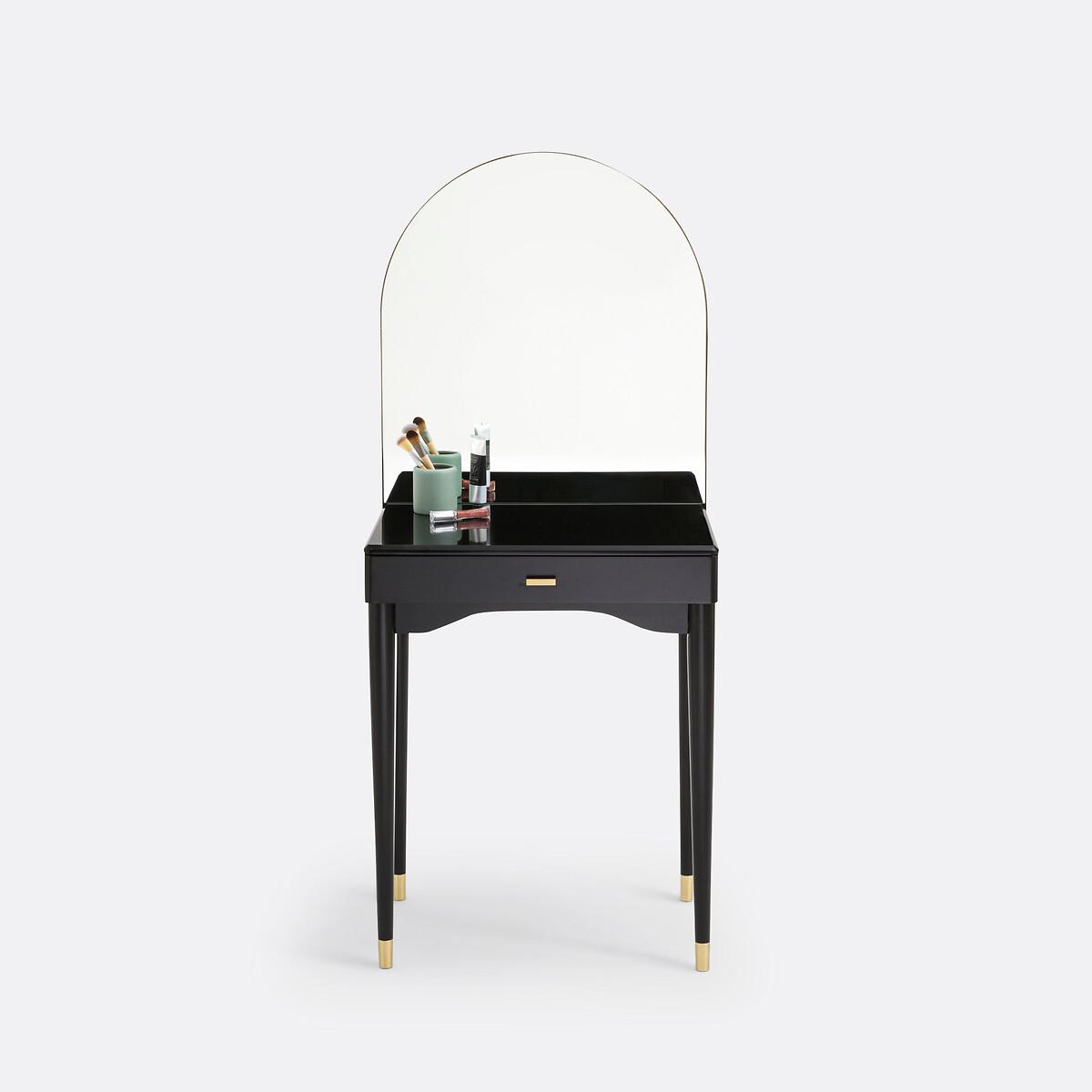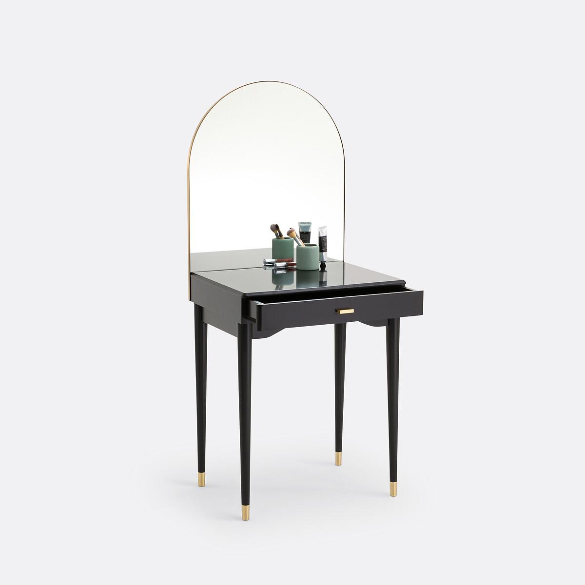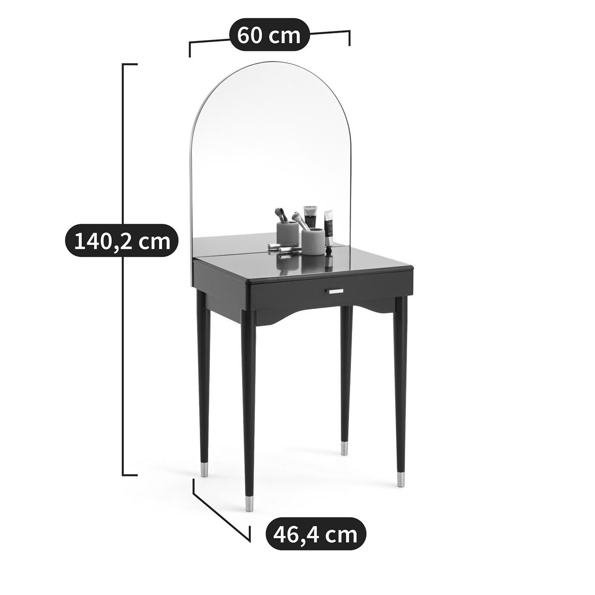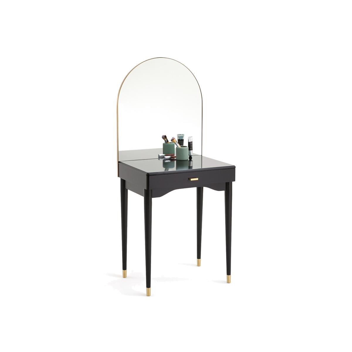 With a design borrowed from current trends, the Novani dressing table offers very sophisticated lines for a truly successful piece of furniture.. Designed by La Redoute Interiors. Product Details • 1 drawer and 1 mirror • Solid birch construction finished with black lacquered MDF • Tapered legs in black lacquered solid birch, polyurethane varnish finish • Drawer handle, mirror surround and brass-finish steel feet. • FSC® certified woodDimensions. Overall • Width: 60cm • Height: 140.2cm • Depth: 46.4cm • Weight: 21.3kg. Usable dimensions: • Drawer:L53.5 x D38.2 x H4.9cm • Mirror: L58.4 x H65.2cm • Assembly required. • WOOD FROM SUSTAINABLY MANAGED FORESTS. FSC® certified wood comes from forests that are environmentally, socially and economically well managed. Dimensions and weight of parcel2 parcels • L75 x H26 x D54cm. 16.5kg • L84.5 x H9 x D72cm. 11.7kg