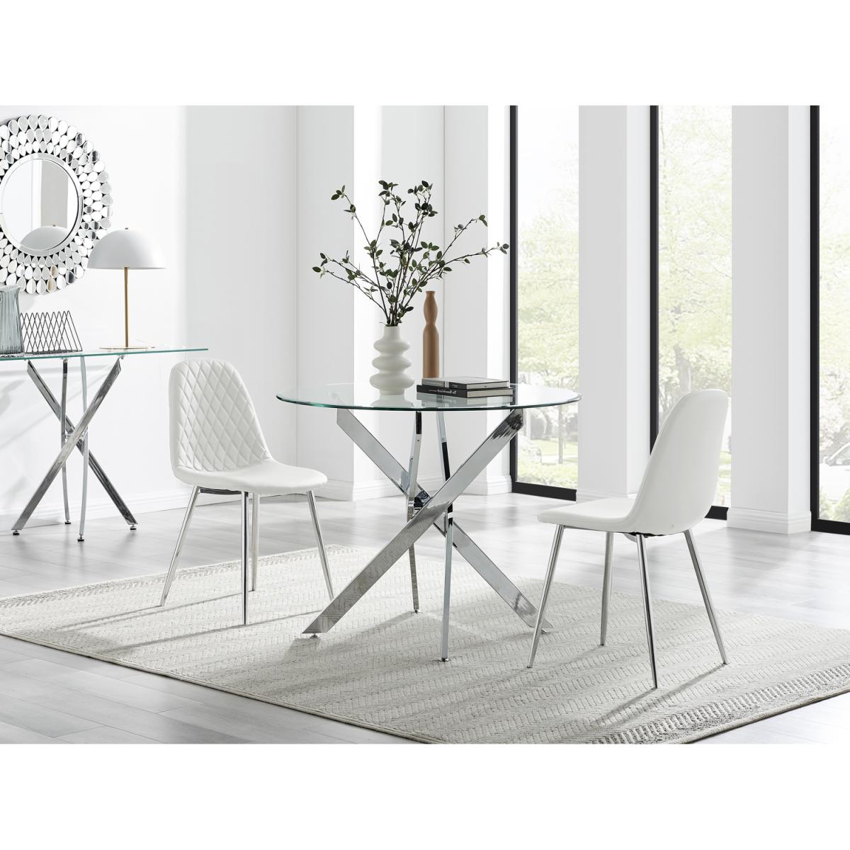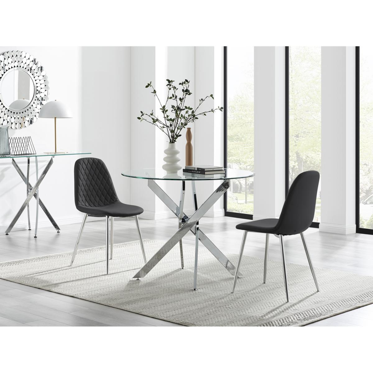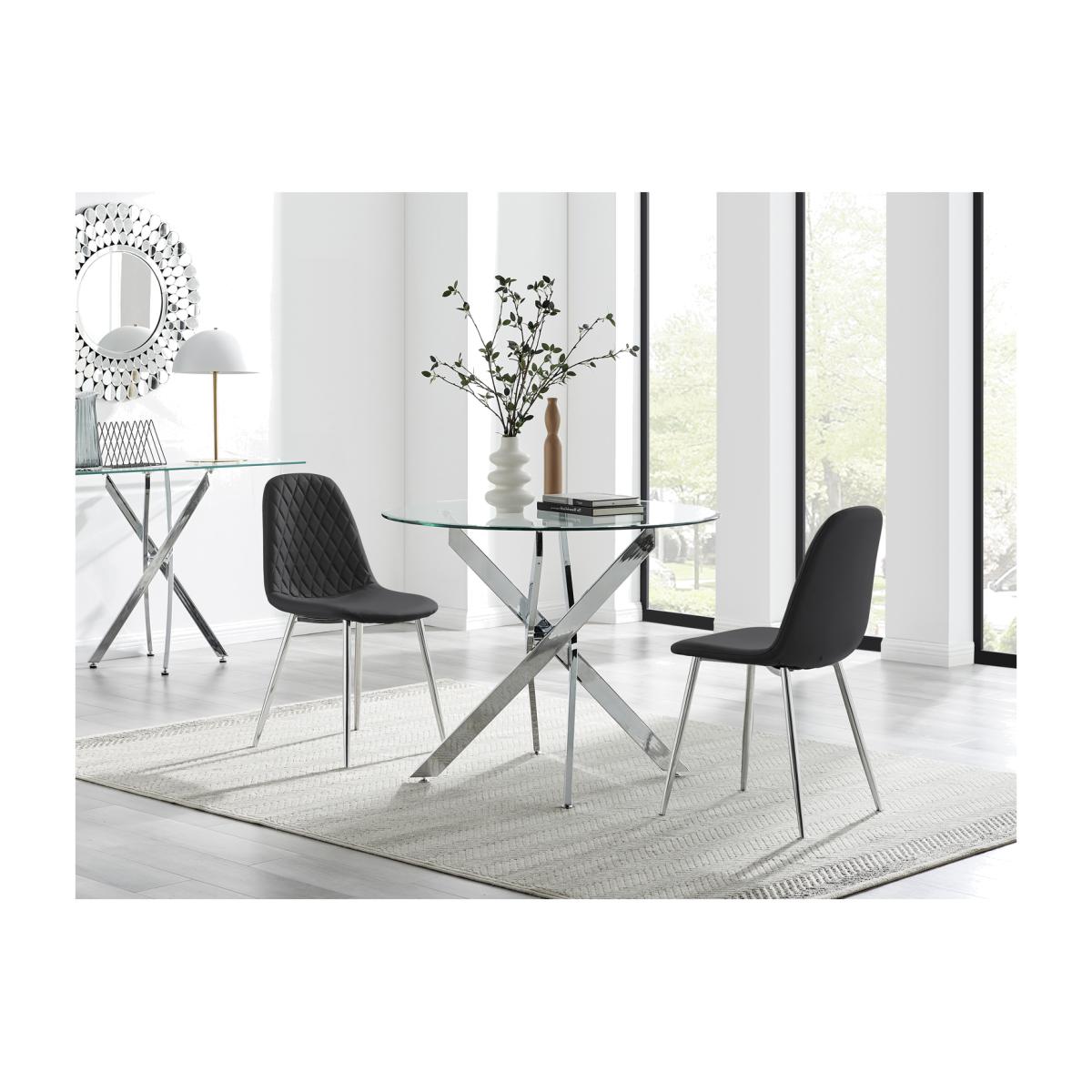 The strikingly elegant Novara dining table is a stylish and modern combination of chrome and glass, making this set a real eye-catcher. The chrome metal legs provide strong and sturdy support for the table, whilst the unique intertwined nest design exudes modern style. This 2 seater table and chairs are ideal as a space-saving dining table for apartments and smaller homes. The round glass dining table has plenty of space for the two of you to enjoy dinner together and the two dining chairs will take up minimal space in your home. Pair with our beautiful Corona chairs to complete the look! With a perfect balance of pattern and texture, the new Corona Chair is a statement piece ready for the modern dining space. The trendy gold or silver chrome legs are all the rage and offer a perfect way to add an accent of lustre to your home. The Scandi-style faux leather seat with diamond pattern stitching is a unique take on a classic design offering comfort and durability for everyday use.