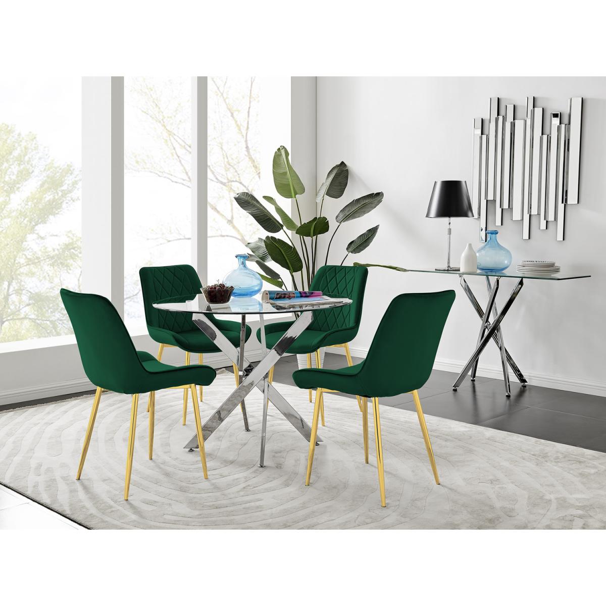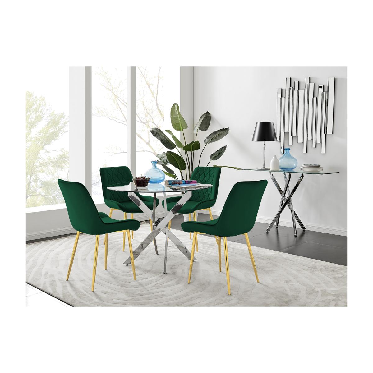 The strikingly elegant Novara dining table is a stylish and modern combination of chrome and glass, making this item a real eye-catcher. The chrome metal legs provide strong and sturdy support for the table, whilst the unique intertwined nest design exudes modern style. This table really is capable of being a centrepiece in any home! With a generous 100x100cm surface, you can dine in style with up to 4 guests. Modernise your dining area with our luxurious velvet upholstered Pesaro Dining Chairs. With a nod to the Mid-century modern design era, the Pesaro features gorgeous textured diamond stitching with an ergonomically designed curved seat pad blending seamlessly to the supporting medium-high backrest. Sat atop elegant slightly tapered legs in black, chrome or gold effect. The Pesaro is a perfect match for any dining table or used as a luxe vanity seat in the bedroom, as an occasional chair for the living area or to add a bit of luxury to your home office.
