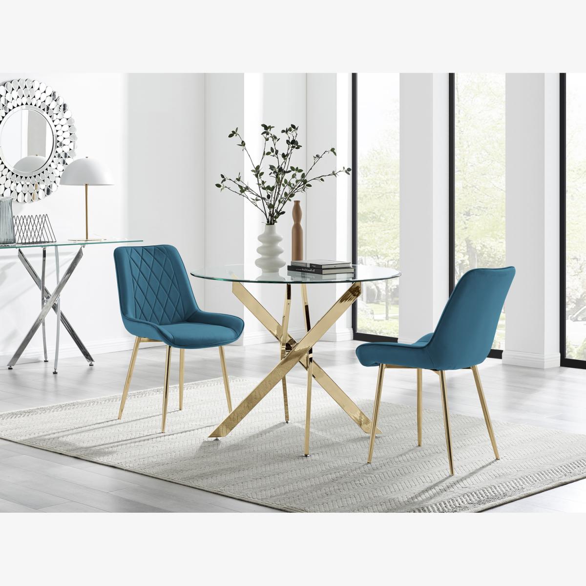 The strikingly elegant Novara dining table is a stylish and modern combination of gold metal and glass, making this item a real eye catcher. The gold metal legs provide a strong and sturdy support for the table, whilst the unique intertwined nest design exude modern style. This table really is capable of being a centre piece in any home! With a generous 100x100cm surface you can dine in style with up to 4 guests. Modernise your dining area with our luxurious velvet upholstered Pesaro Dining Chairs. With a nod to the Mid-century modern design era, the Pesaro features gorgeous textured diamond stitching with an ergonomically designed curved seat pad blending seamlessly to the supporting medium high back rest. Sat atop elegant slightly tapered legs in black, chrome or gold effect. The Pesaro is a perfect match to any dining table or use as a luxe vanity seat in the bedroom, as an occasional chair for the living area or to add a bit of luxury to your home office.