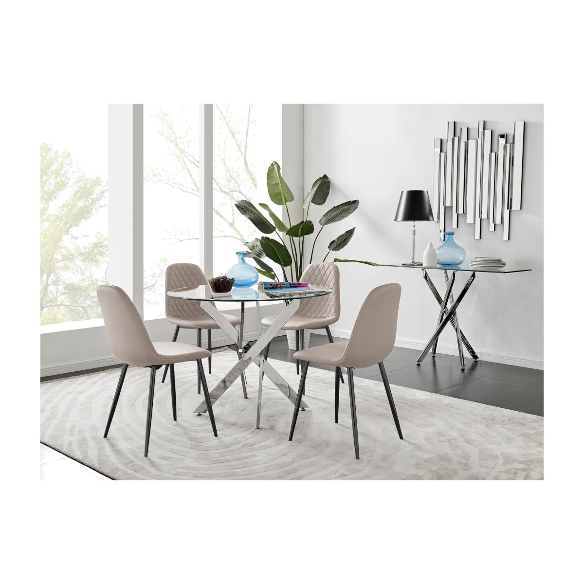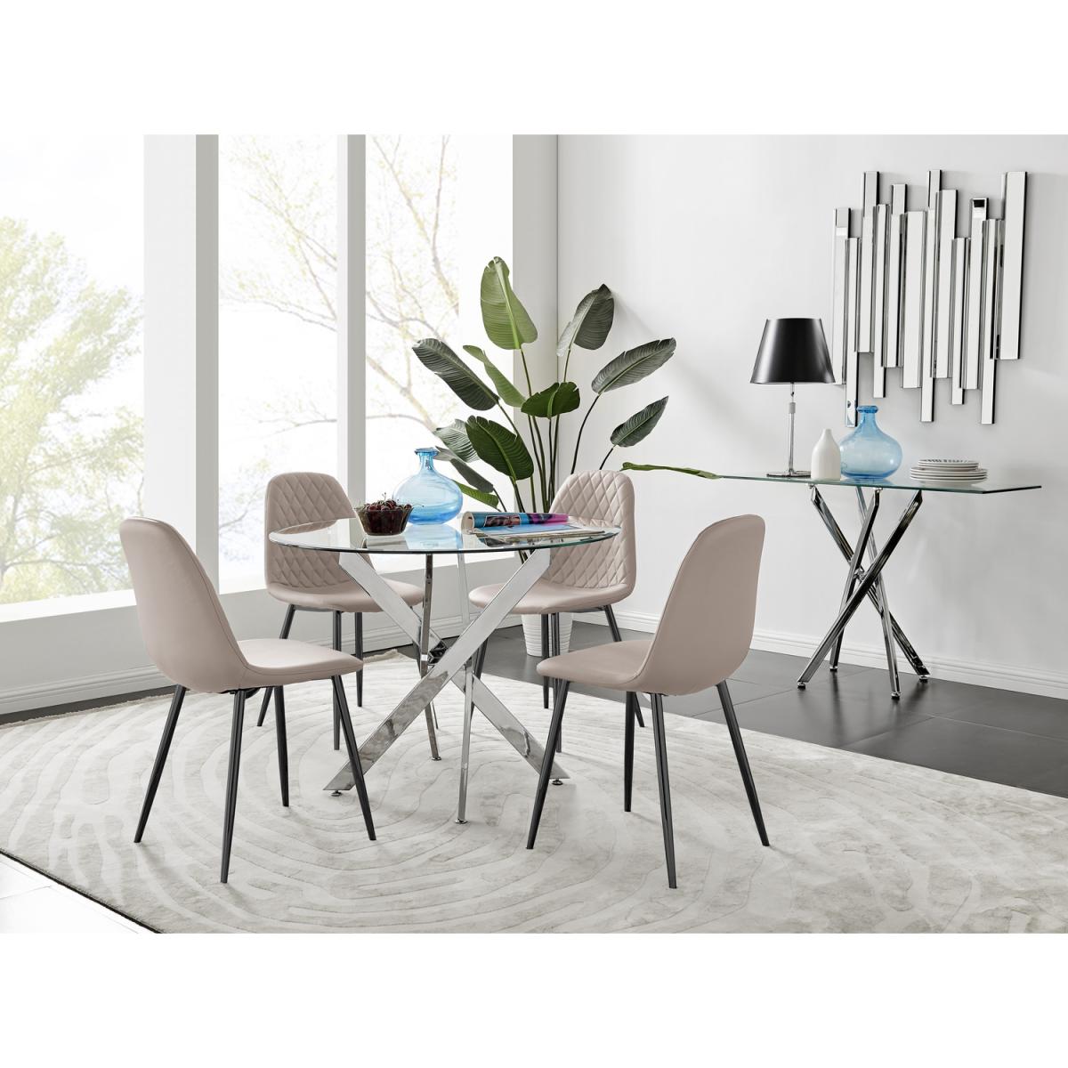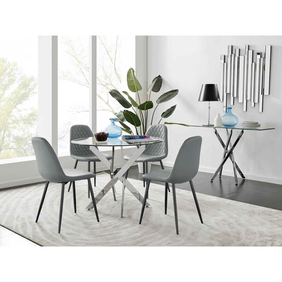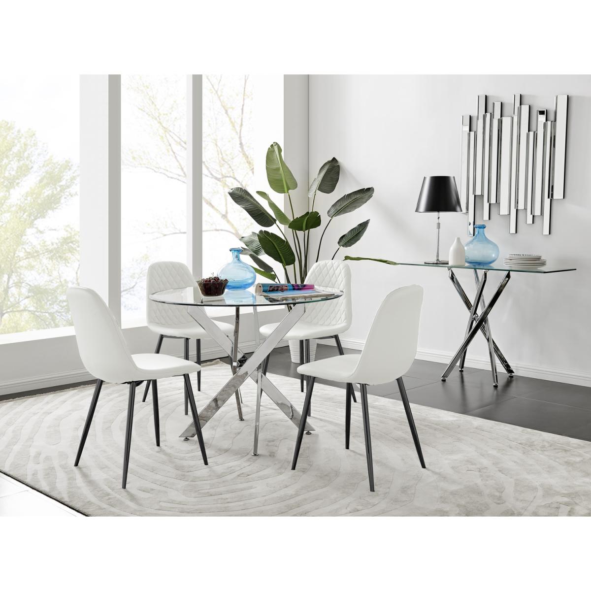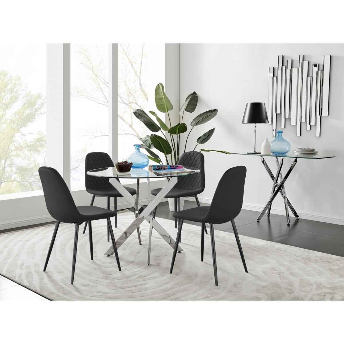 The strikingly elegant Novara dining table is a stylish and modern combination of chrome and glass, making this item a real eye-catcher. The chrome metal legs provide strong and sturdy support for the table, whilst the unique intertwined nest design exudes modern style. This table really is capable of being a centrepiece in any home! With a generous 100x100cm surface, you can dine in style with up to 4 guests. Styled with our statement Corona dining chairs, this set is a perfect balance of pattern and texture. The sleek black powder-coated legs of the Corona chairs are a great way to add a touch of minimalist style to your home. The Scandi-style faux leather seat with diamond pattern stitching is a unique take on a classic design offering comfort and durability for everyday use.