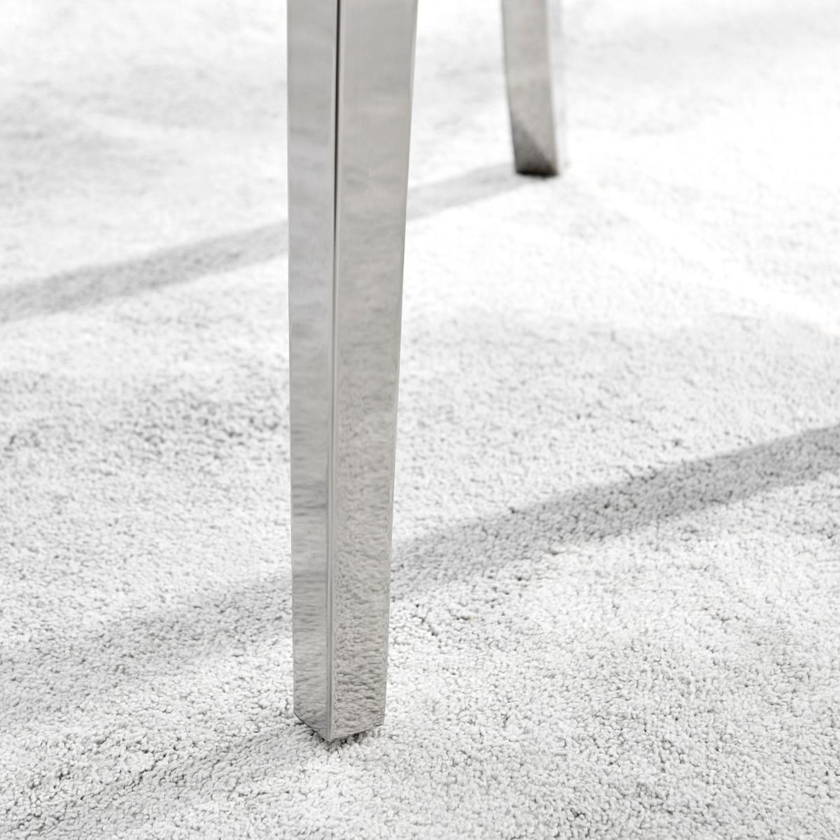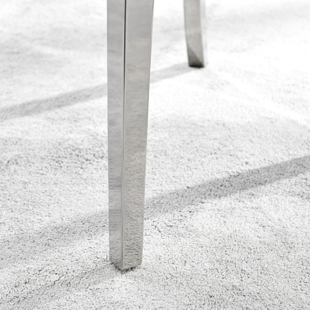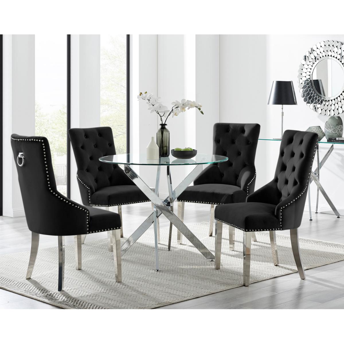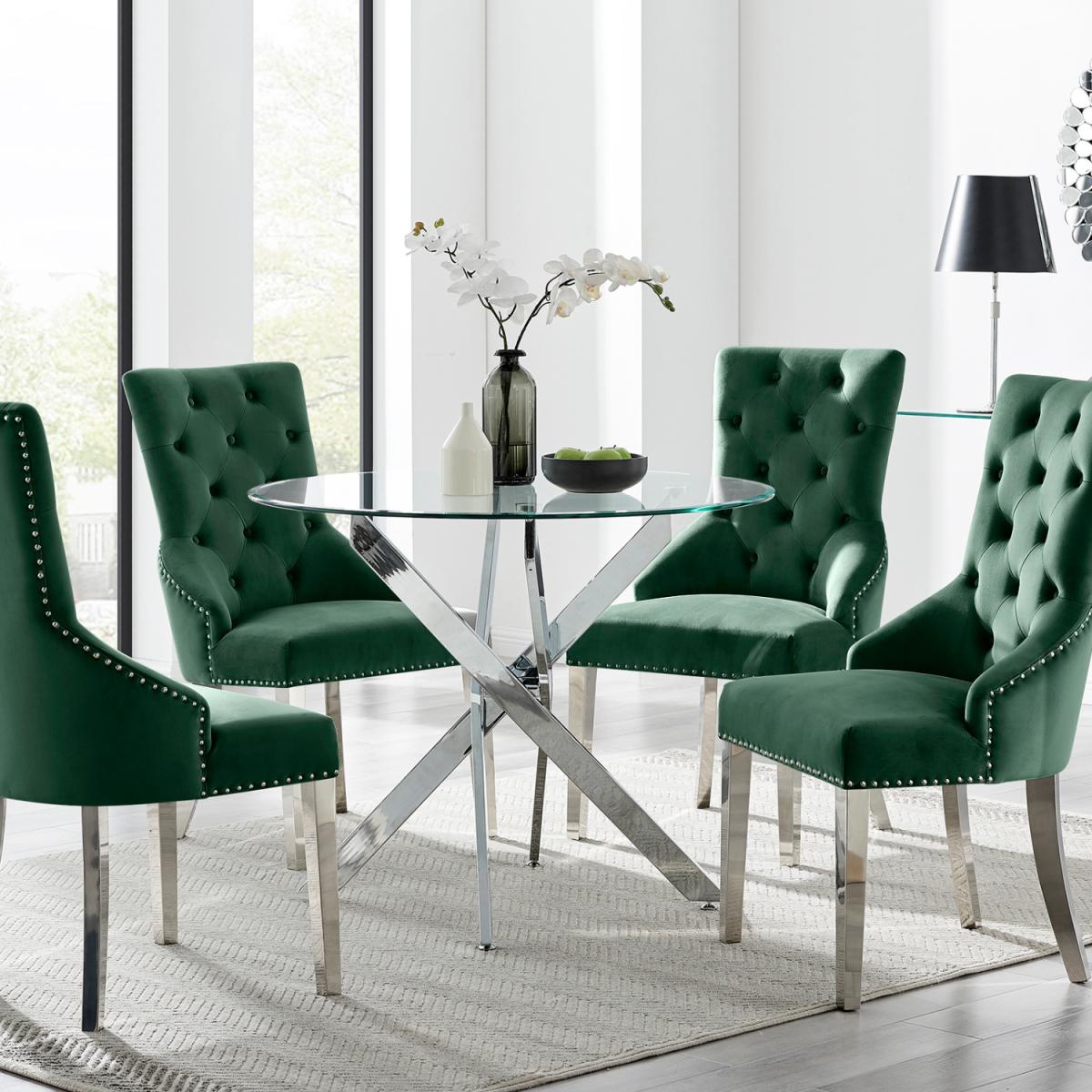 The strikingly elegant Novara dining table is a stylish and modern combination of chrome and glass, making this set a real eye-catcher. The chrome metal legs provide strong and sturdy support for the table, whilst the unique intertwined nest design exudes modern style. This table really is capable of being a centrepiece in any home! Paired with our beautiful faux leather Isco chairs to complete the look! The opulent Belgravia chairs provide a touch of luxury, with thickly padded velvet upholstery, and a striking knockback detail. Anyone for a lovely dinner party or some cocktails.