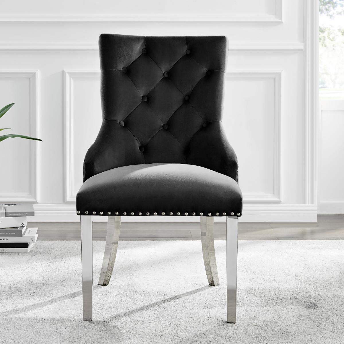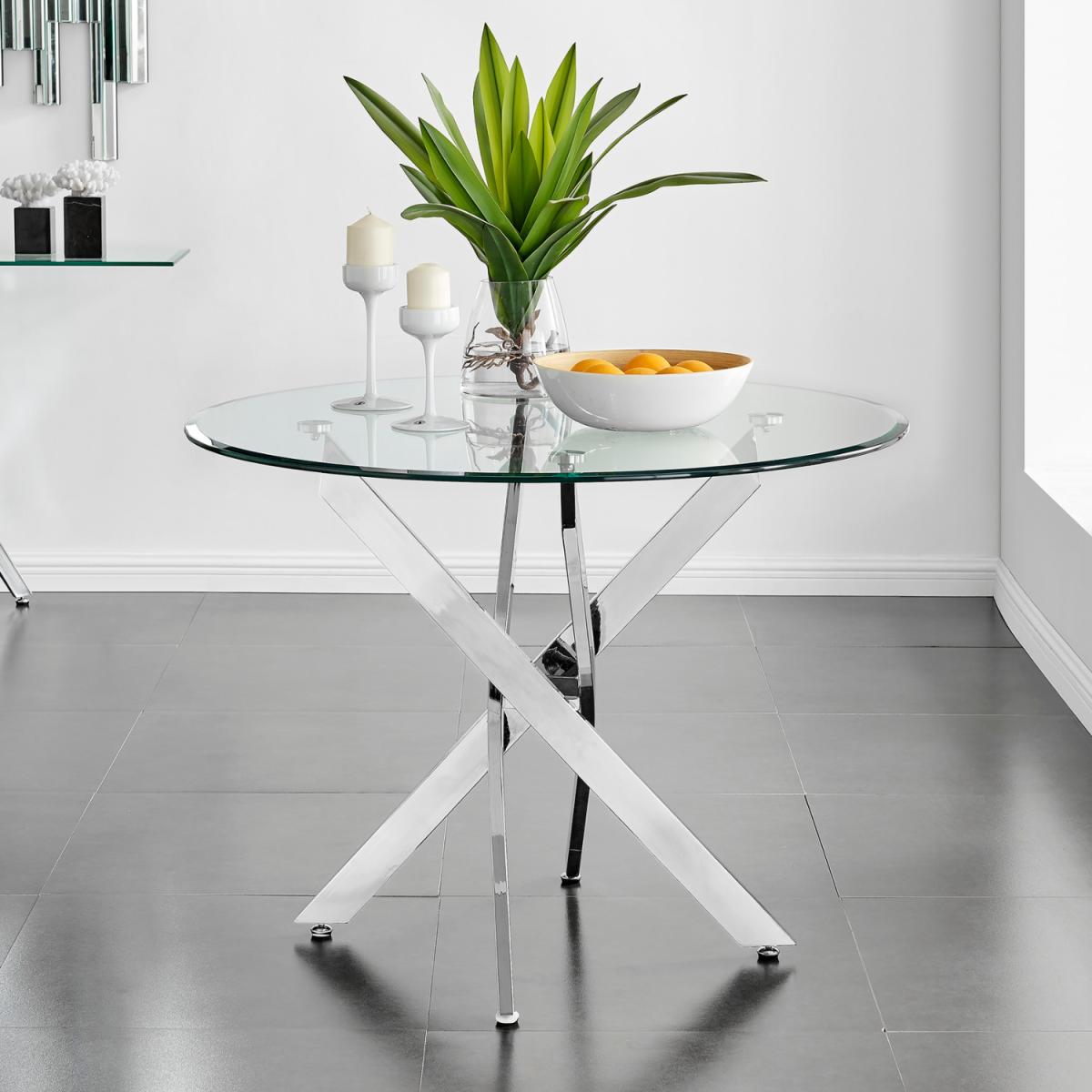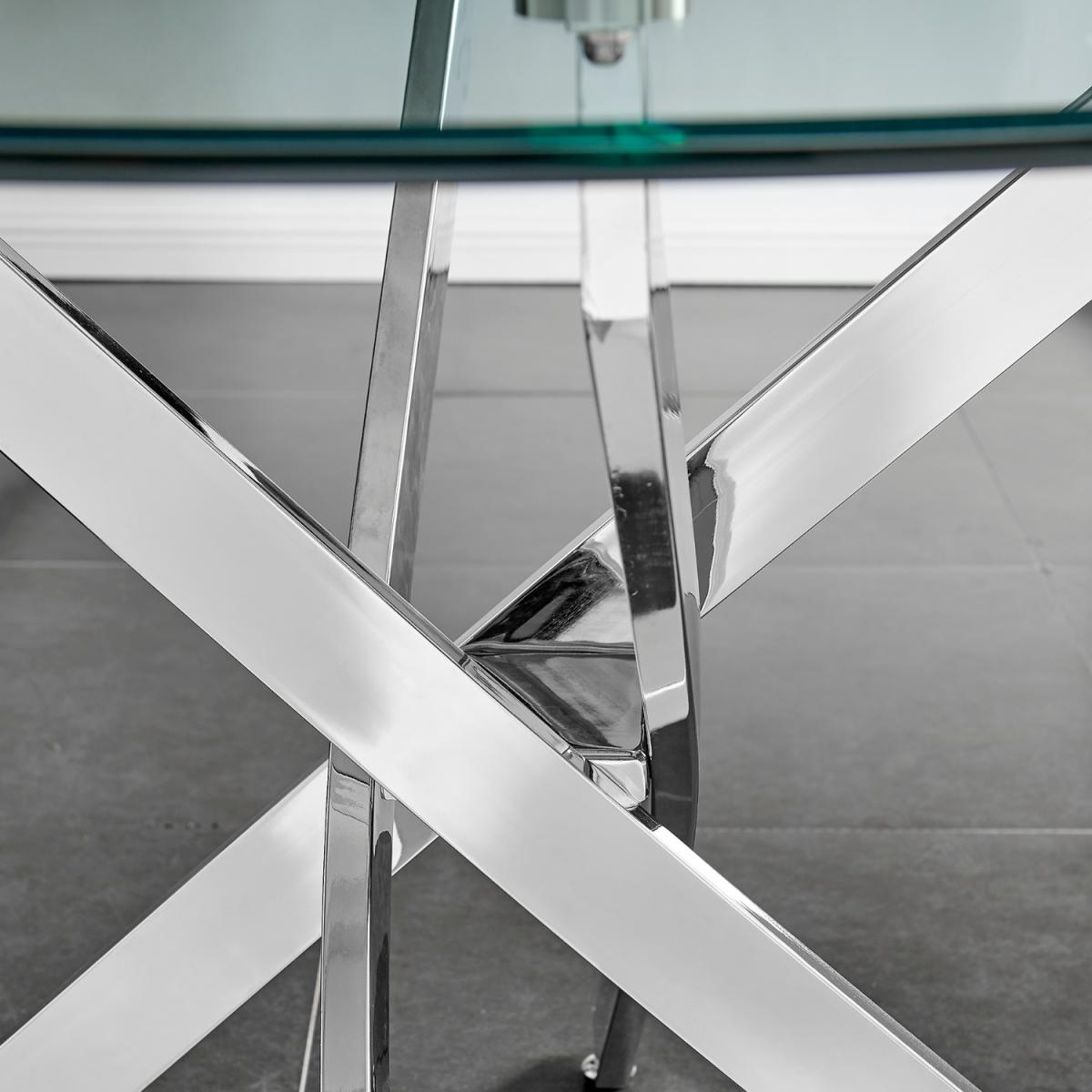 The strikingly elegant Novara dining table is a stylish and modern combination of chrome and glass, making this set a real eye-catcher. The chrome metal legs provide strong and sturdy support for the table, whilst the unique intertwined nest design exudes modern style. This table really is capable of being a centrepiece in any home! Paired with our beautiful faux leather Isco chairs to complete the look! The opulent Belgravia chairs provide a touch of luxury, with thickly padded velvet upholstery, and a striking knockback detail. Anyone for a lovely dinner party or some cocktails.