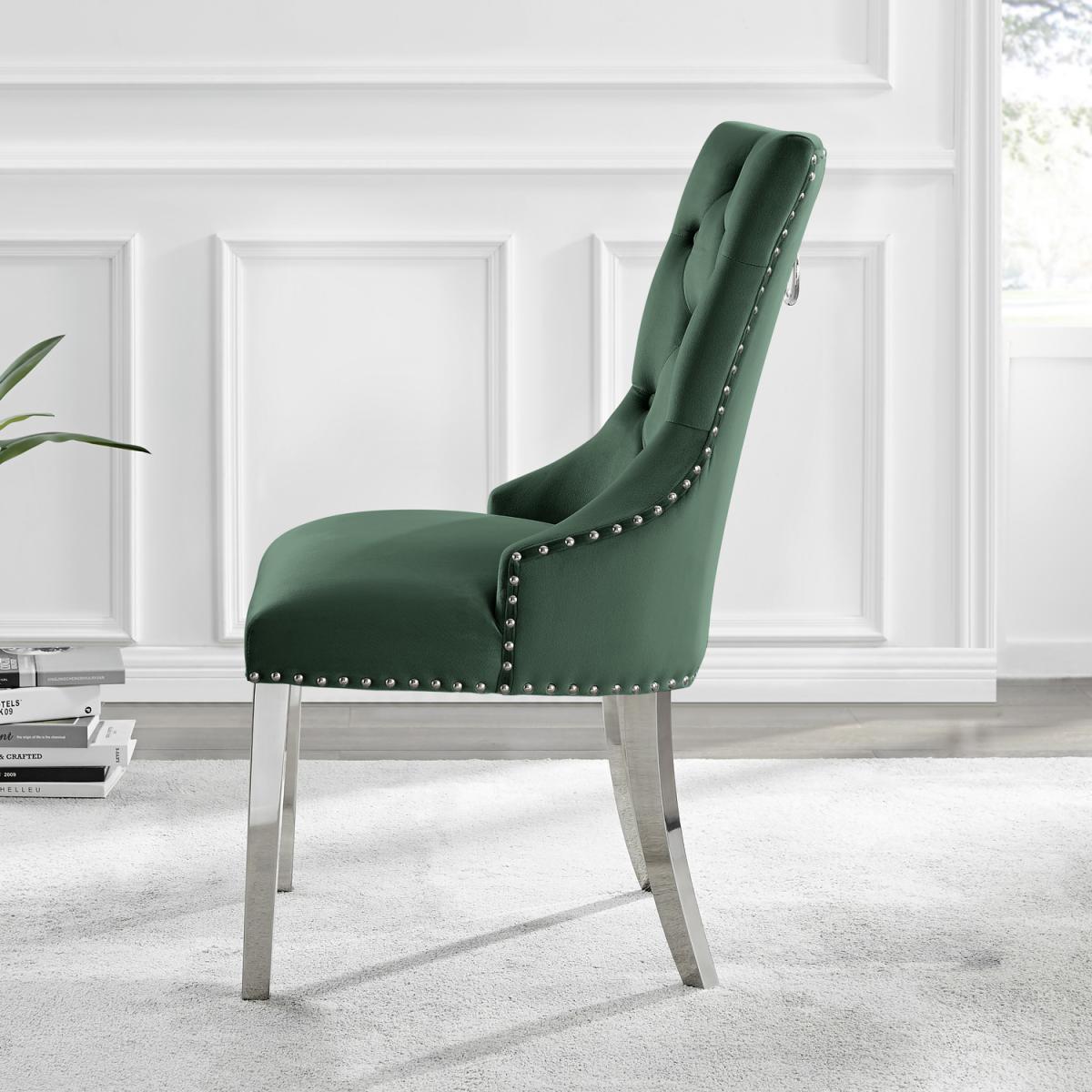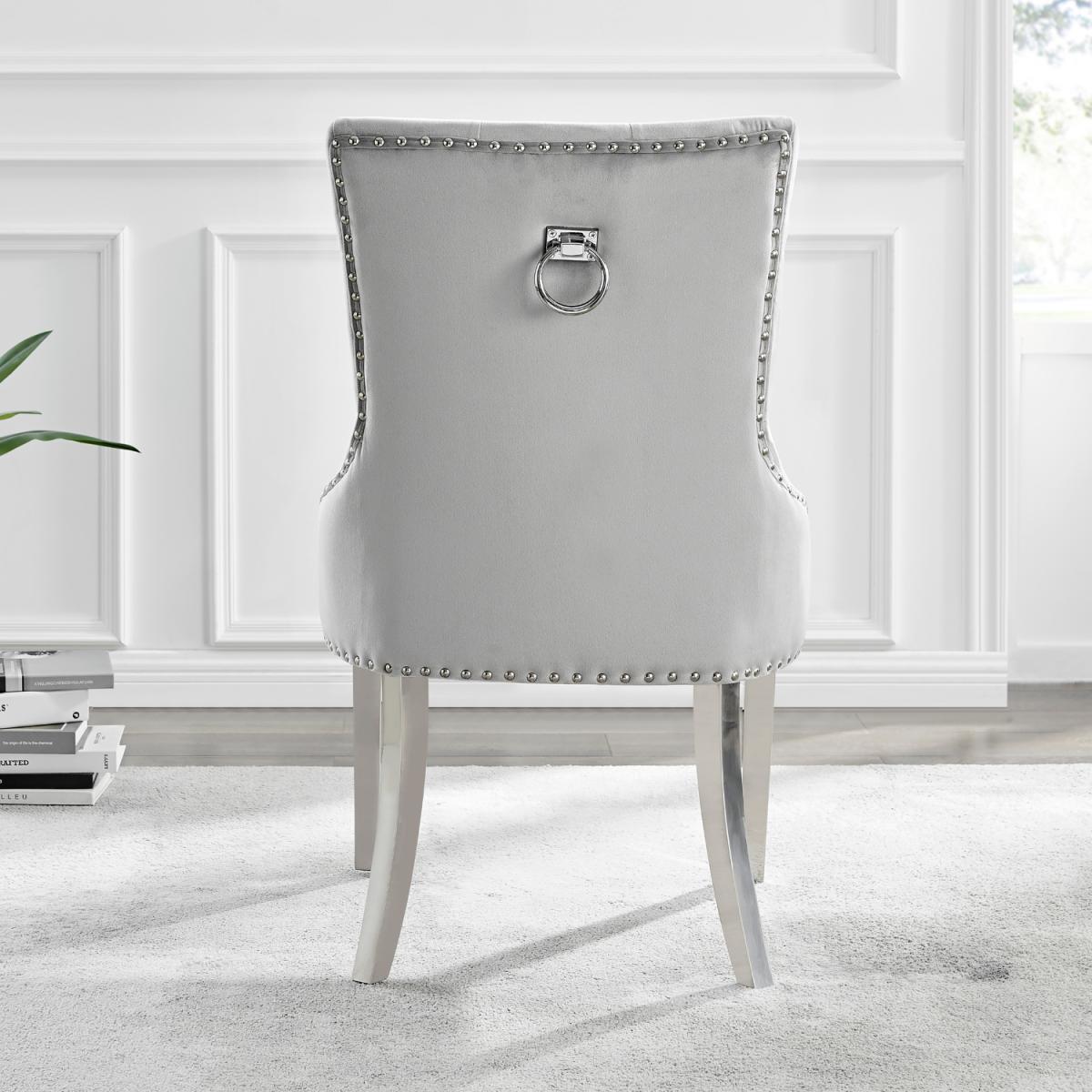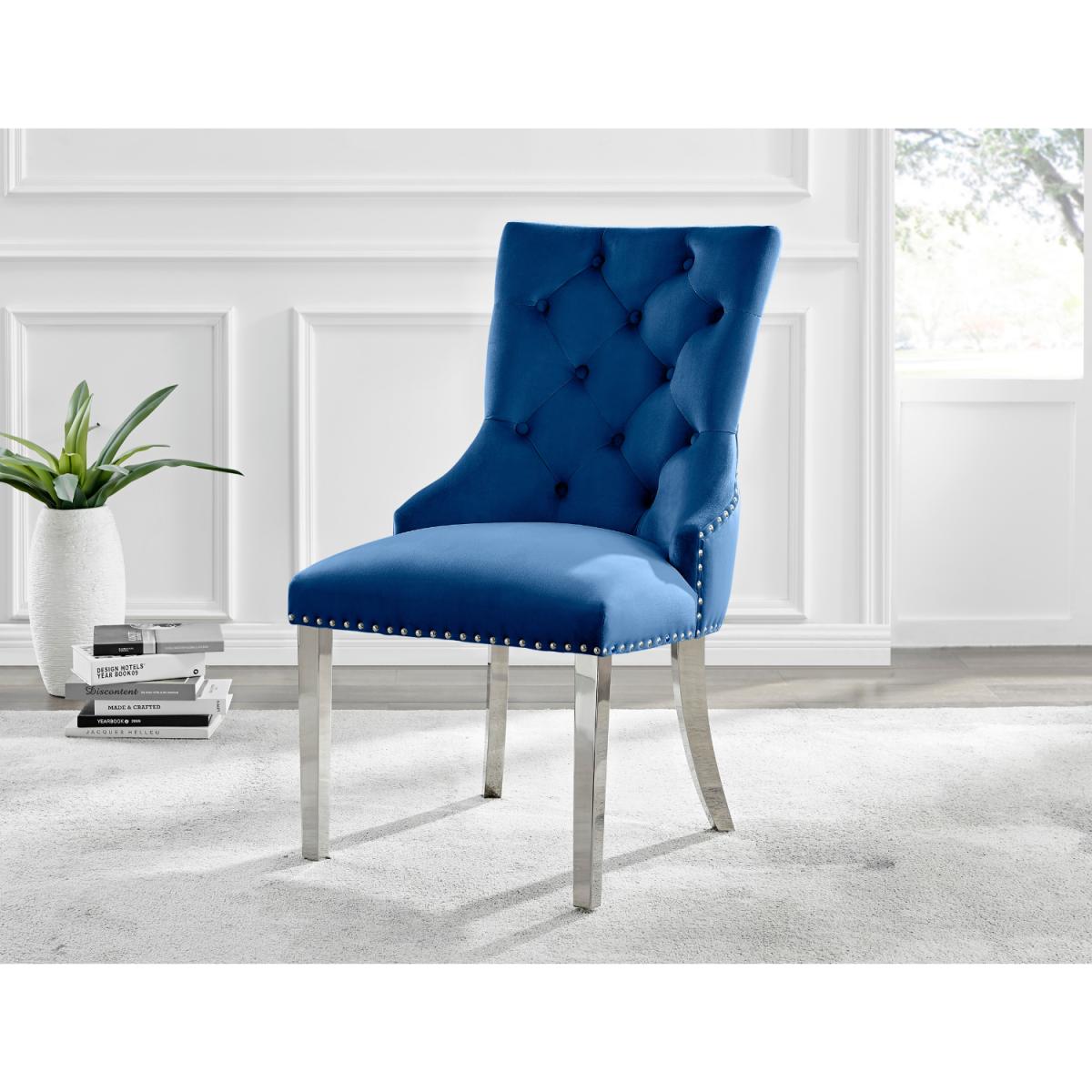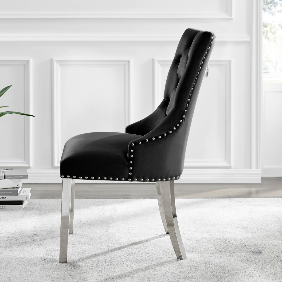 The strikingly elegant Novara dining table is a stylish and modern combination of chrome and glass, making this set a real eye-catcher. The chrome metal legs provide strong and sturdy support for the table, whilst the unique intertwined nest design exudes modern style. This table really is capable of being a centrepiece in any home! Paired with our beautiful faux leather Isco chairs to complete the look! The opulent Belgravia chairs provide a touch of luxury, with thickly padded velvet upholstery, and a striking knockback detail. Anyone for a lovely dinner party or some cocktails.