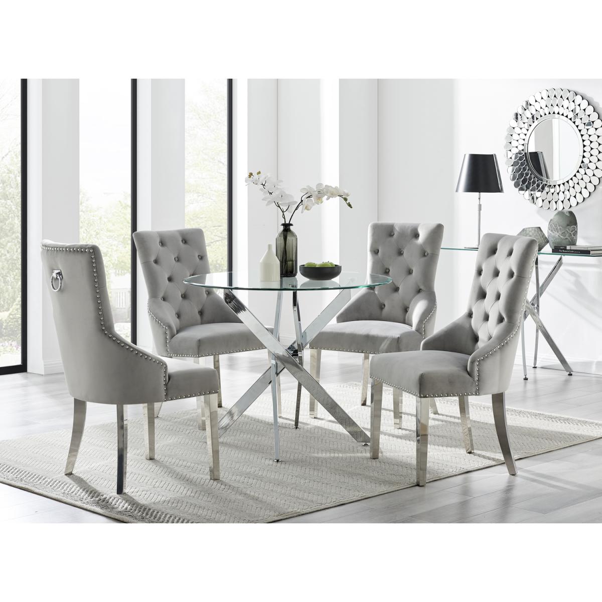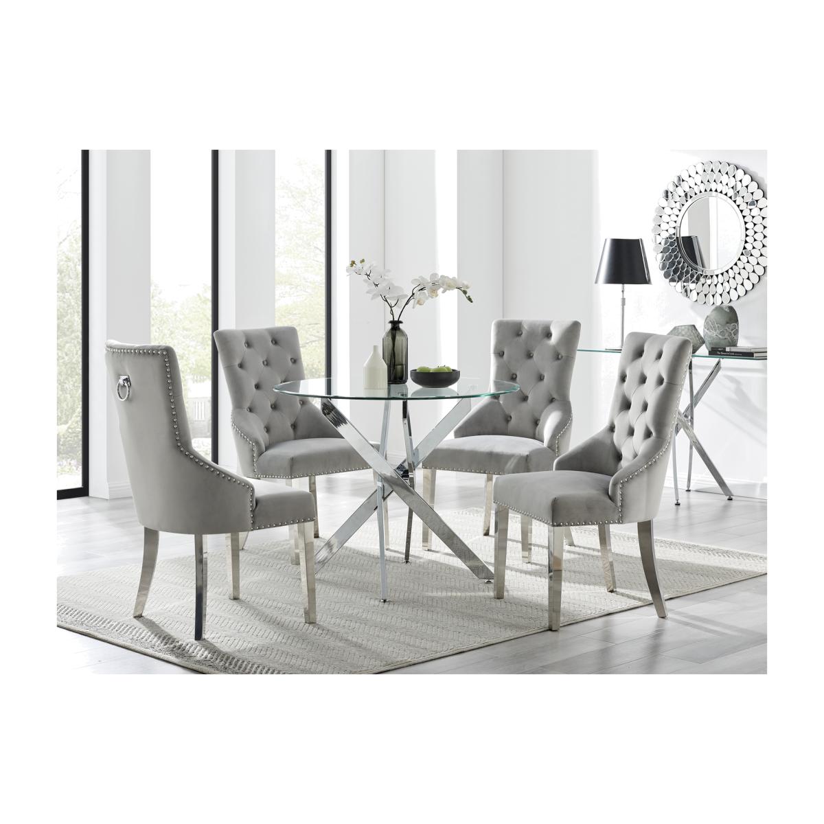 The strikingly elegant Novara dining table is a stylish and modern combination of chrome and glass, making this set a real eye-catcher. The chrome metal legs provide strong and sturdy support for the table, whilst the unique intertwined nest design exudes modern style. This table really is capable of being a centrepiece in any home! Paired with our beautiful faux leather Isco chairs to complete the look! The opulent Belgravia chairs provide a touch of luxury, with thickly padded velvet upholstery, and a striking knockback detail. Anyone for a lovely dinner party or some cocktails.