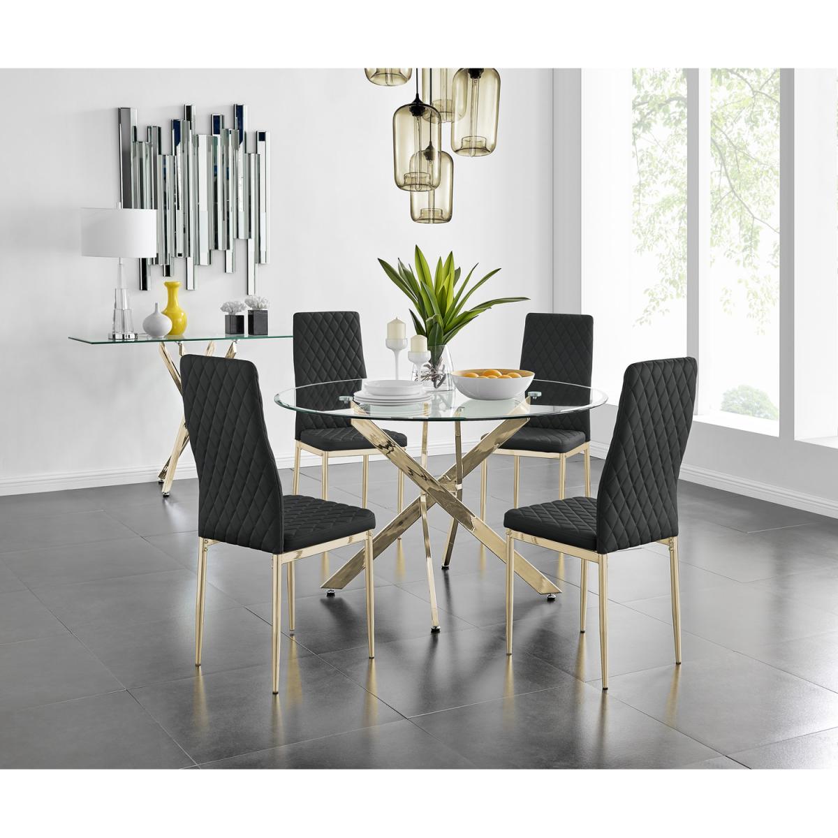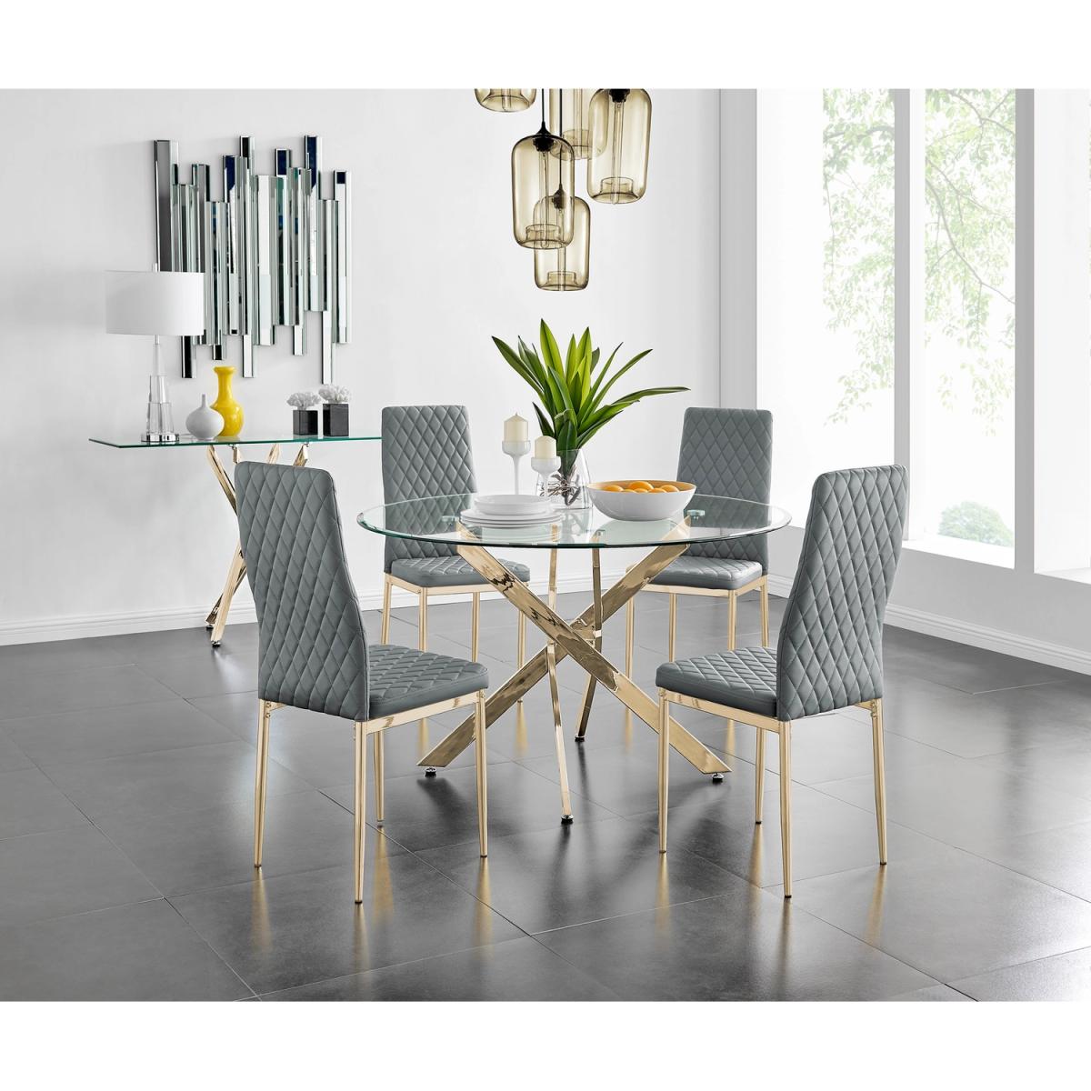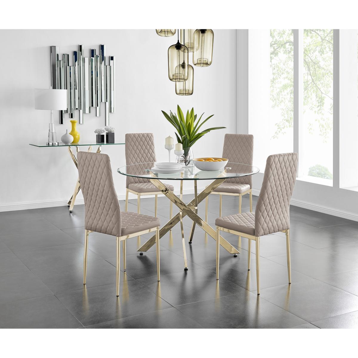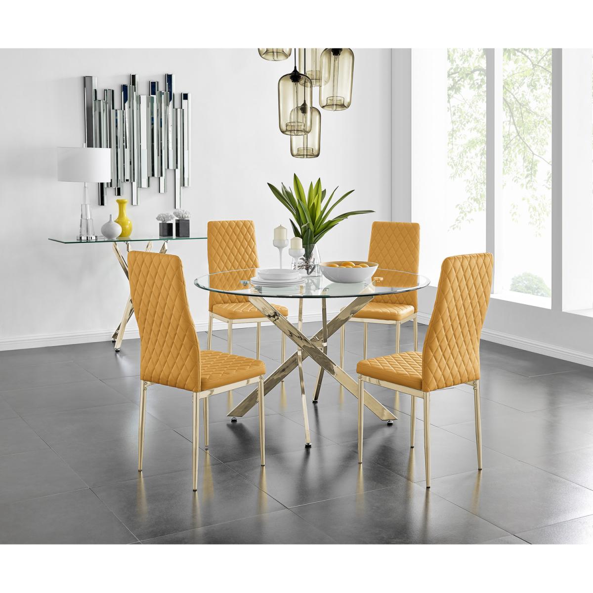 The strikingly elegant Novara dining table is a stylish and modern combination of gold chrome and glass, making this item a real eye-catcher. The gold metal legs provide strong and sturdy support for the table, whilst the unique intertwined nest design exudes modern style. This table really is capable of being a centrepiece in any home! With a generous 120x120cm surface, you can dine in style with up to 6 guests. Paired alongside our beautiful faux leather diamond quilted Milan dining chairs for a sophisticated contemporary look. The Milan chairs are made from high-quality faux leather with trendy gold effect legs and are ergonomically designed for maximum comfort and back support. Made for regular use, the protective plastic feet will protect your floor from any damage. Available in elephant grey, cappuccino grey, white, black or mustard to add your own personality and complete this gorgeous dining set.