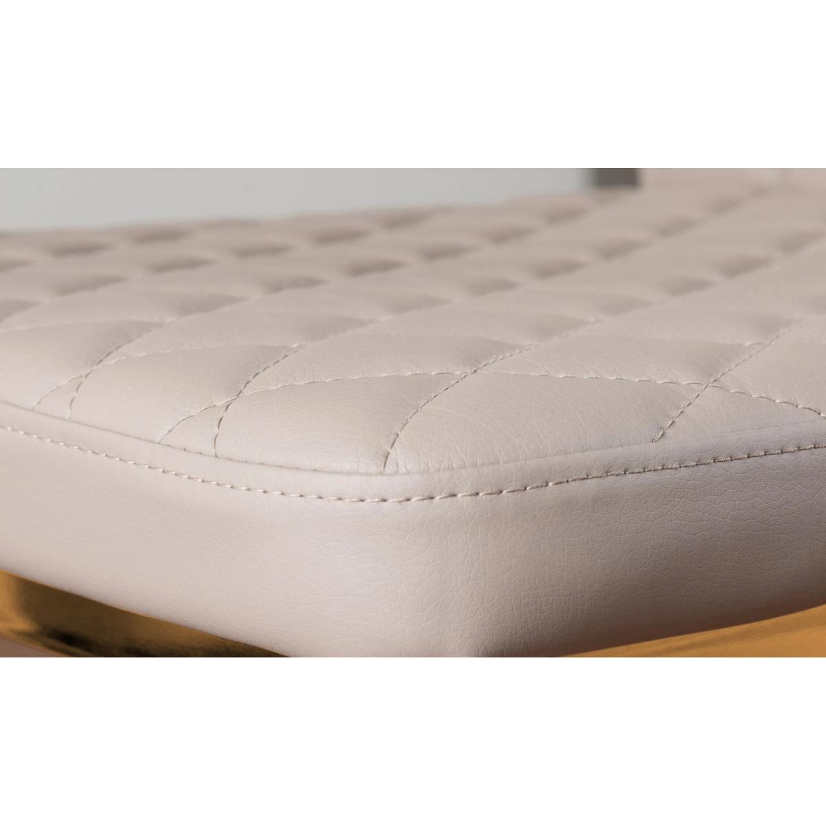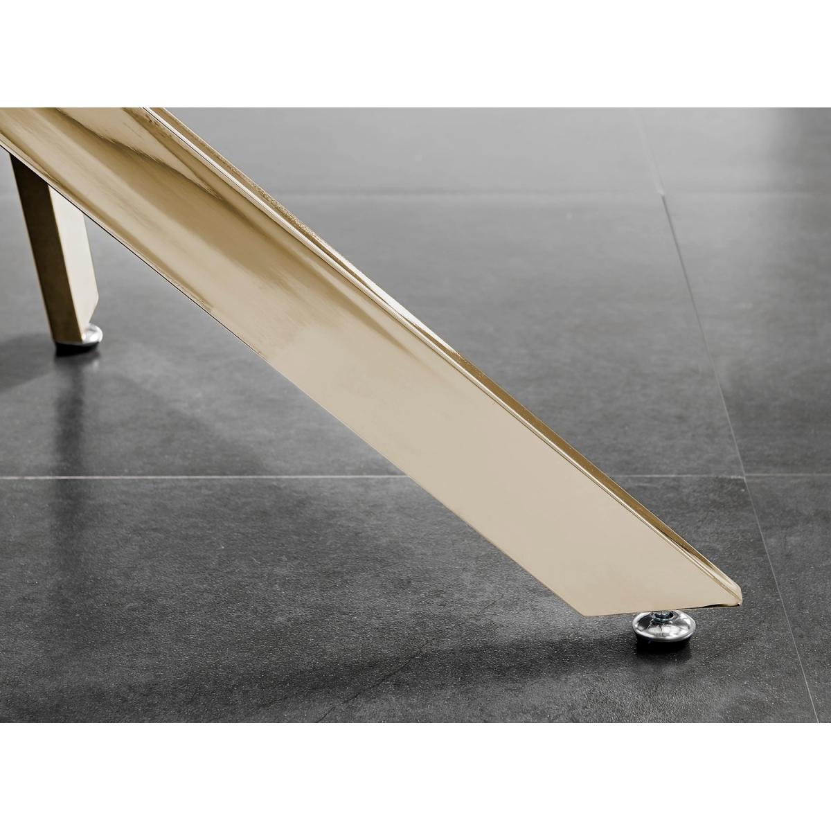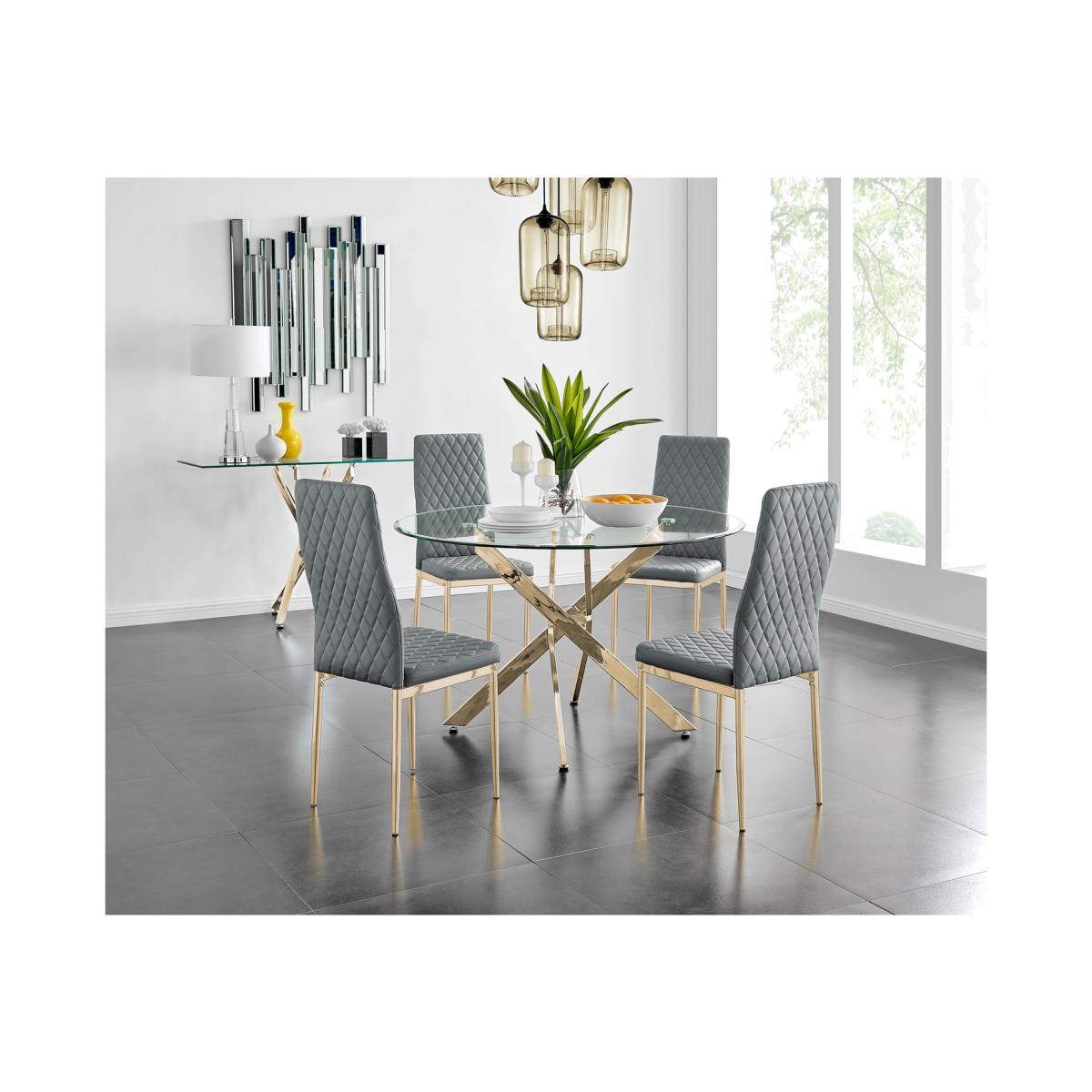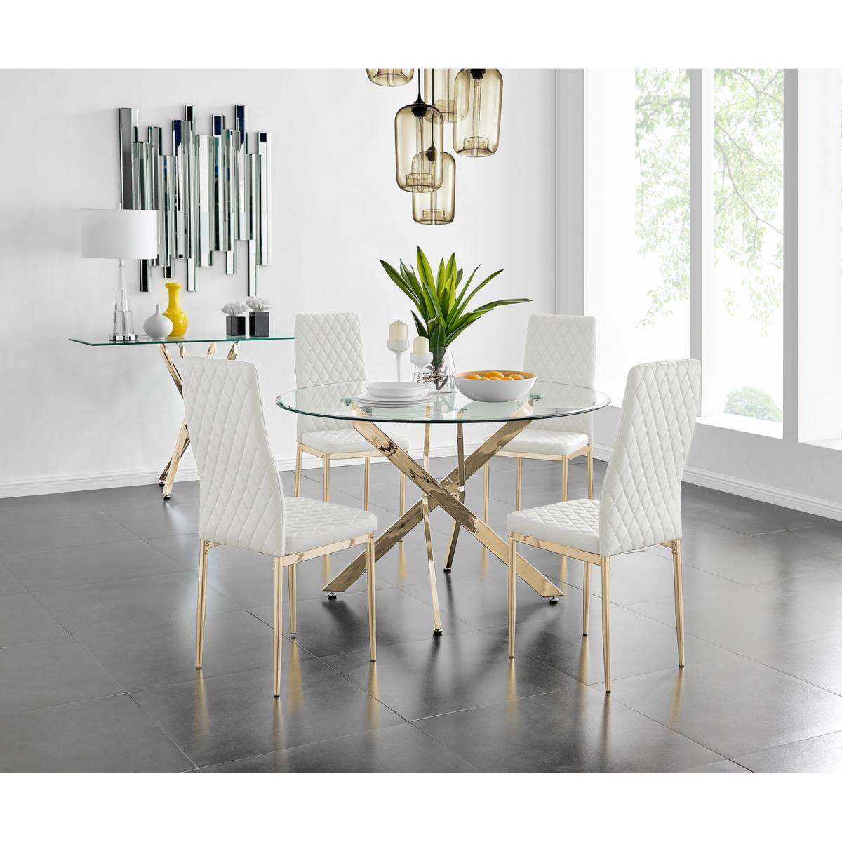 The strikingly elegant Novara dining table is a stylish and modern combination of gold chrome and glass, making this item a real eye-catcher. The gold metal legs provide strong and sturdy support for the table, whilst the unique intertwined nest design exudes modern style. This table really is capable of being a centrepiece in any home! With a generous 120x120cm surface, you can dine in style with up to 6 guests. Paired alongside our beautiful faux leather diamond quilted Milan dining chairs for a sophisticated contemporary look. The Milan chairs are made from high-quality faux leather with trendy gold effect legs and are ergonomically designed for maximum comfort and back support. Made for regular use, the protective plastic feet will protect your floor from any damage. Available in elephant grey, cappuccino grey, white, black or mustard to add your own personality and complete this gorgeous dining set.