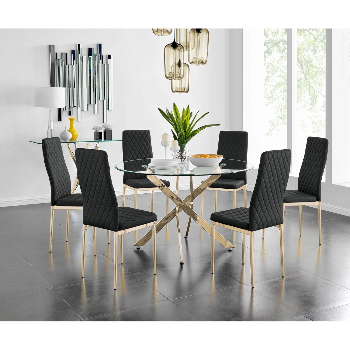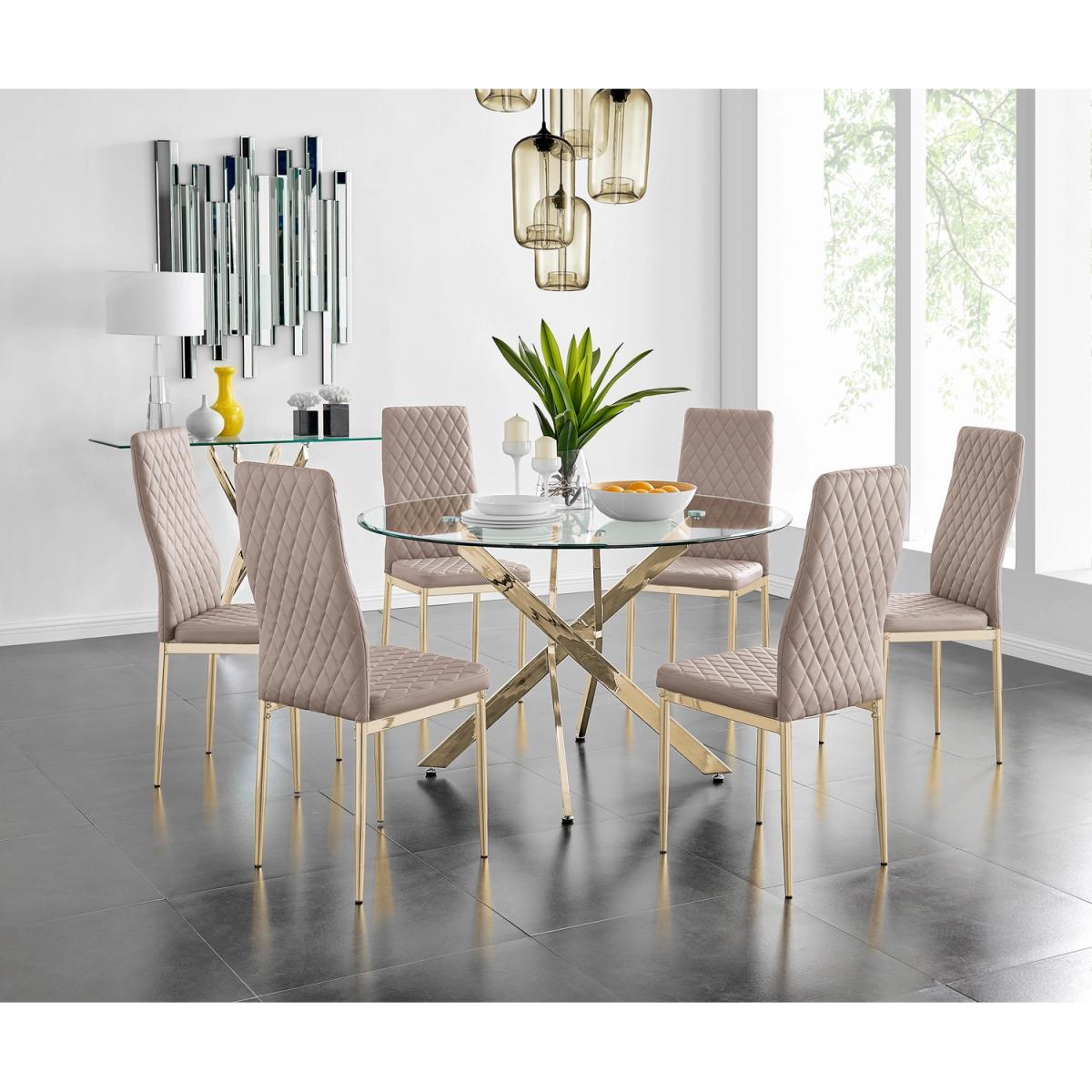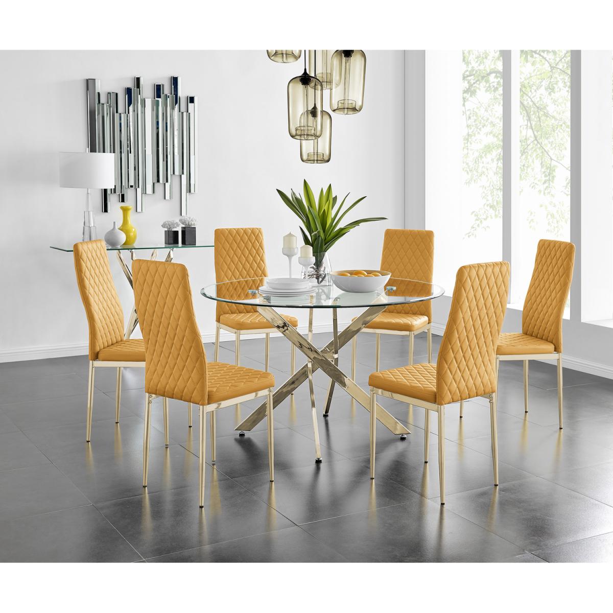 The strikingly elegant Novara dining table is a stylish and modern combination of gold chrome and glass, making this item a real eye-catcher. The gold metal legs provide strong and sturdy support for the table, whilst the unique intertwined nest design exudes modern style. This table is capable of being a centrepiece in any home! With a generous 120x120cm surface, you can dine in style with up to 6 guests. Paired alongside our beautiful faux leather diamond quilted Milan dining chairs for a sophisticated contemporary look. The Milan chairs are made from high-quality faux leather with trendy gold effect legs and are ergonomically designed for maximum comfort and back support. Made for regular use, the protective plastic feet will protect your floor from any damage. Available in elephant grey, cappuccino grey, white, black or mustard to add your personality and complete this gorgeous dining set.