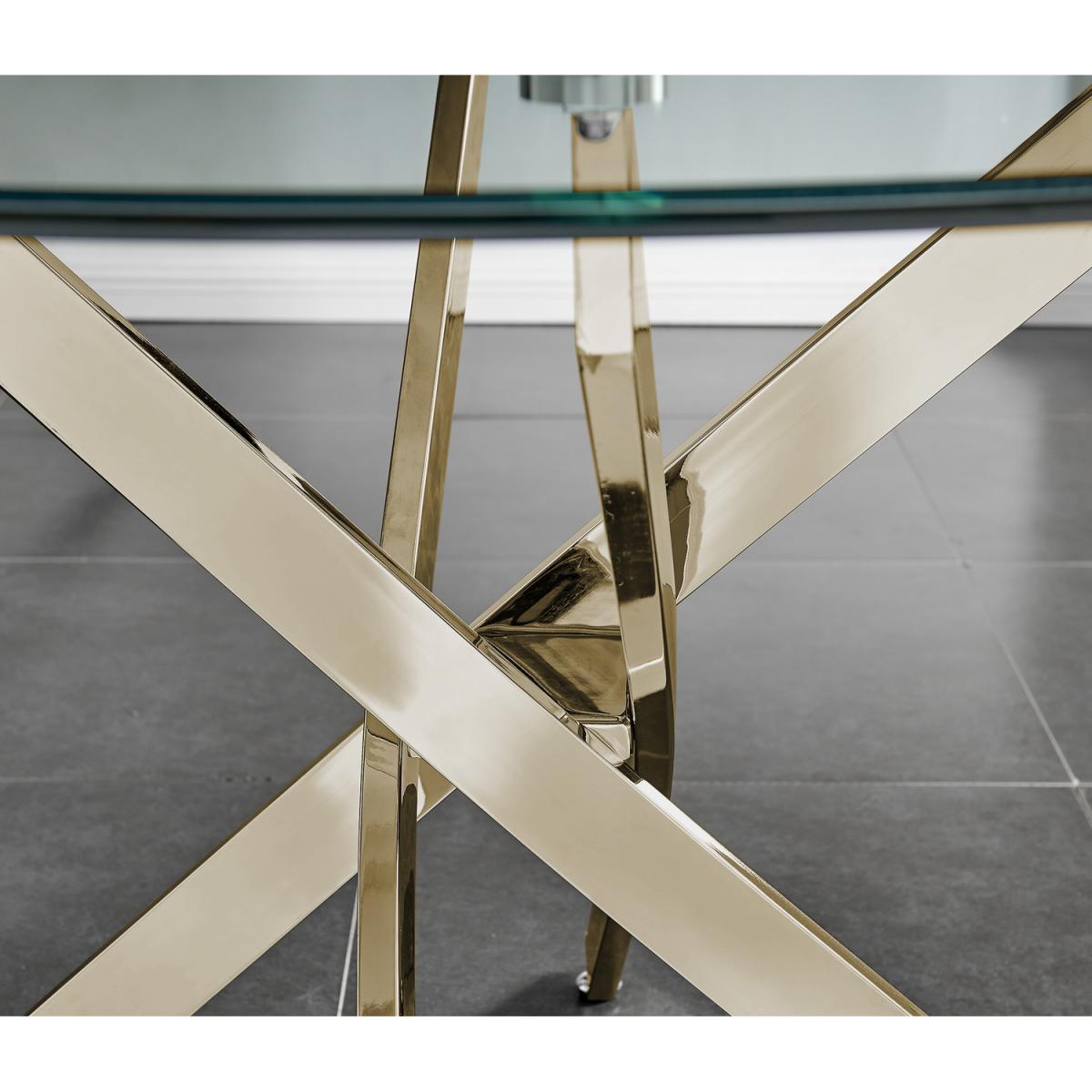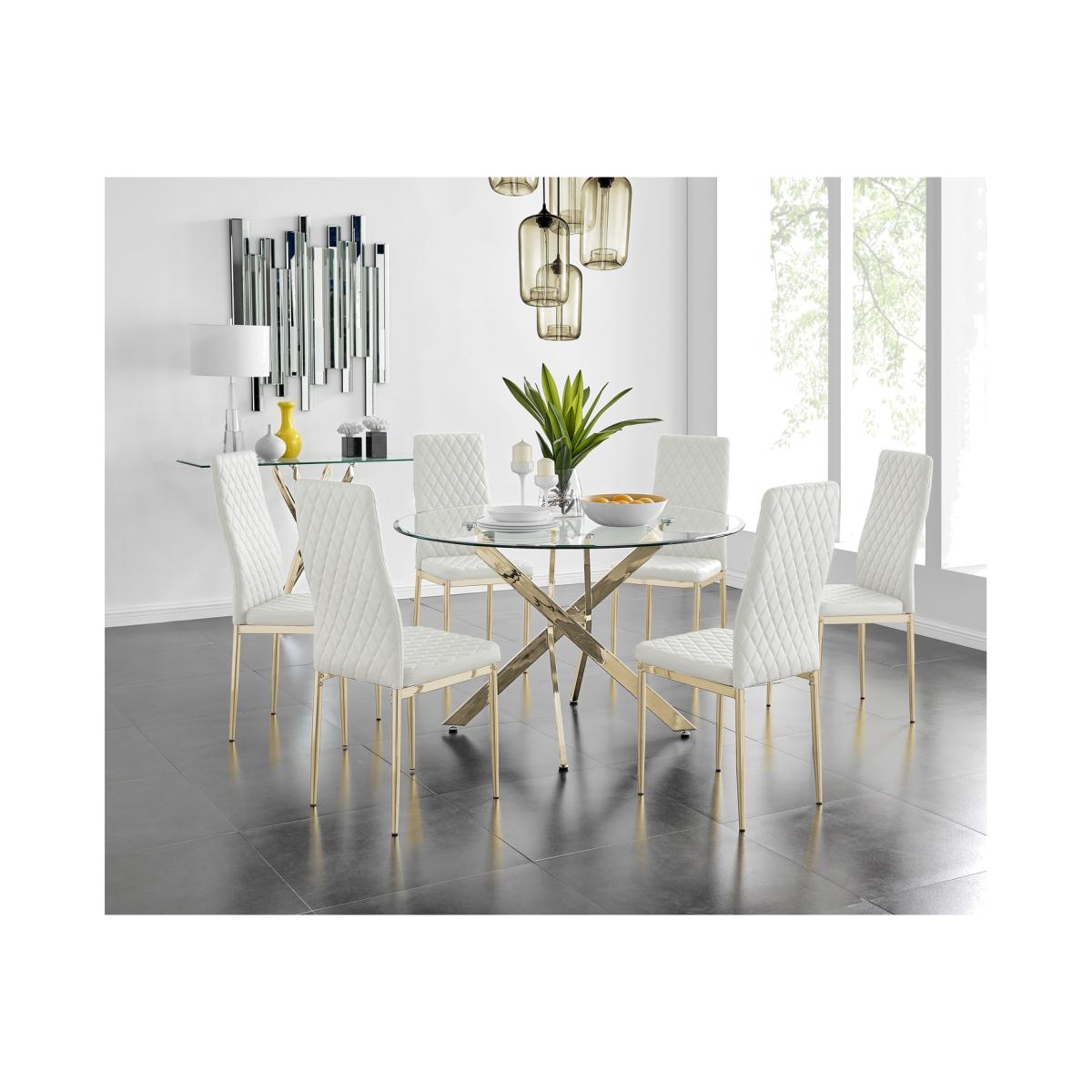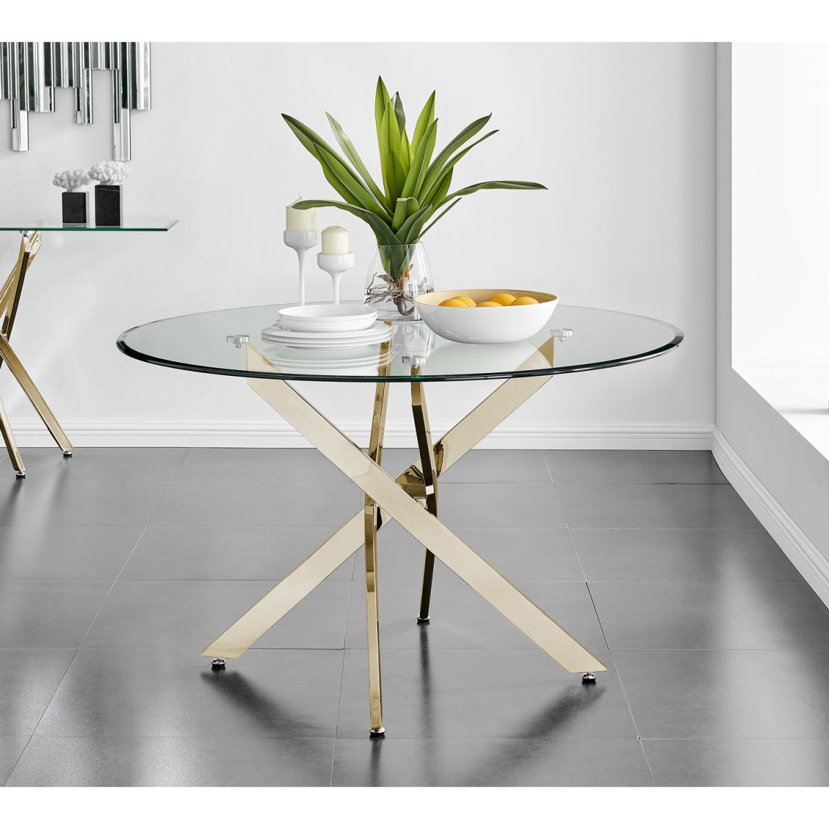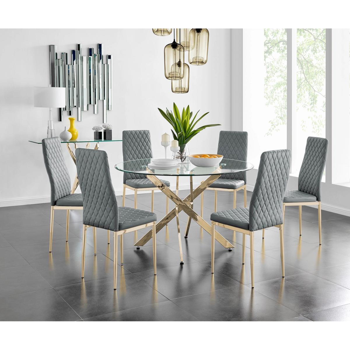 The strikingly elegant Novara dining table is a stylish and modern combination of gold chrome and glass, making this item a real eye-catcher. The gold metal legs provide strong and sturdy support for the table, whilst the unique intertwined nest design exudes modern style. This table is capable of being a centrepiece in any home! With a generous 120x120cm surface, you can dine in style with up to 6 guests. Paired alongside our beautiful faux leather diamond quilted Milan dining chairs for a sophisticated contemporary look. The Milan chairs are made from high-quality faux leather with trendy gold effect legs and are ergonomically designed for maximum comfort and back support. Made for regular use, the protective plastic feet will protect your floor from any damage. Available in elephant grey, cappuccino grey, white, black or mustard to add your personality and complete this gorgeous dining set.