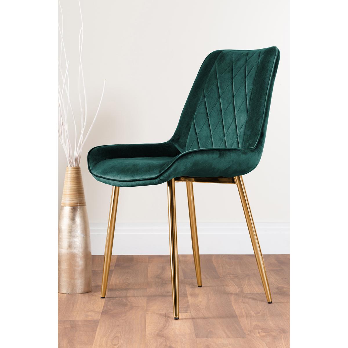 The strikingly elegant Novara dining table is a stylish and modern combination of gold chrome and glass, making this item a real eye-catcher. The gold metal legs provide strong and sturdy support for the table, whilst the unique intertwined nest design exudes modern style. This table is capable of being a centrepiece in any home! With a generous 120x120cm surface, you can dine in style with up to 6 guests. Combined with our luxurious velvet upholstered Pesaro dining chairs, this set will shout luxury and style! With a nod to the Mid-century modern design era, the Pesaro chairs feature gorgeous textured diamond stitching with an ergonomically designed curved seat pad blending seamlessly to the supporting medium-high backrest. Sat atop elegant slightly tapered gold effect legs, these chairs perfectly complement this luxury dining set.