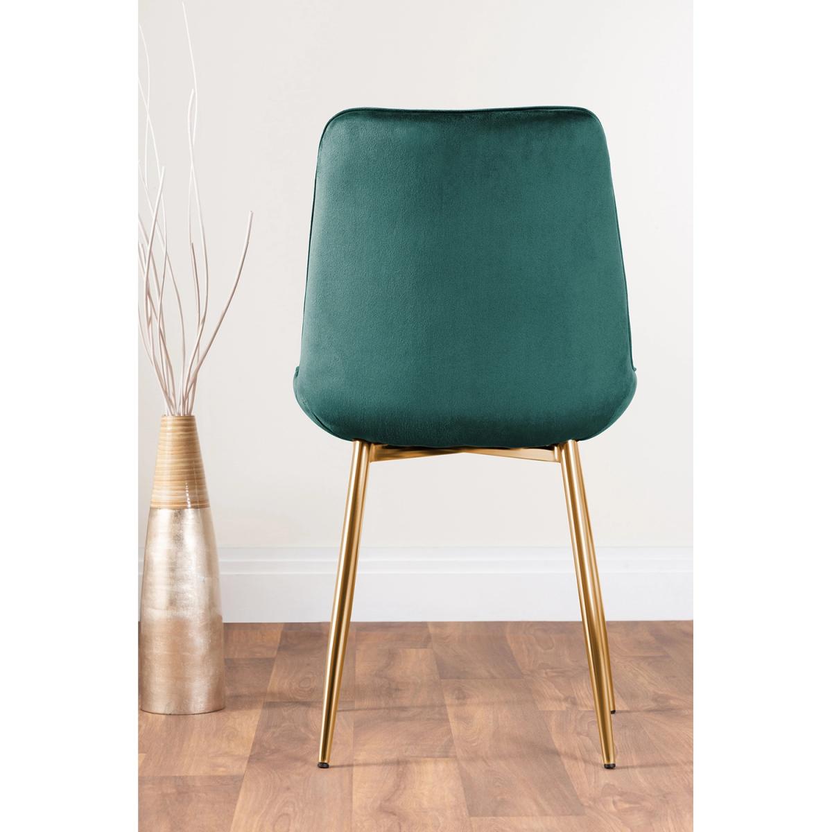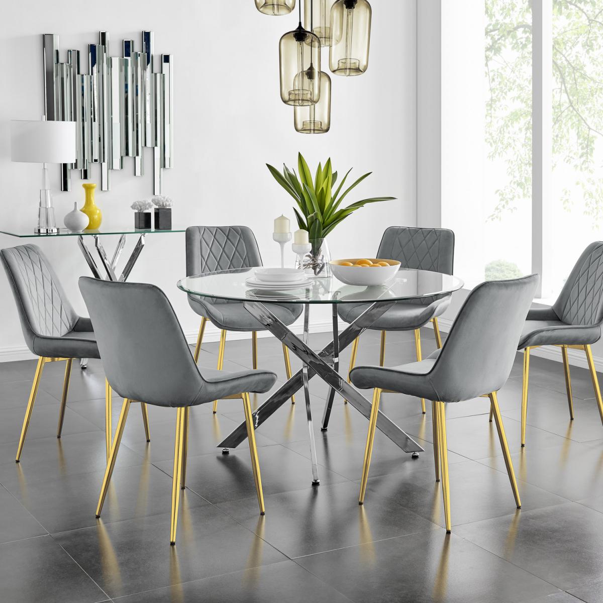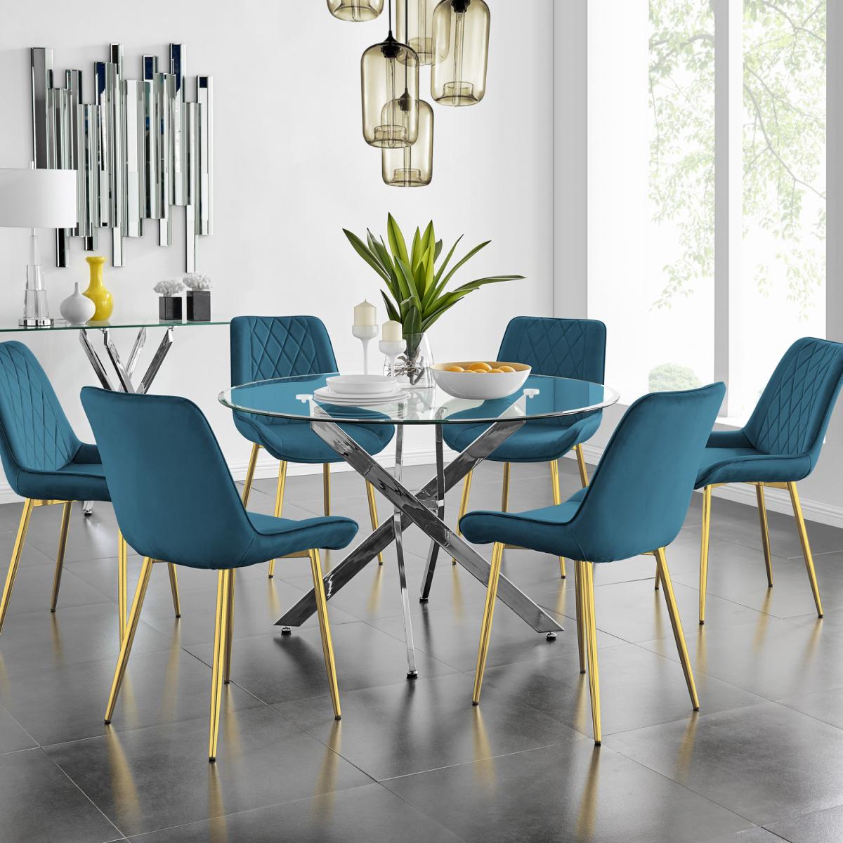The strikingly elegant Novara dining table is a stylish and modern combination of gold chrome and glass, making this item a real eye-catcher. The gold metal legs provide strong and sturdy support for the table, whilst the unique intertwined nest design exudes modern style. This table is capable of being a centrepiece in any home! With a generous 120x120cm surface, you can dine in style with up to 6 guests. Combined with our luxurious velvet upholstered Pesaro dining chairs, this set will shout luxury and style! With a nod to the Mid-century modern design era, the Pesaro chairs feature gorgeous textured diamond stitching with an ergonomically designed curved seat pad blending seamlessly to the supporting medium-high backrest. Sat atop elegant slightly tapered gold effect legs, these chairs perfectly complement this luxury dining set.