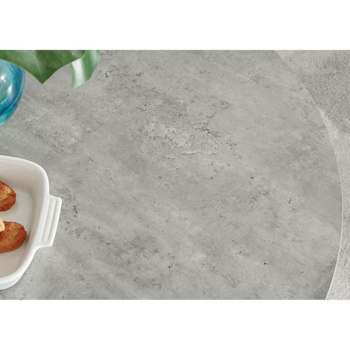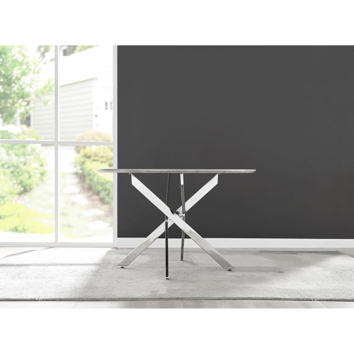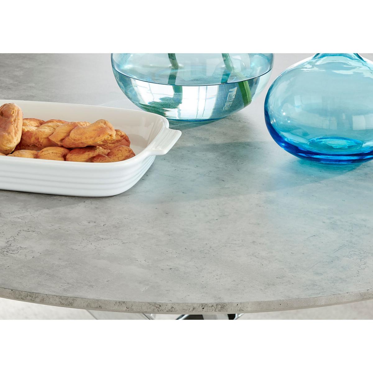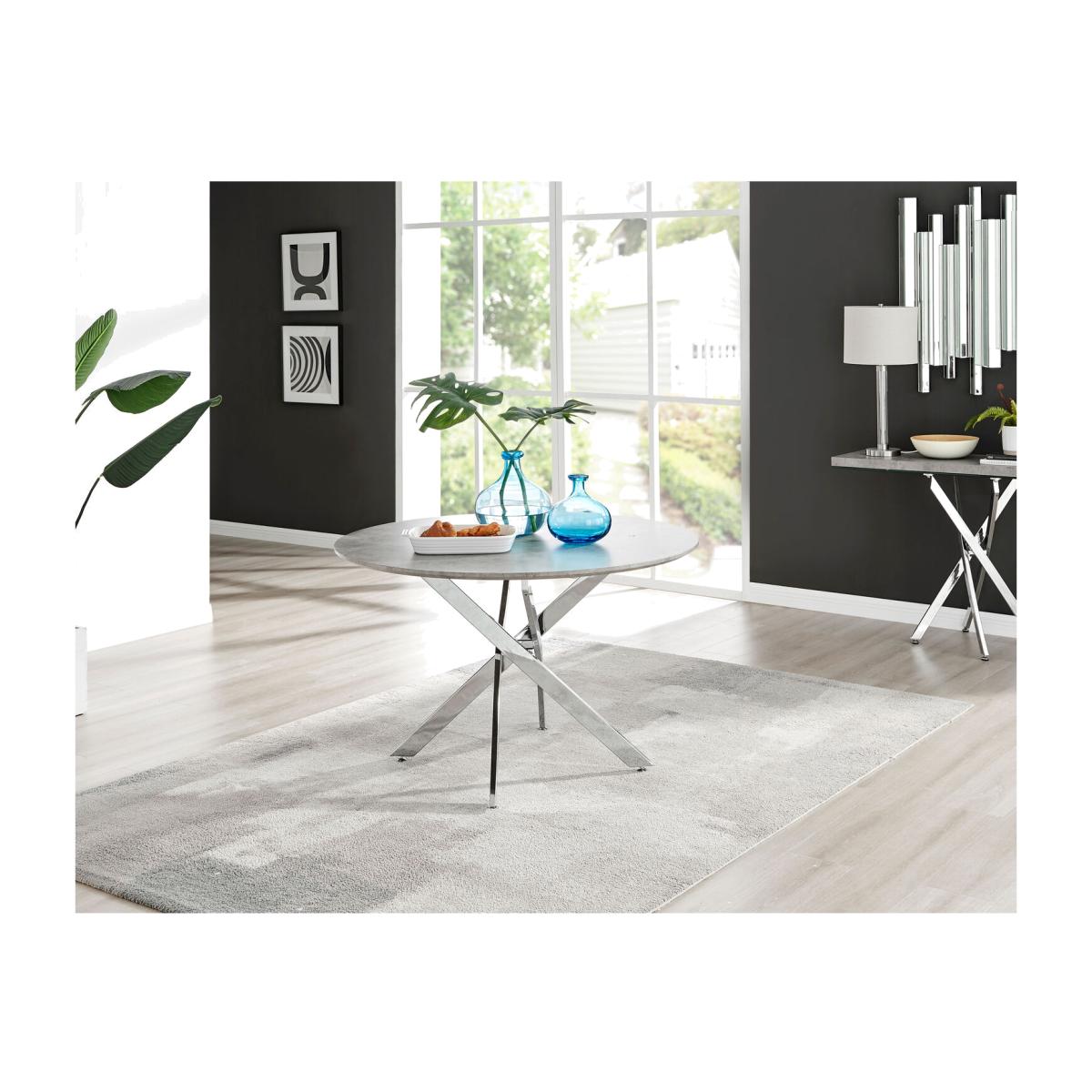 Our popular Novara round dining table here combines a super modern concrete effect tabletop with shiny silver chrome legs in an eye-catching nested starburst design. A sleek and minimalist dinner table that will bounce light around your dining area and create a sense of space. At 100cm across, this table is perfect for smaller spaces and more intimate, relaxed dining. At 120cm across, this table will comfortably seat up to 6, with round tables also being great for more intimate, relaxed dining and smaller spaces. The strong metal legs not only make this table a real central feature for your room but keep it sturdy. The grey concrete effect veneer is very on-trend right now and easy to wipe clean too, meaning your Novara will stay looking great for years to come. Also available in a smaller 100cm size with range of other leg and tabletop finishes, and with matching side tables, consoles and coffee tables, so be sure to check out the full Novara range!