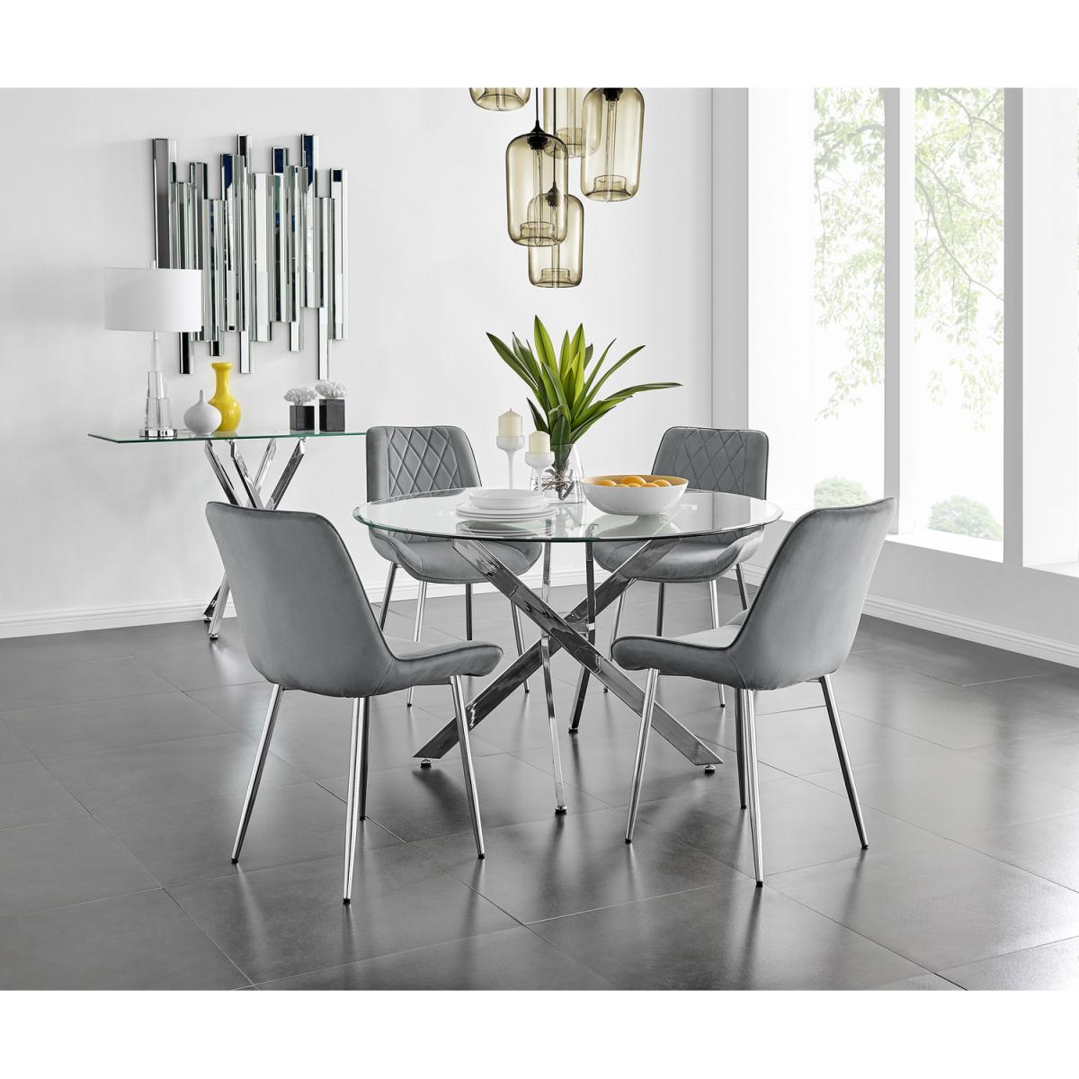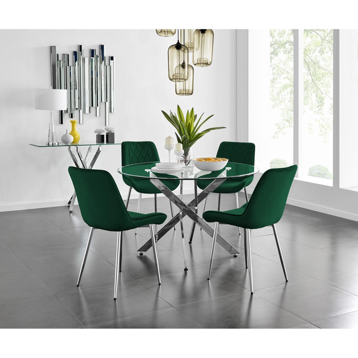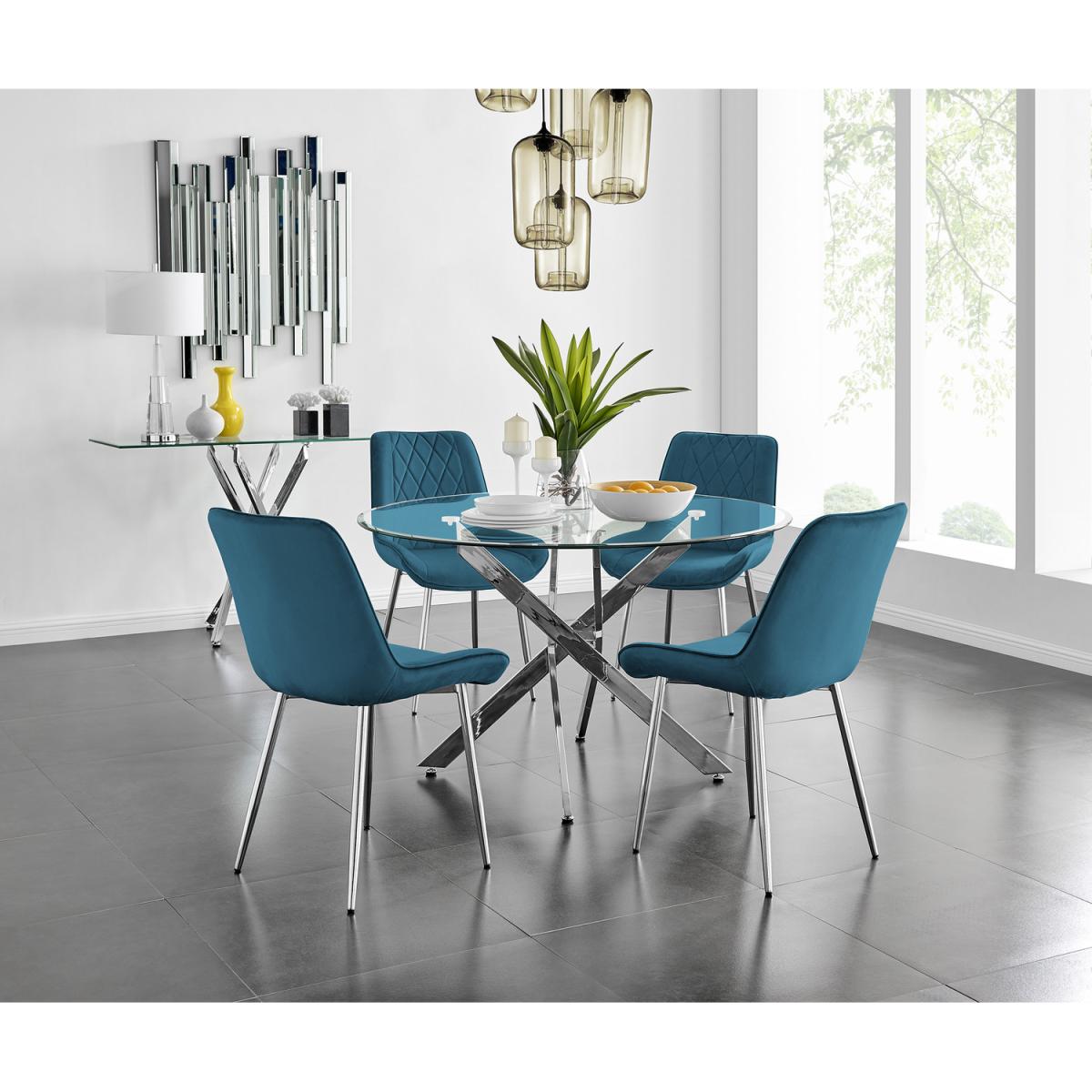 The strikingly elegant Novara dining table is a stylish and modern combination of chrome and glass, making this item a real eye-catcher. The chrome metal legs provide strong and sturdy support for the table, whilst the unique intertwined nest design exudes modern style. This table is capable of being a centrepiece in any home! With a generous 120x120cm surface, you can dine in style with up to 6 guests. Combined with our luxurious velvet upholstered Pesaro dining chairs, this set will shout luxury and style! With a nod to the Mid-century modern design era, the Pesaro chairs feature gorgeous textured diamond stitching with an ergonomically designed curved seat pad blending seamlessly to the supporting medium-high backrest. Sat atop elegant slightly tapered chrome legs, these chairs perfectly complement this luxury dining set.