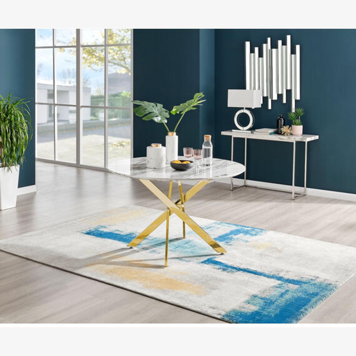 Our popular Novara round dining table here combines a super modern white marble effect tabletop with shiny gold chrome legs in an eye-catching nested starburst design. A sleek and minimalist dinner table that will bounce light around your dining area and create a sense of space. At 120cm across, this table will comfortably seat up to 6, with round tables also being great for more intimate, relaxed dining and smaller spaces. The strong metal legs not only make this table a real central feature for your room but keep it sturdy. The white marble effect veneer is very on-trend right now and easy to wipe clean too, meaning your Novara will stay looking great for years to come. Also available in a smaller 100cm size with range of other leg and tabletop finishes, and with matching side tables, consoles and coffee tables, so be sure to check out the full Novara range!