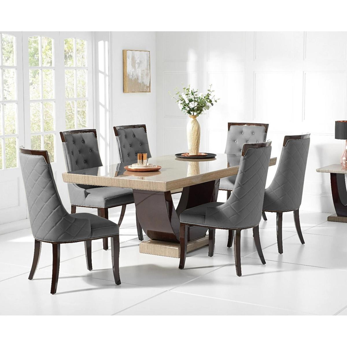 This dining set, featuring the Novara table, offers a sleek and sophisticated look thanks to its marble top and dark pedestal base, making it a great statement piece in modern or contemporary interiors. I love how the marble surface adds luxury without being overly formal, working well in both neutral-toned spaces and more adventurous, patterned rooms. The grey Francesca chairs bring a soft, neutral contrast that helps create a calm, inviting dining atmosphere. For styling tips, consider layering with textured table mats or colourful bowls to add interest, and incorporate greenery or statement lighting for extra character. It’s versatile enough to suit open-plan living areas or more intimate dining rooms, making it a practical yet stylish choice.