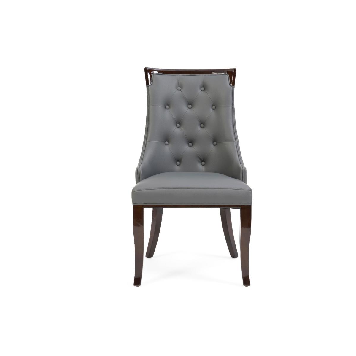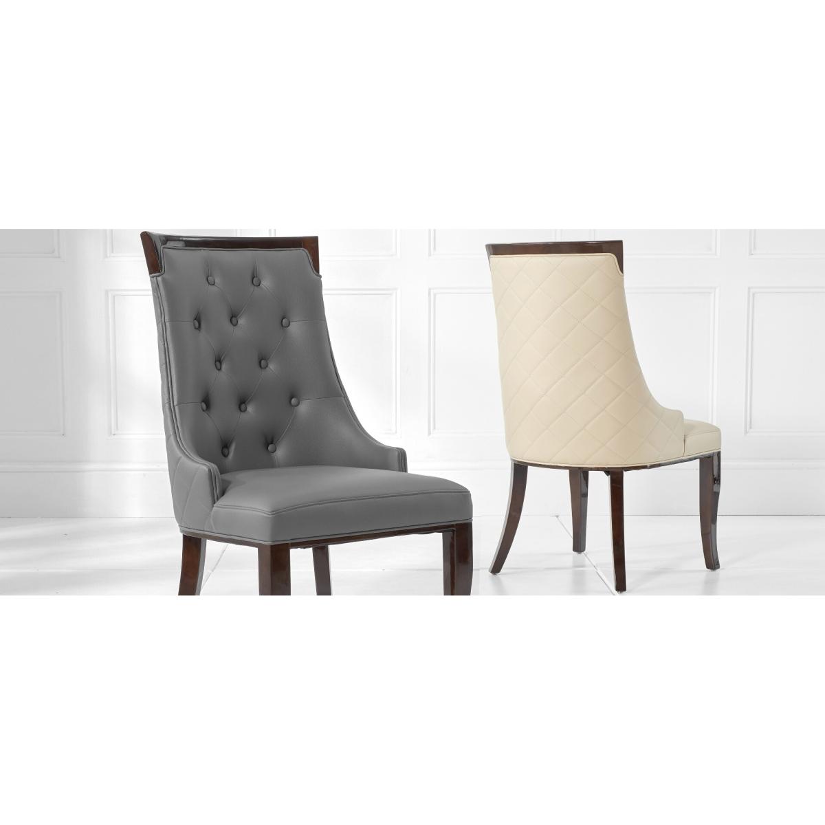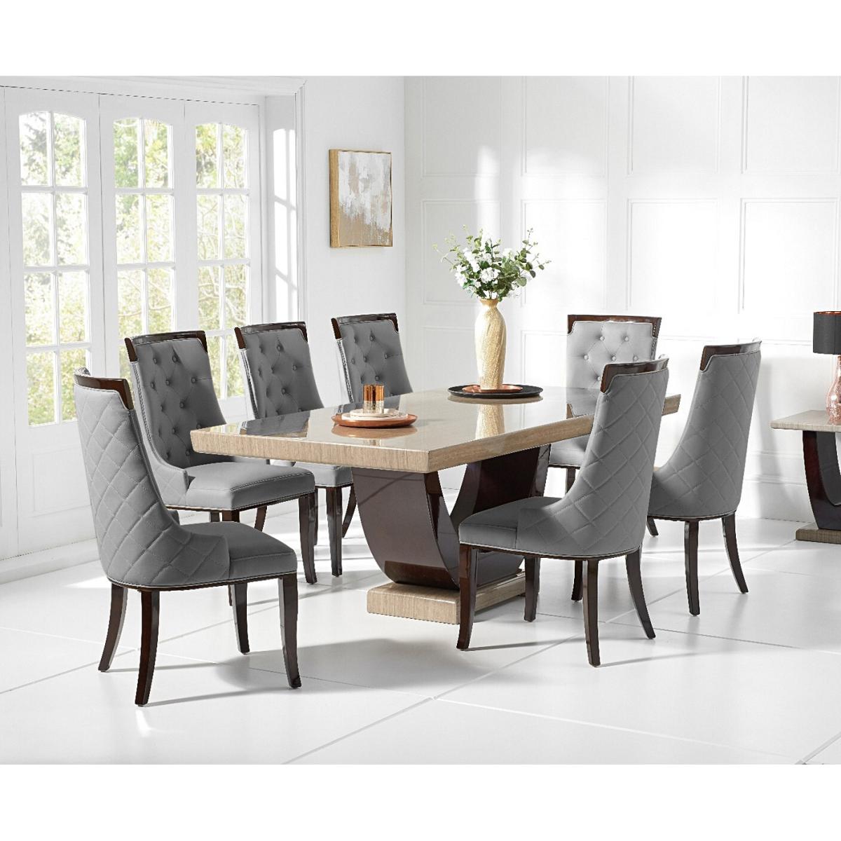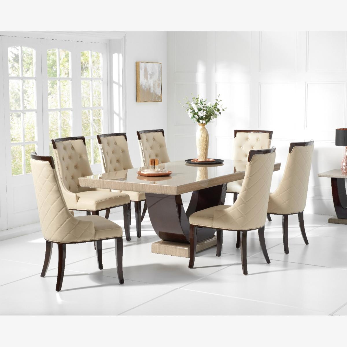 The Novara 200cm Brown Pedestal large Marble Dining Table with Francesca Dining Chairs seats 8 diners. The large marble dining table is complemented by faux leather chairs in grey or cream.