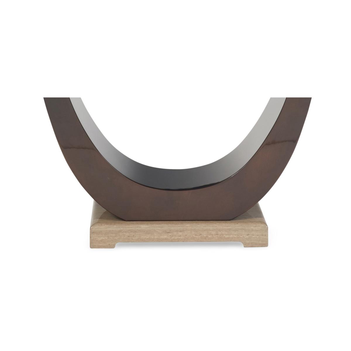 The Novara dining table features a smooth, brown curves of a sculptural pedestal that rests on top of a charming marble base.