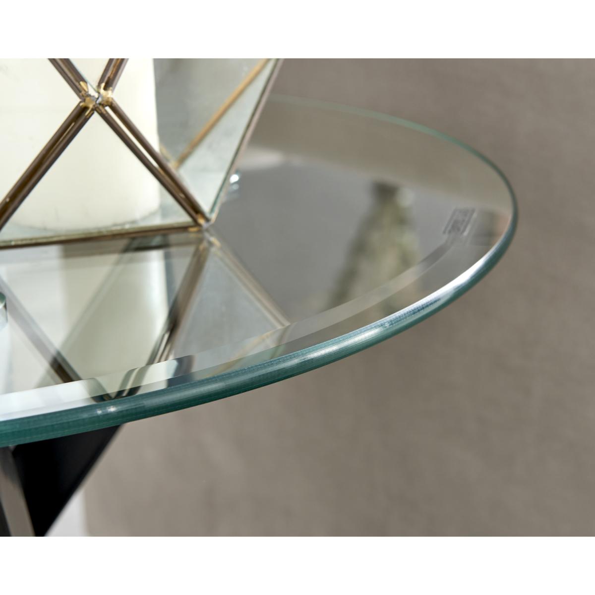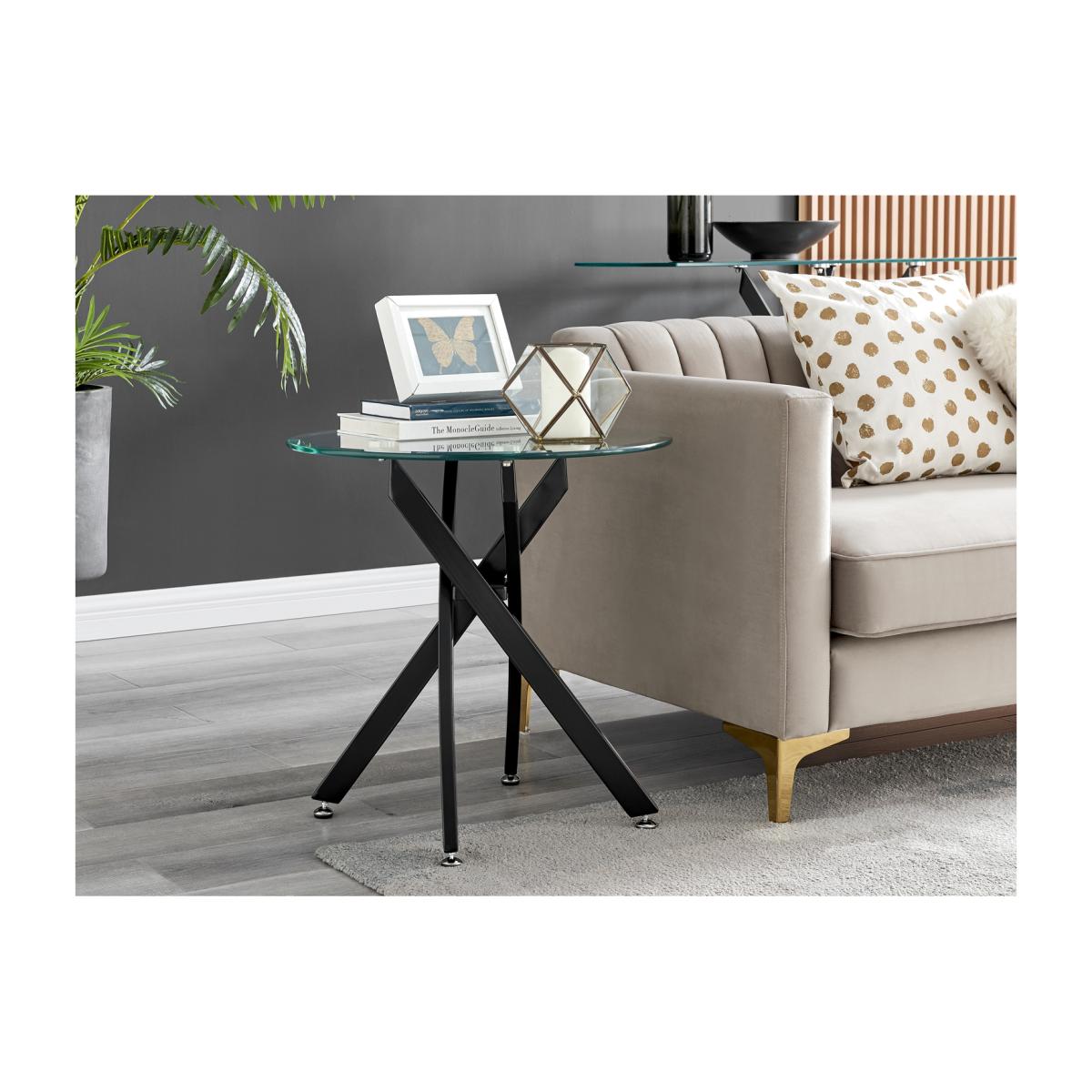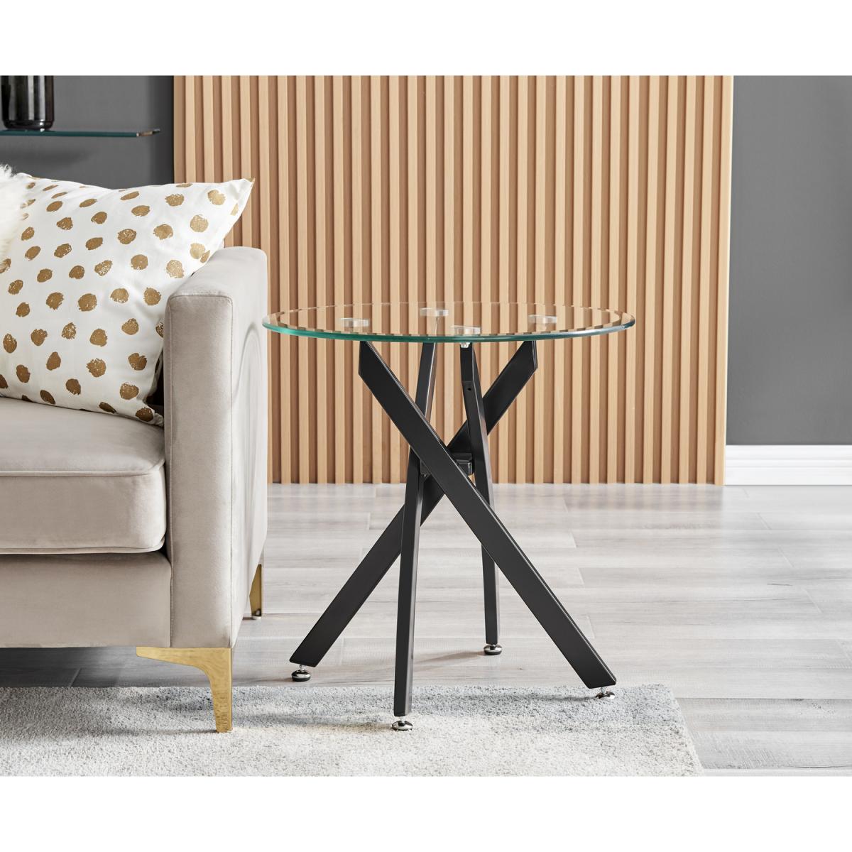 Our Novara round glass side table is effortlessly chic. The design of the legs is industrial but the sleek black keeps it a minimalist and elegant modern side table. Coupled with the clear glass table top, it creates a lovely piece that's functional and will reflect the light to keep your living room bright and airy. An eye-catching feature without dominating your space. Part of our popular Novara range - you can pair up with one of our matching dining sets, or coffee tables. The table top is clear tempered safety glass. The metal legs are strong and sturdy enough to withstand everyday use without compromising on design.