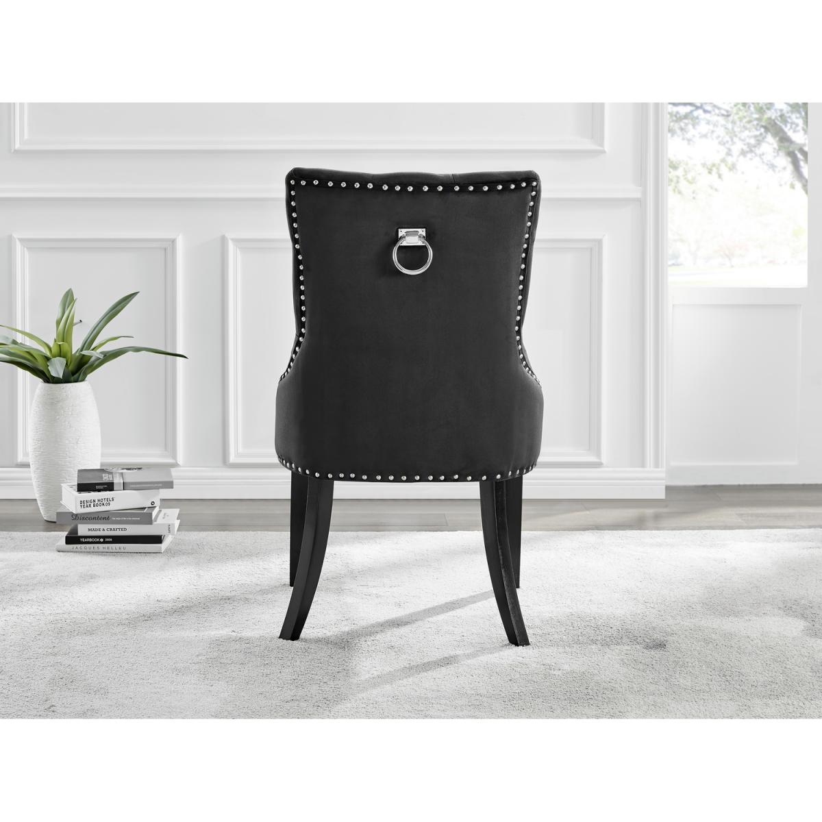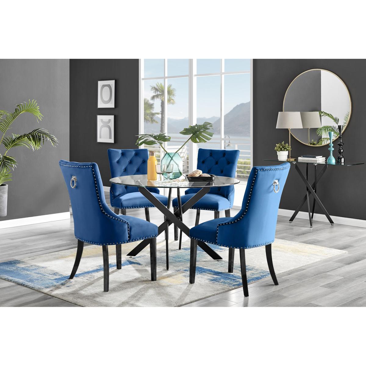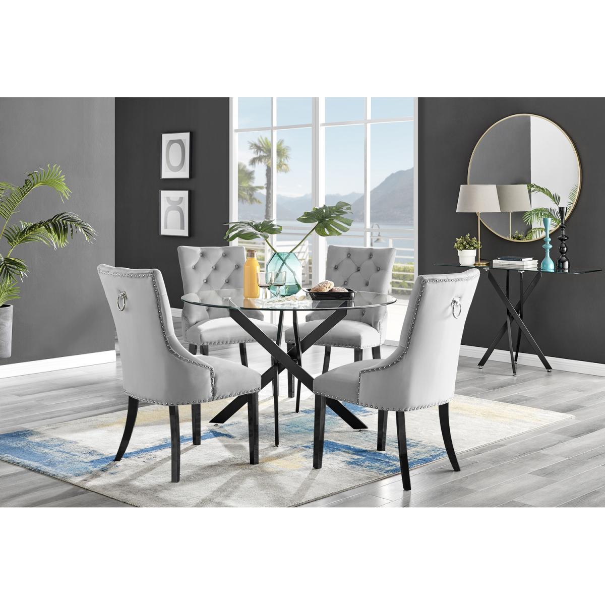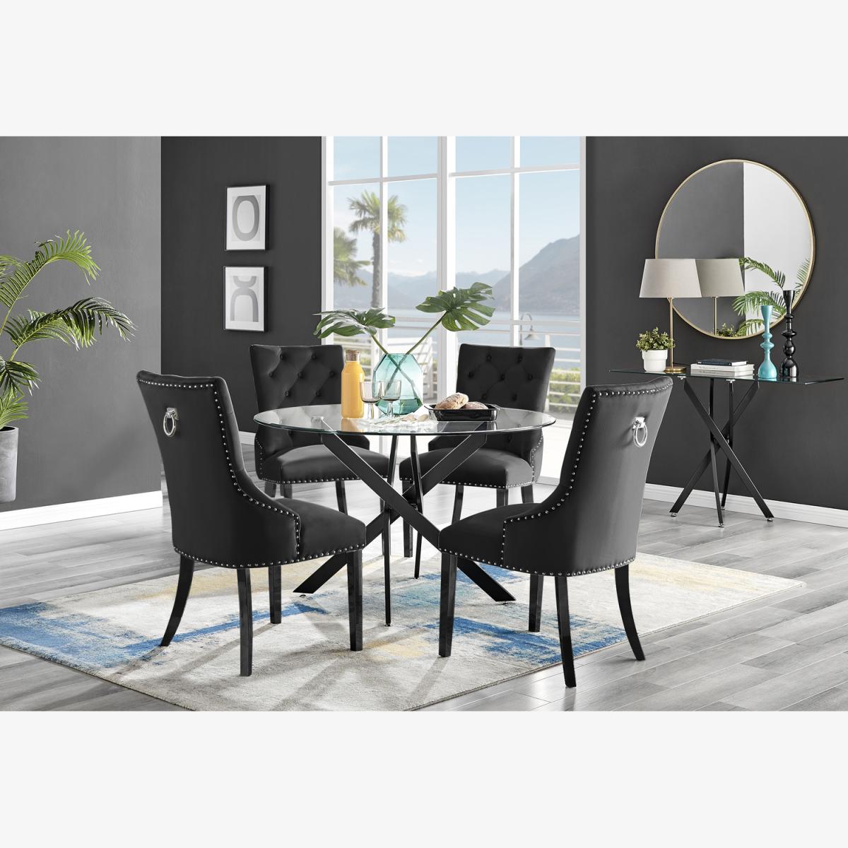 The strikingly elegant Novara dining table is a stylish and modern combination of black metal and glass, making this item a real eye-catcher. The sleek black legs provide strong and sturdy support for the table, whilst the unique intertwined nest design exudes modern style. This table really is capable of being a centrepiece in any home! With a generous 100x100cm surface, you can dine in style with up to 4 guests. The Belgravia knocker chair is the ultimate dining chair opulence with its scoop-back design that allows you and your guests to lean back and feel supported by the wrap-around arms. Stylish Chesterfield-inspired button tufting and diamond stitching add to the modern chic look. The design gives us straight lines and soft padded curves contemporary and comfortable. The thick-filled seat cushion is supportive and comfortable and is complemented by the silk grey velvet fabric. These ultra-modern chairs have subtle chrome button detailing along the trim of the seat and around the back of the chair which compliments beautifully the black legs and knocker. The highlight of the Belgravia chair is the chrome knocker on the back of the chair which is a popular feature for both modern and traditional dining rooms. Anyone for a lovely dinner party or some cocktails sat in one of these! We're in love!