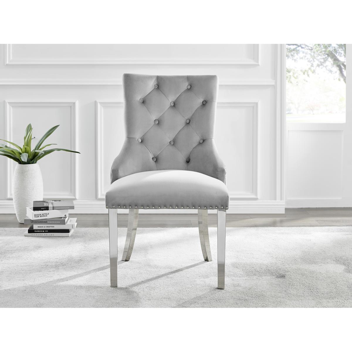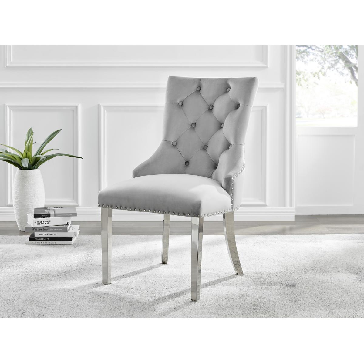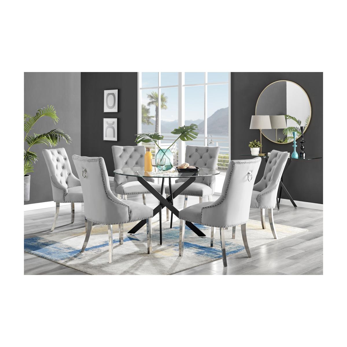 The strikingly elegant Novara dining table is a stylish and modern combination of black metal and glass, making this item a real eye-catcher. The sleek black legs provide a strong and sturdy support for the table, whilst the unique intertwined nest design exude modern style. This table really is capable of being a centre piece in any home! With a generous 120x120cm surface you can dine in style with up to 6 guests. The opulent Belgravia chairs provide a touch of luxury, with thickly padded velvet upholstery, and a striking knockerback detail. Anyone for a lovely dinner party or some cocktails.
