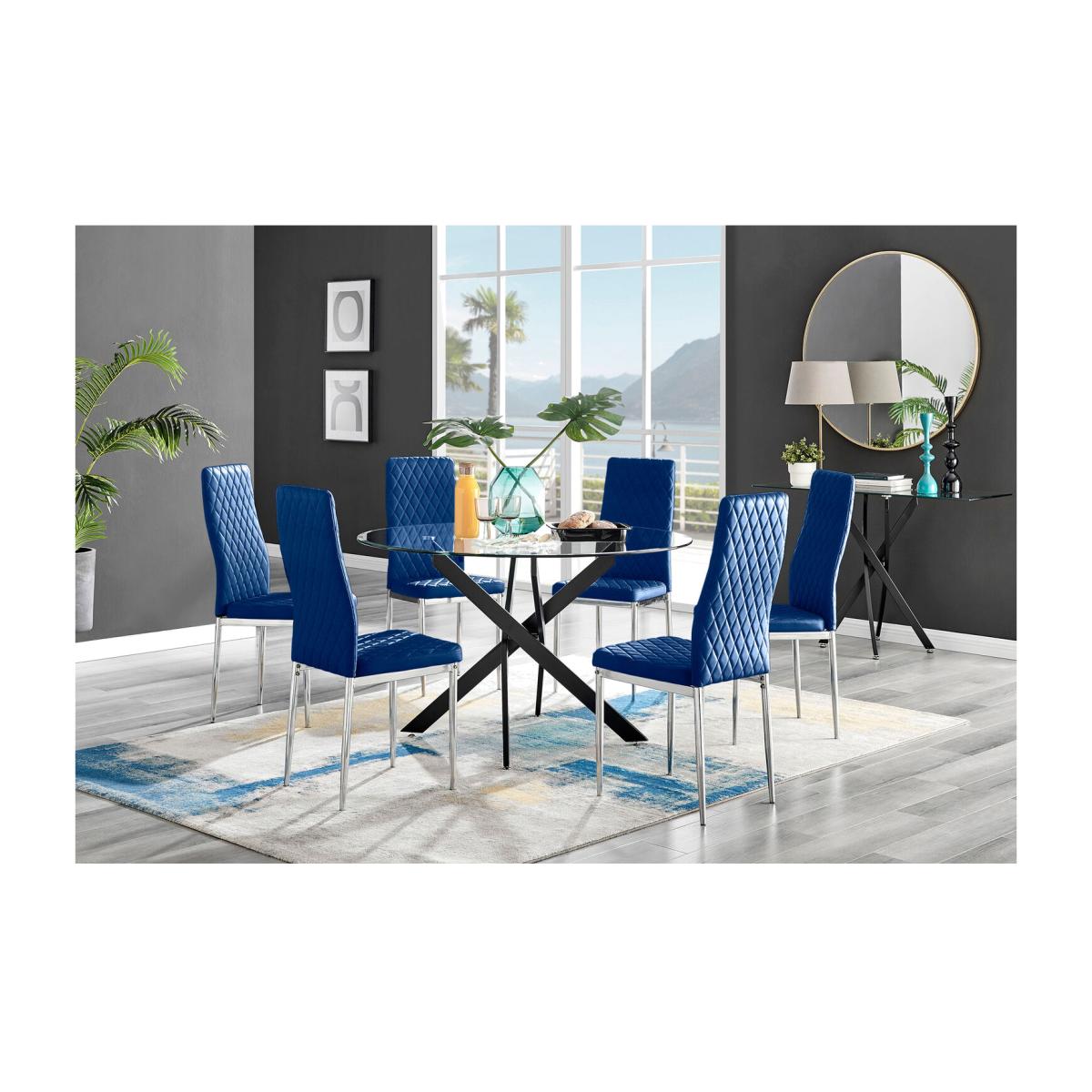 The strikingly elegant Novara dining table is a stylish and modern combination of black metal and glass, making this item a real eye catcher. The sleek black legs provide a strong and sturdy support for the table, whilst the unique intertwined nest design exude modern style. This table really is capable of being a centre piece in any home! With a generous 120x120cm surface you can dine in style with up to 6 guests. Upholstered in soft touch navy blue velvet and finished with diamond pattern stitching the Milan dining chairs would seamlessly fit in with most dining spaces, whilst not compromising on either style or comfort. The stylish shiny chrome silver leg and hatched velvet combination gives this chair a contemporary edge, whilst it's simple design allows for practical everyday usage. The chairs are made from high quality durable velvet that's easy to keep clean and are ergonomically designed for maximum comfort and support. They feature a deep foam seat cushion and plastic feet to protect the floor from any damage! At an unbeatable price you cannot go wrong with these chairs!