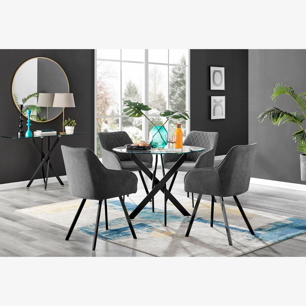 The strikingly elegant Novara dining table is a stylish and modern combination of black metal and glass, making this item a real eye catcher. The sleek black legs provide a strong and sturdy support for the table, whilst the unique intertwined nest design exude modern style. This table really is capable of being a centre piece in any home! With a generous 100x100cm surface you can dine in style with up to 4 guests. The Falun dining chair is a modern carver chair design with quilted diamond stitching to the inside. Comfortable and super-stylish, with postmodern midcentury touches, the chair's combination of curves and straight lines keeps it fresh and eyecatching. Sat on elegant angled legs, this chair will suit any modern decor. These modern dining chairs are upholstered in a dark grey fabric to add depth and texture to the design. The black powder coated metal legs have a matte effect which adds an industrial design to these contemporary dining chairs.