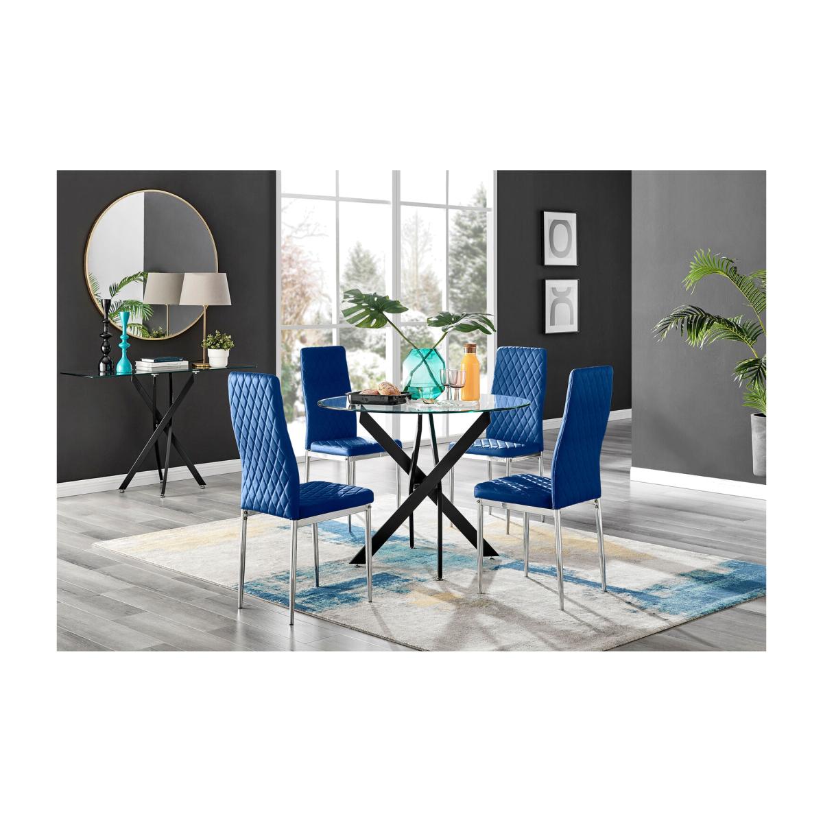 The strikingly elegant Novara dining table is a stylish and modern combination of black metal and glass, making this item a real eye catcher. The sleek black legs provide a strong and sturdy support for the table, whilst the unique intertwined nest design exude modern style. This table really is capable of being a centre piece in any home! With a generous 100x100cm surface you can dine in style with up to 4 guests. Upholstered in soft touch navy blue velvet and finished with diamond pattern stitching the Milan dining chairs would seamlessly fit in with most dining spaces, whilst not compromising on either style or comfort. The stylish shiny chrome silver leg and hatched velvet combination gives this chair a contemporary edge, whilst it's simple design allows for practical everyday usage. The chairs are made from high quality durable velvet that's easy to keep clean and are ergonomically designed for maximum comfort and support. They feature a deep foam seat cushion and plastic feet to protect the floor from any damage! At an unbeatable price you cannot go wrong with these chairs!