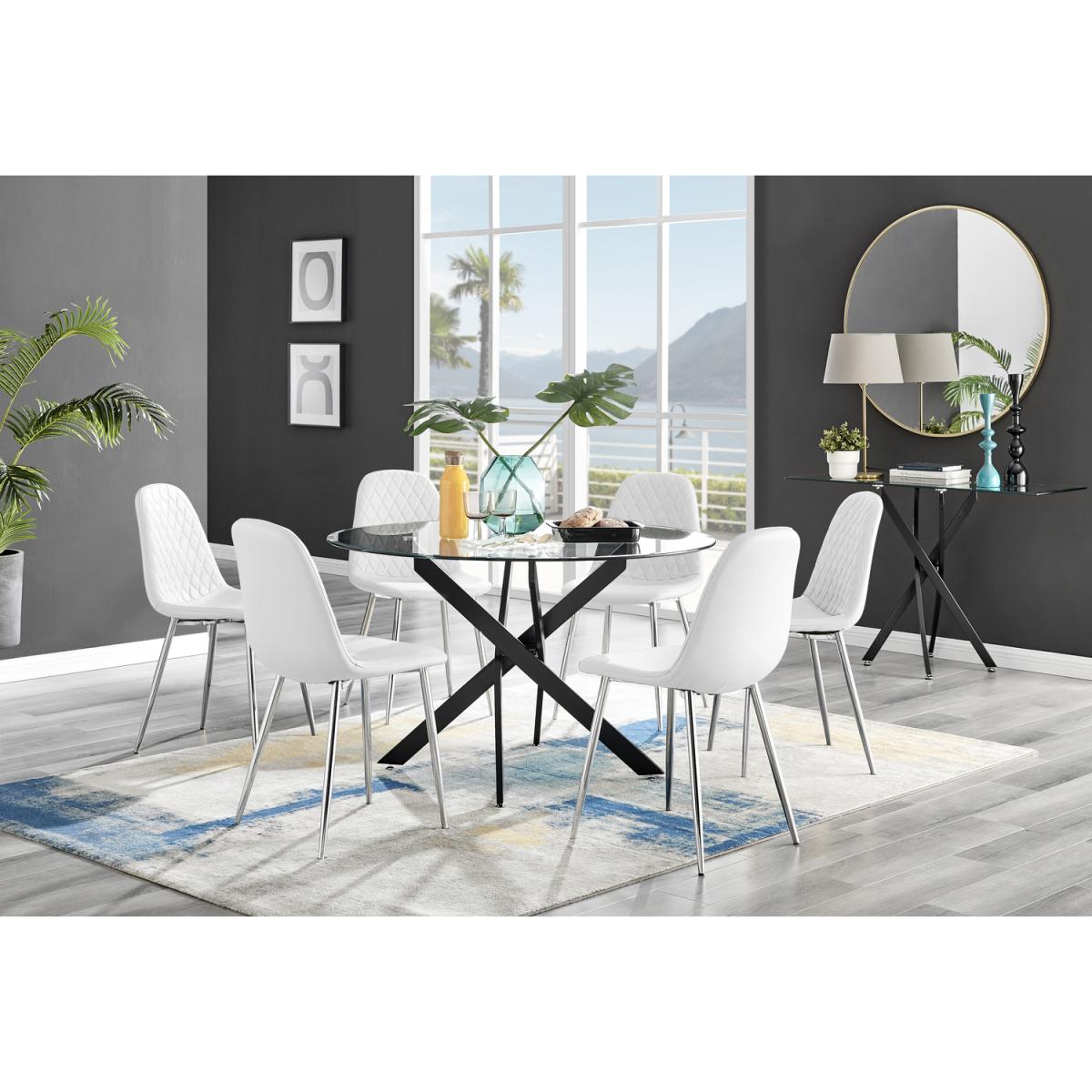 The strikingly elegant Novara dining table is a stylish and modern combination of black metal and glass, making this item a real eye-catcher. The sleek black legs provide strong and sturdy support for the table, whilst the unique intertwined nest design exudes modern style. This table is capable of being a centrepiece in any home! With a generous 120x120cm surface, you can dine in style with up to 6 guests. Styled with our statement Corona chairs, this set is a perfect balance of pattern and texture. The sleek chrome effect legs add an accent of lustre to your home. The Scandi-style faux leather seat with diamond pattern stitching is a unique take on a classic design offering comfort and durability for everyday use.