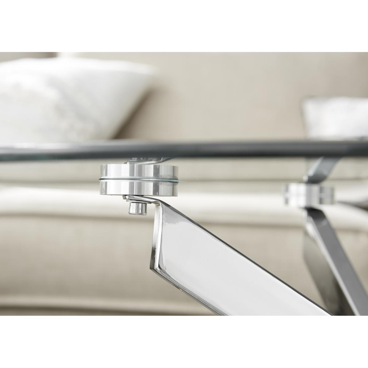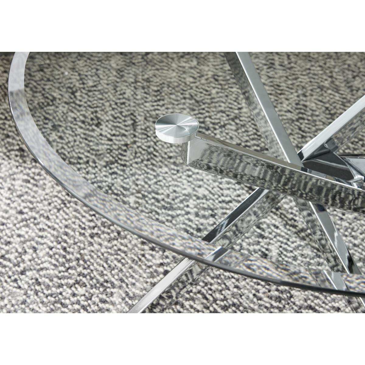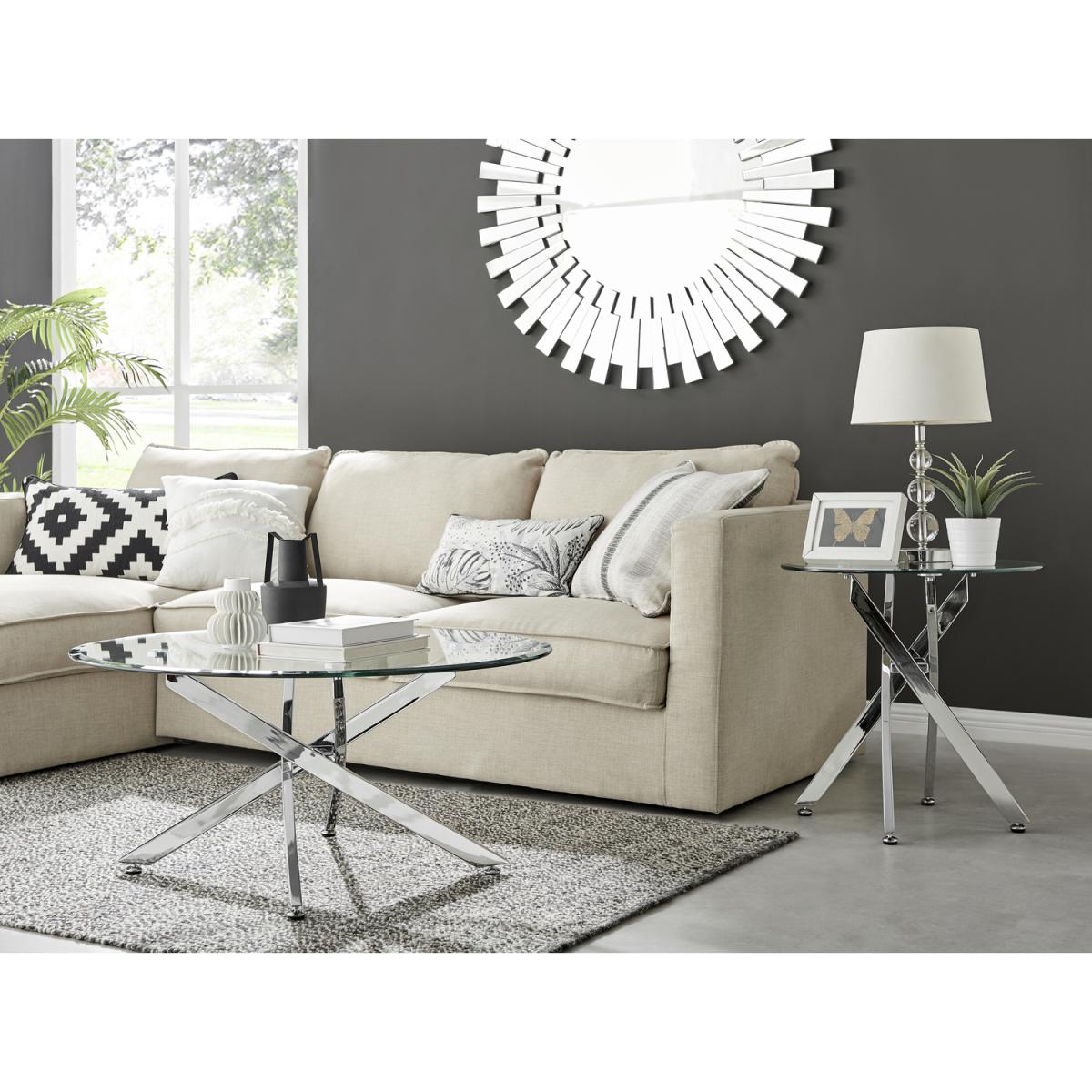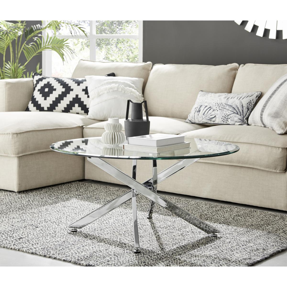 Our Novara round glass coffee table is effortlessly chic. The design of the legs is industrial but the bright chrome keeps it a minimalist and elegant modern coffee table. Coupled with the clear glass table top, it creates a lovely piece that's functional and will reflect the light to keep your living room bright and airy. An eye-catching feature without dominating your space. Part of our popular Novara range - you can pair up with one of our matching dining sets, or side tables. Also available with gold metal legs. The table top is clear tempered safety glass. The legs are chrome metal that are strong and sturdy enough to withstand everyday use without compromising on design.