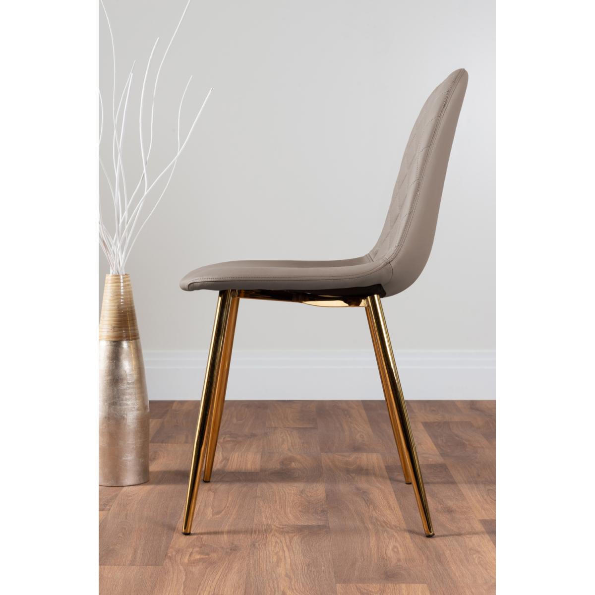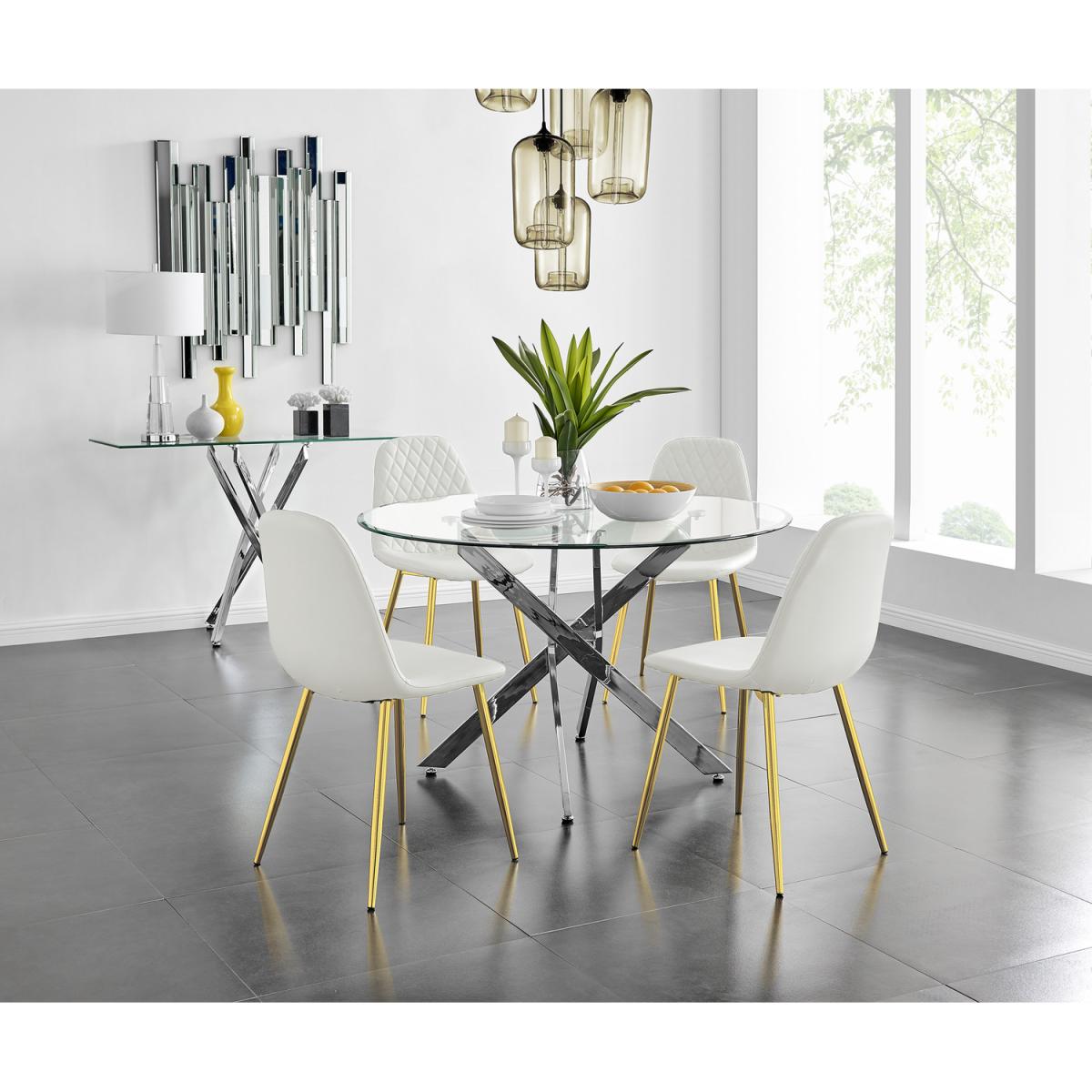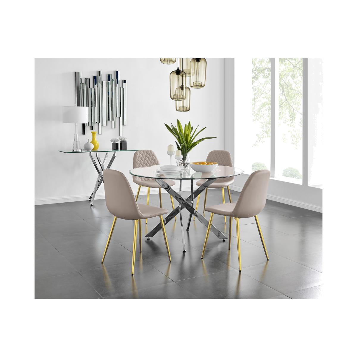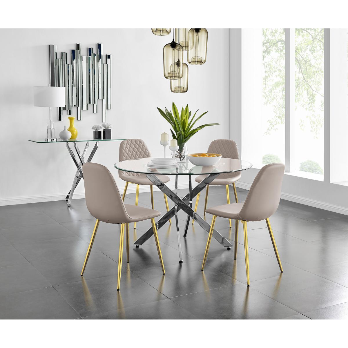 The strikingly elegant Novara dining table is a stylish and modern combination of chrome metal and glass, making this item a real eye-catcher. The chrome metal legs provide strong and sturdy support for the table, whilst the unique intertwined nest design exudes modern style. This table really is capable of being a centrepiece in any home! With a generous 120x120cm surface, you can dine in style with up to 6 guests. With a perfect balance of pattern and texture, the new Corona Chairs tie off this set nicely. The trendy gold legs are all the rage and offer a perfect way to add an accent of lustre to your home. The Scandi-style faux leather seat with diamond pattern stitching is a unique take on a classic design offering comfort and durability for everyday use.