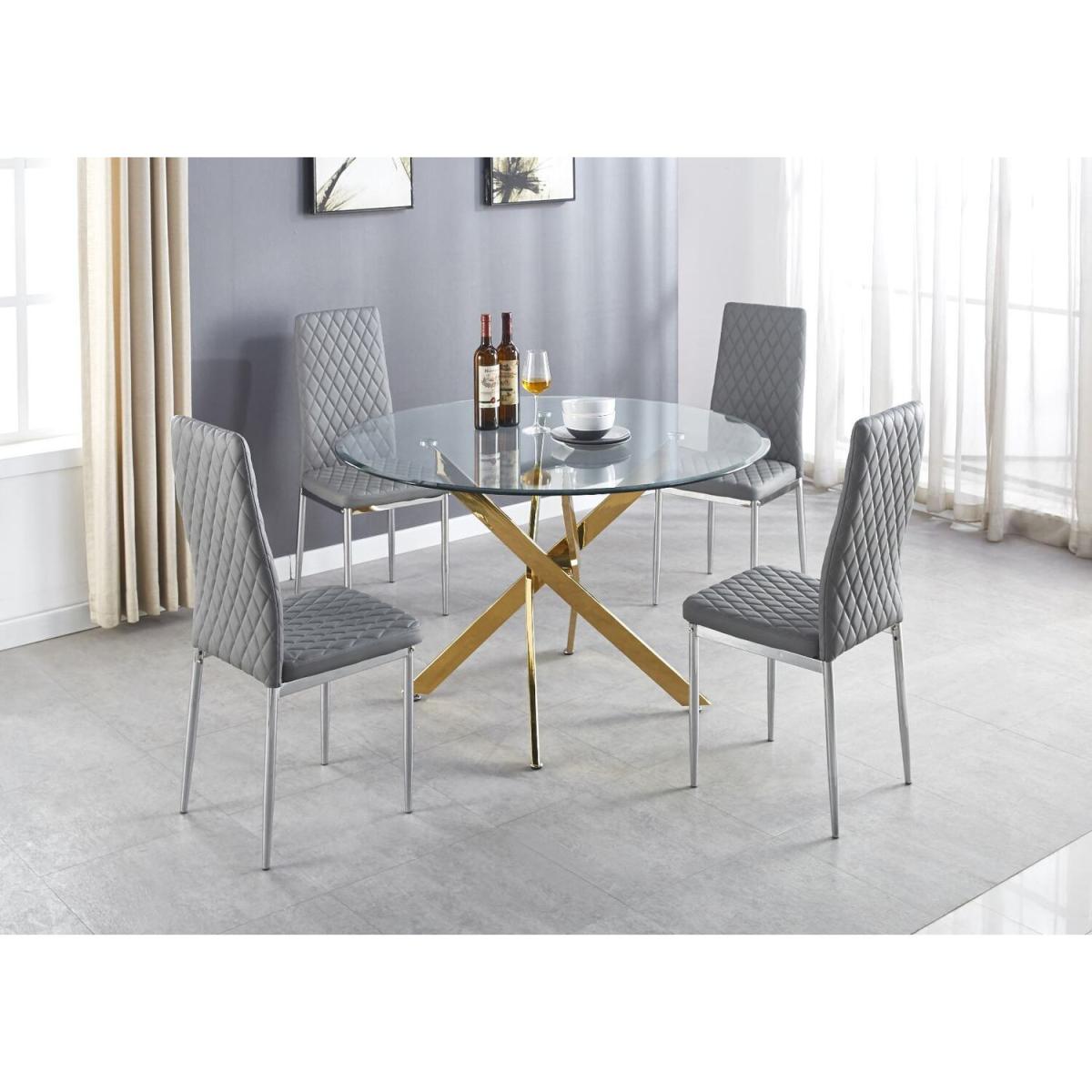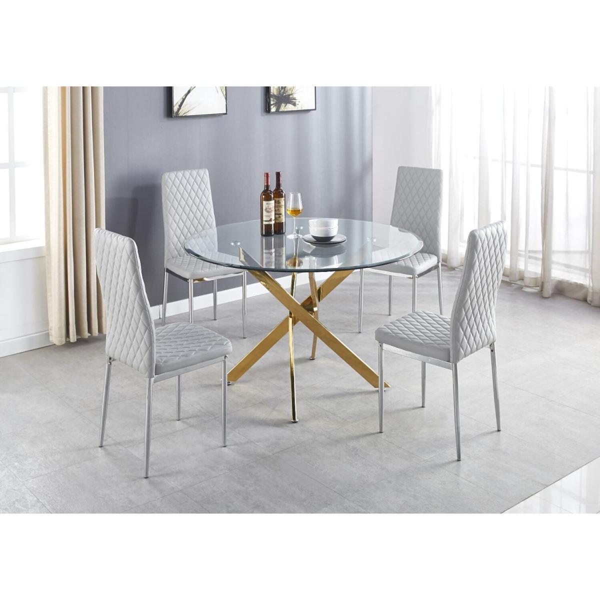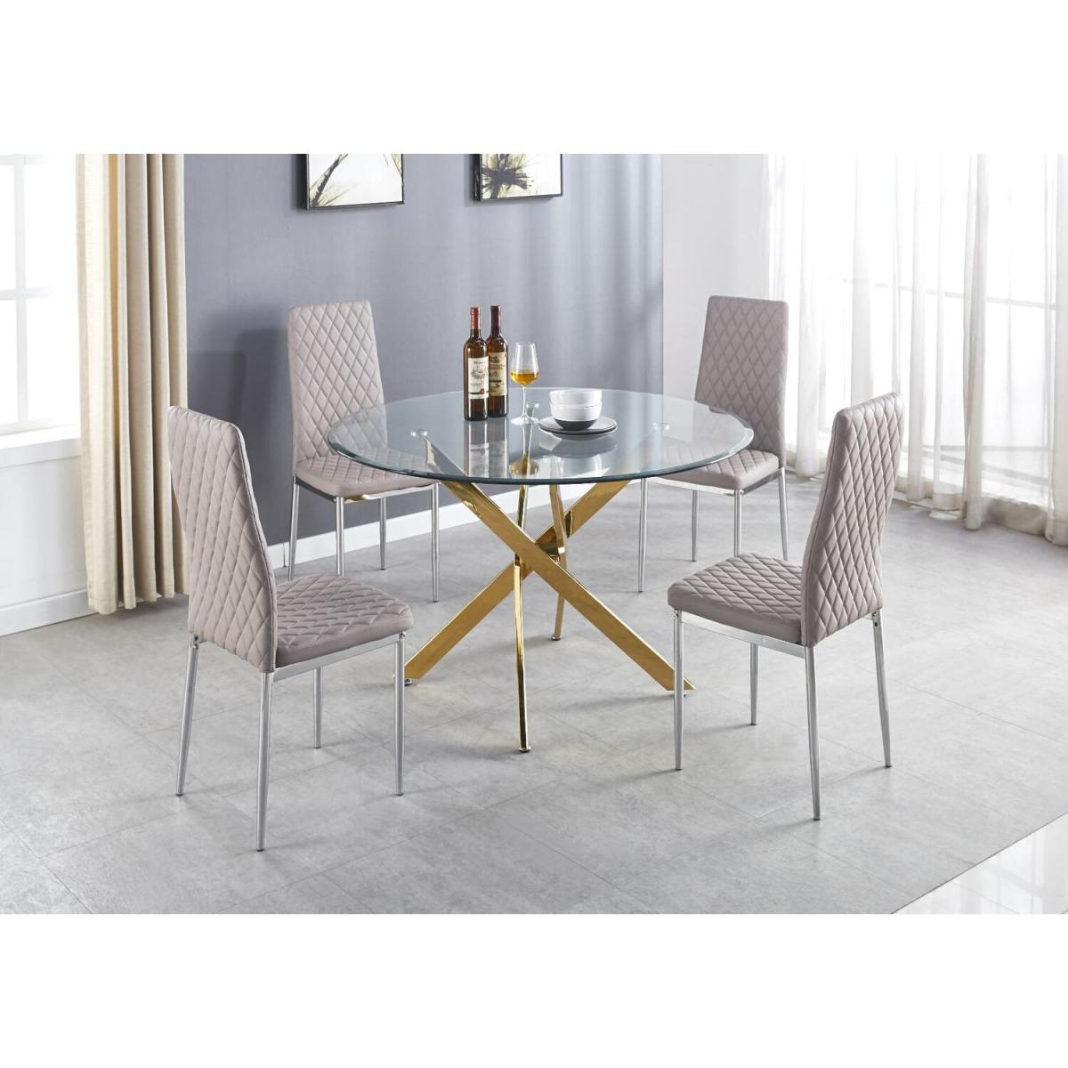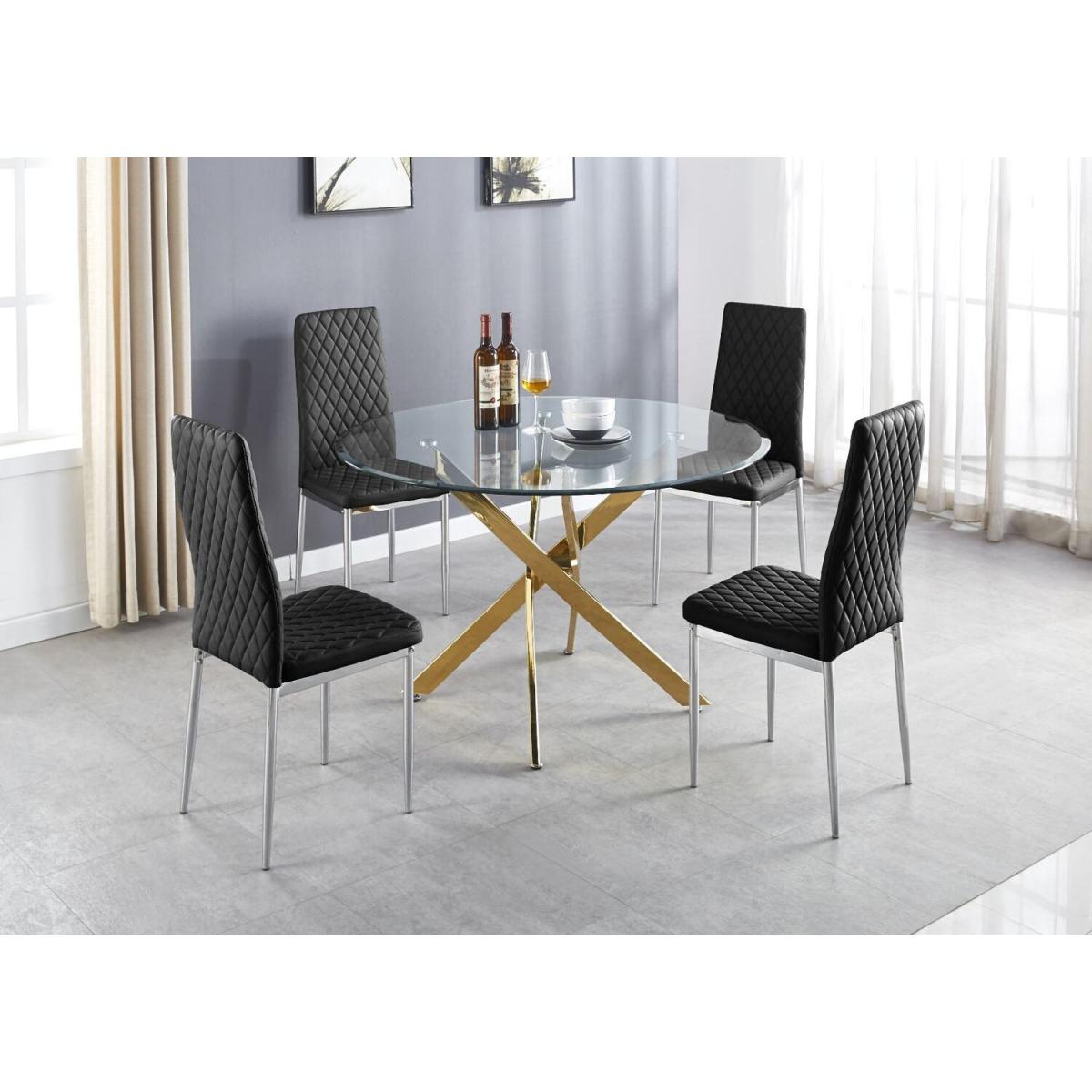 The strikingly elegant Novara dining table is a stylish and modern combination of gold metal and glass, making this item a real eye-catcher. The gold metal legs provide a strong and sturdy support for the table, whilst the unique intertwined nest design exude modern style. This table really is capable of being a centrepiece in any home! With a generous 120x120cm surface you can dine in style with up to 6guests. Paired alongside our beautiful faux leather diamond quilted Milan chairs, you can't go wrong with this set. The chairs are made from high-quality faux leather and are ergonomically designed for maximum comfort and support. They feature soft touch faux leather with a deep foam seat cushion and plastic feet to protect the floor from any damage! With a real designer look alongside a feeling of luxury, just without the expensive price tag, this set is perfect for any dining space.