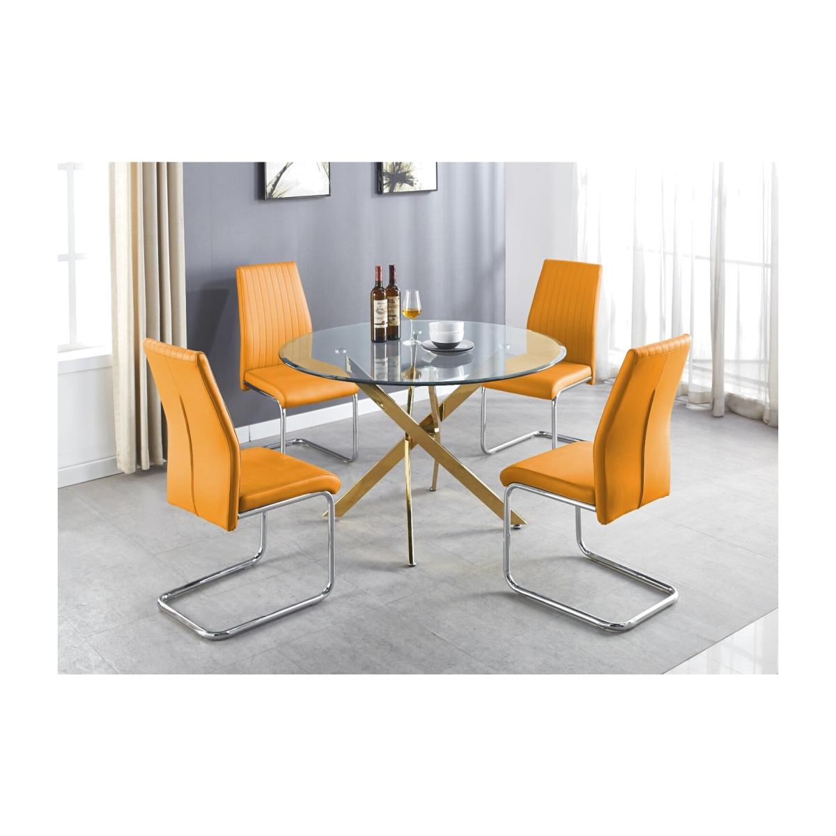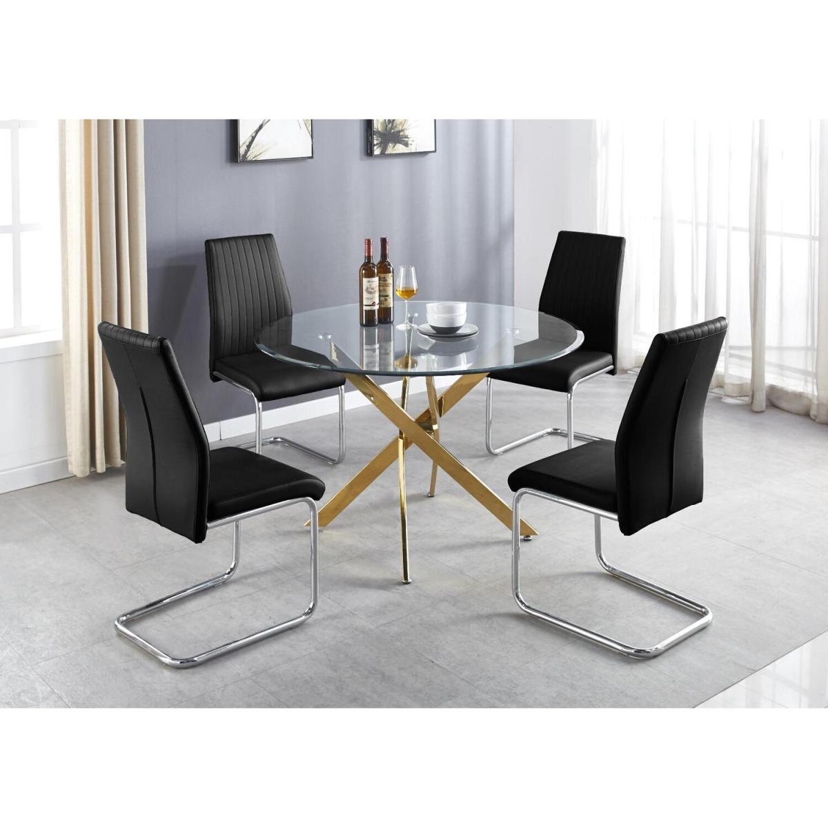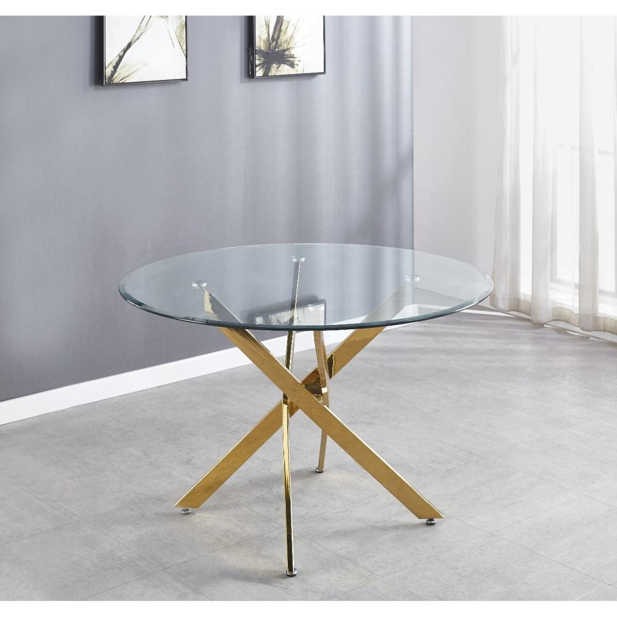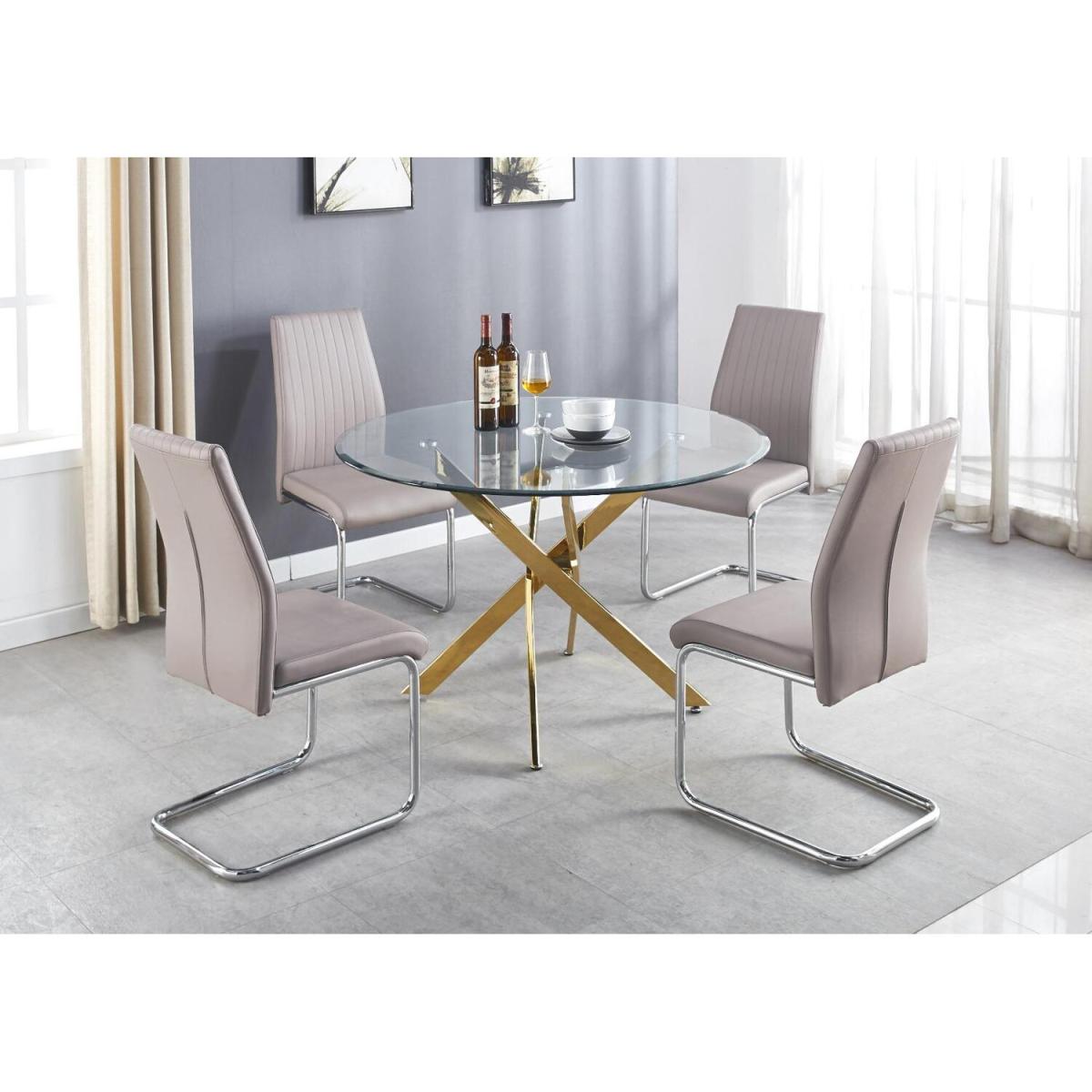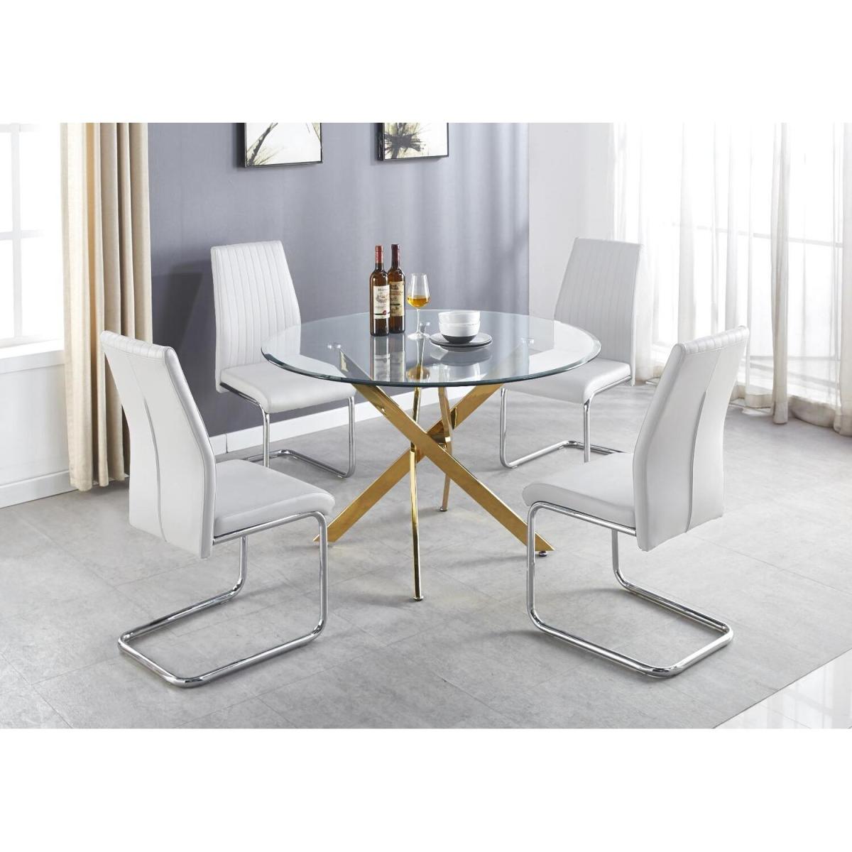 The strikingly elegant Novara dining table is a stylish and modern combination of gold metal and glass, making this item a real eye-catcher. The gold metal legs provide strong and sturdy support for the table, whilst the unique intertwined nest design exudes modern style. This table is capable of being a centrepiece in any home! With a generous 120x120cm surface, you can dine in style with up to 6 guests. With a perfect balance of pattern and texture, the new Corona Chairs tie off this set nicely. The trendy gold legs are all the rage and offer a perfect way to add an accent of lustre to your home. The Scandi-style faux leather seat with diamond pattern stitching is a unique take on a classic design offering comfort and durability for everyday use.