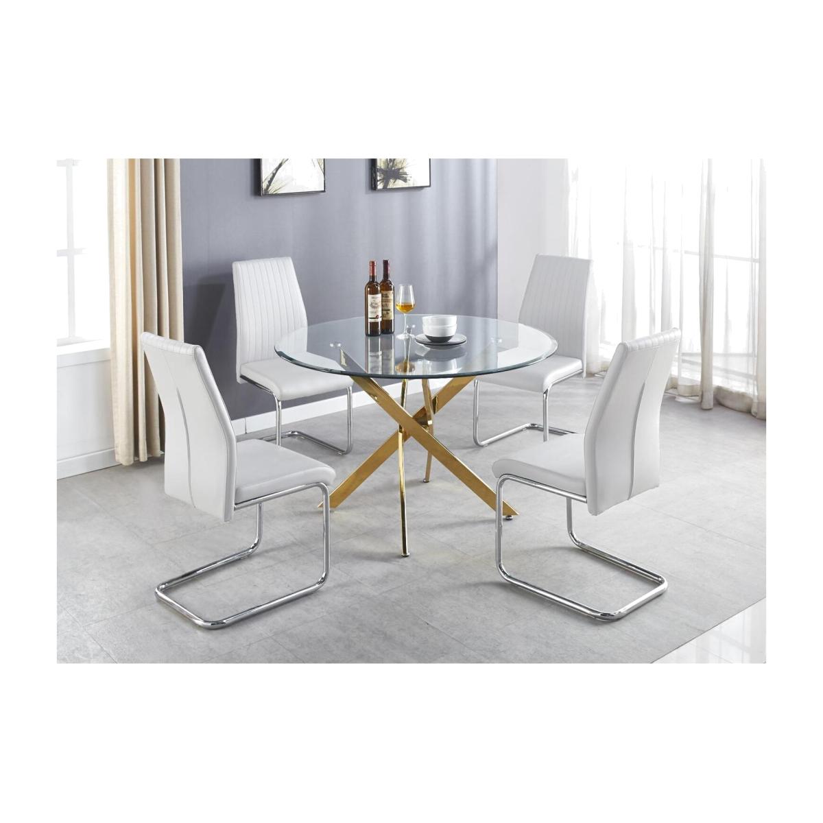 The strikingly elegant Novara dining table is a stylish and modern combination of gold metal and glass, making this item a real eye-catcher. The gold metal legs provide strong and sturdy support for the table, whilst the unique intertwined nest design exudes modern style. This table is capable of being a centrepiece in any home! With a generous 120x120cm surface, you can dine in style with up to 6 guests. With a perfect balance of pattern and texture, the new Corona Chairs tie off this set nicely. The trendy gold legs are all the rage and offer a perfect way to add an accent of lustre to your home. The Scandi-style faux leather seat with diamond pattern stitching is a unique take on a classic design offering comfort and durability for everyday use.