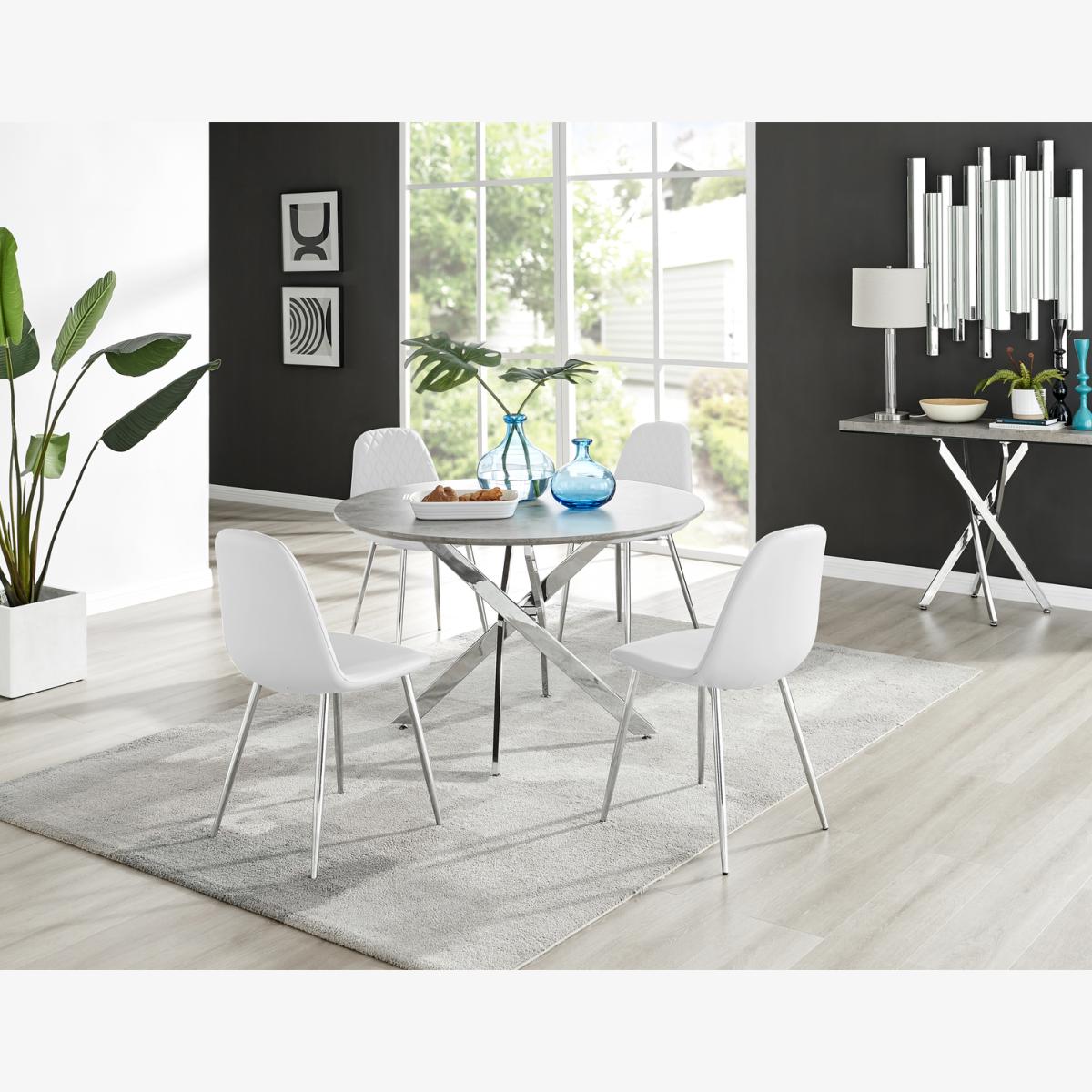 Our popular Novara round dining table here combines a super modern concrete effect tabletop with shiny silver chrome legs in an eye-catching nested starburst design. A sleek and minimalist dinner table that will bounce light around your dining area and create a sense of space. At 100cm across, this table is perfect for smaller spaces and more intimate, relaxed dining. At 120cm across, this table will comfortably seat up to 6, with round tables also being great for more intimate, relaxed dining and smaller spaces. The strong metal legs not only make this table a real central feature for your room but keep it sturdy. The grey concrete effect veneer is very on-trend right now and easy to wipe clean too, meaning your Novara will stay looking great for years to come. With a perfect balance of pattern and texture the new Corona Chair is a statement piece ready for the modern dining space. The trendy chrome legs are all the rage and offer a perfect way to add an accent of lustre to your home. The Scandi-style faux leather seat with diamond pattern stitching is a unique take on a classic design offering comfort and durability for everyday use.