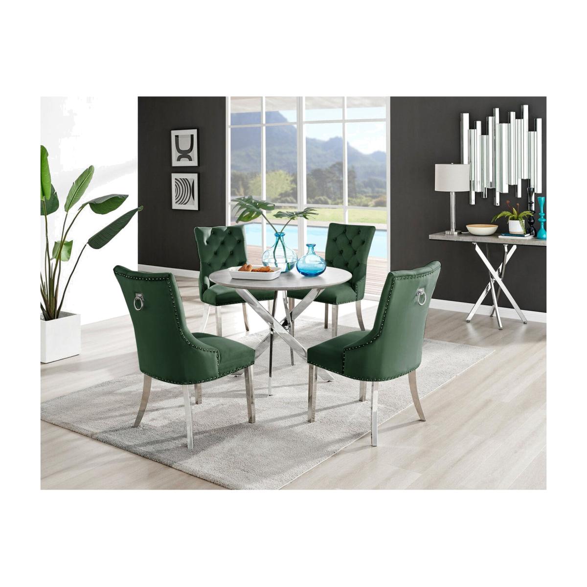 Our popular Novara round dining table here combines a super modern concrete effect tabletop with shiny silver chrome legs in an eye-catching nested starburst design. A sleek and minimalist dinner table that will bounce light around your dining area and create a sense of space. At 100cm across, this table is perfect for smaller spaces and more intimate, relaxed dining. Seats 2 - 4, making this a great family table that will suit any modern home. The Belgravia knocker chair is the ultimate in dining chair opulence with its scoop back design that allows you and your guests to lean back and feel supported by the wrap-around arms. Stylish Chesterfield-inspired button tufting and diamond stitching add to the modern chic look. The design gives us straight lines and soft padded curves contemporary and comfortable.