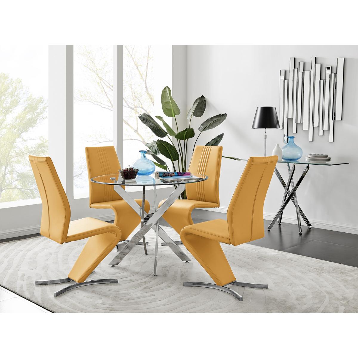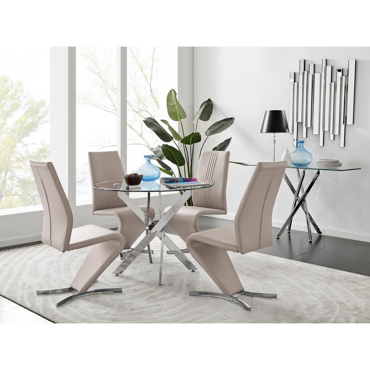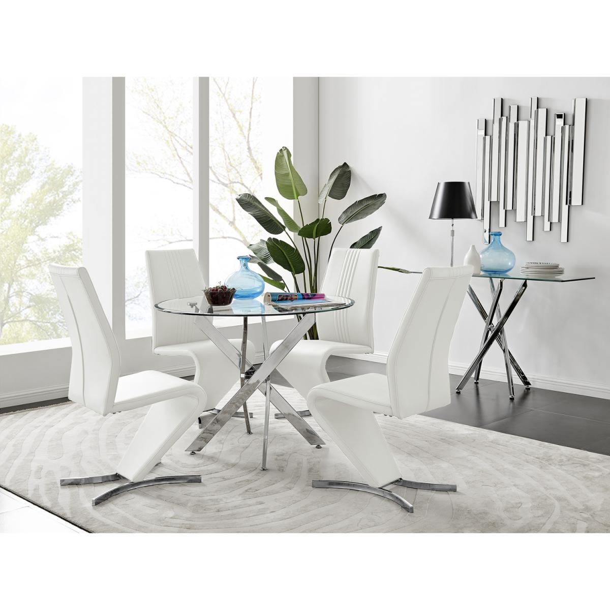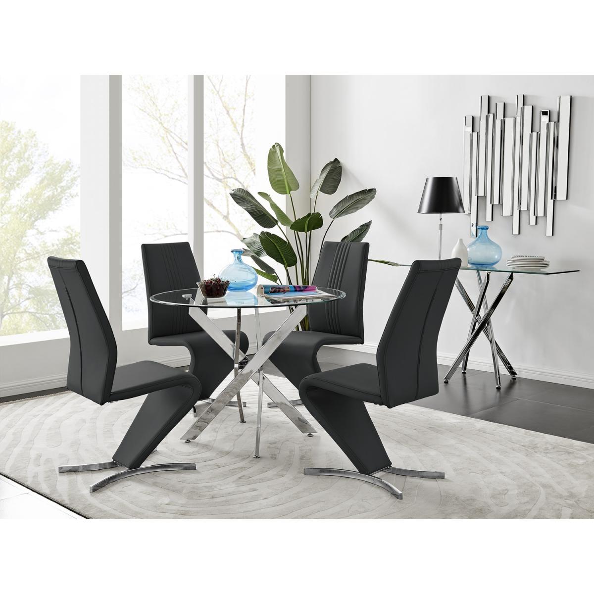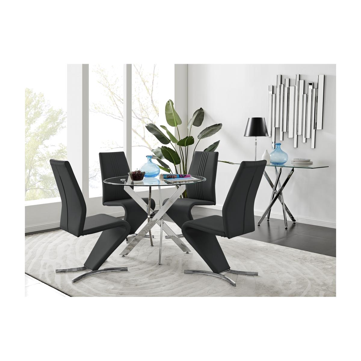 The strikingly elegant Novara dining table is a stylish and modern combination of chrome and glass, making this set a real eye-catcher. The chrome metal legs provide strong and sturdy support for the table, whilst the unique intertwined nest design exudes modern style. This table is capable of being a centrepiece in any home! With a generous 100x100cm surface, you can dine in style with up to 4 guests, and your guests won't want to leave once they relax in our stunning Willow chairs. The Willow is a premium modern chair that ticks all the boxes and perfectly complements the Novara table. They are comfortable, look incredible and exude quality. These eye-catching chairs are fully padded throughout and have an ergonomically designed back support to maximise comfort. They also feature half-moon chromed feet, which give the chairs a sturdy base. The curved design gives the Willow chair a contemporary elegance and finishes this stunning set off perfectly.